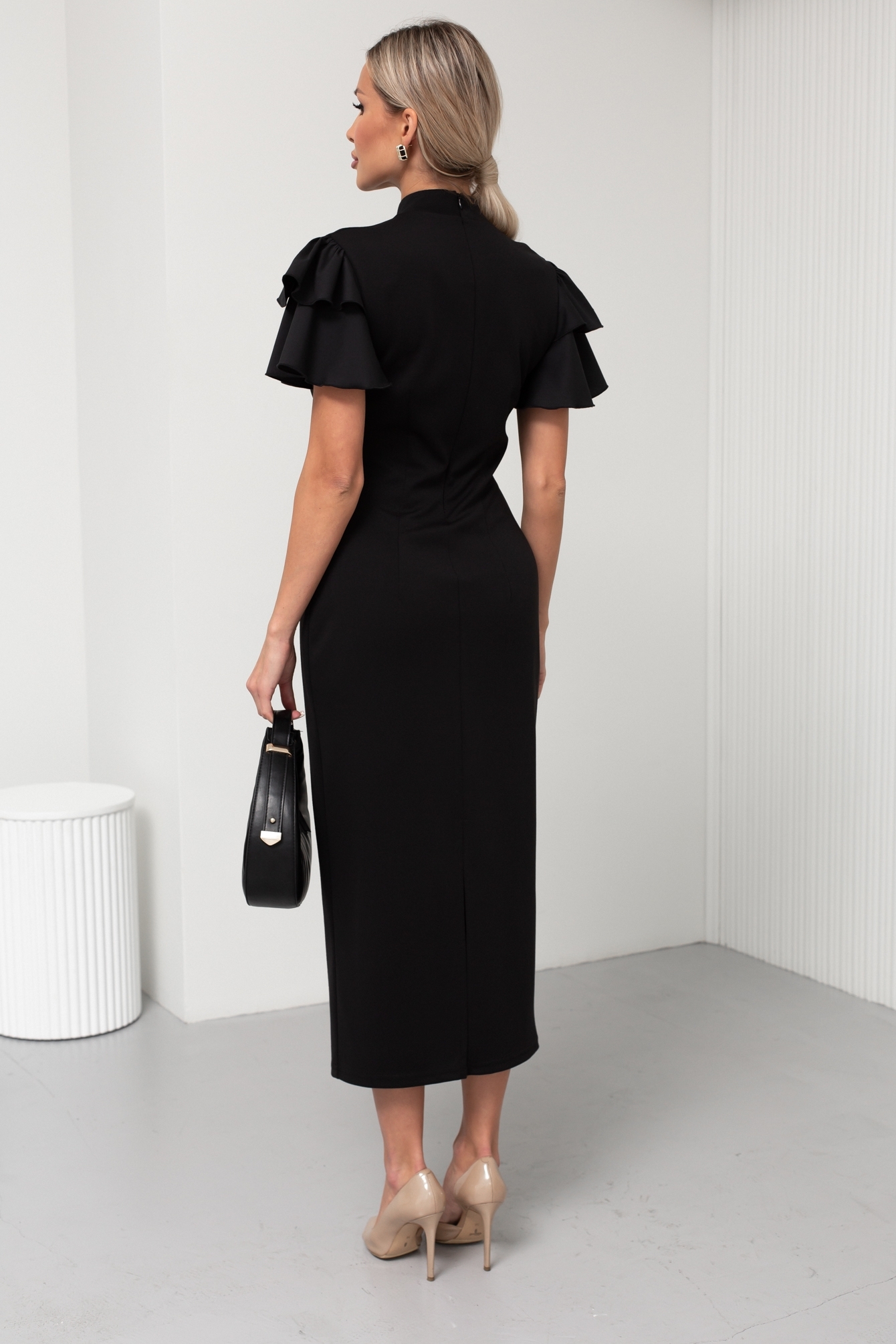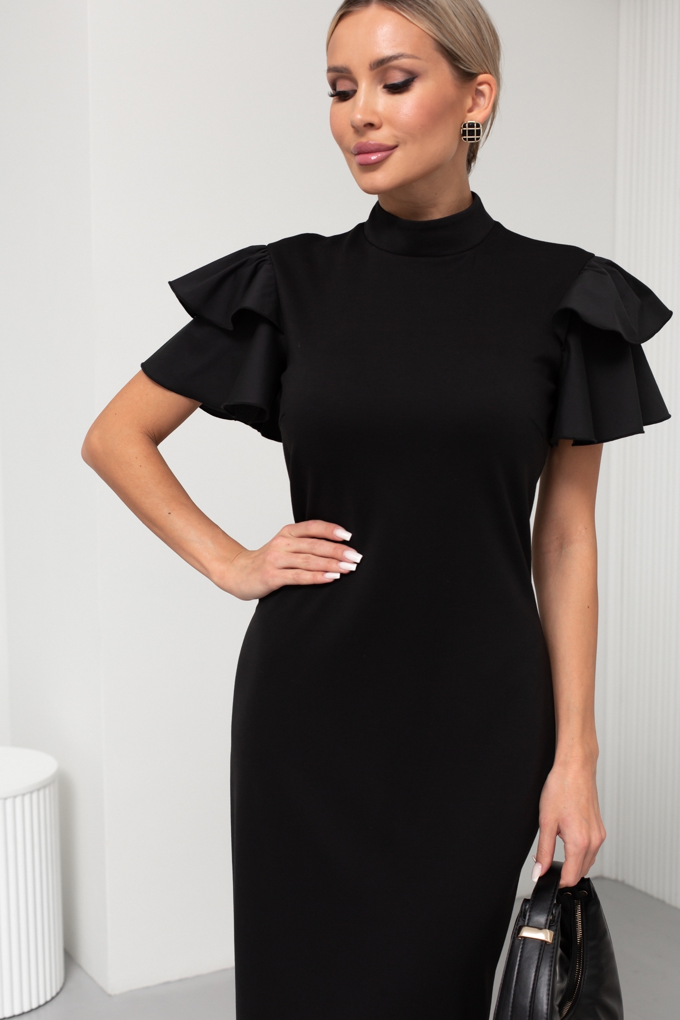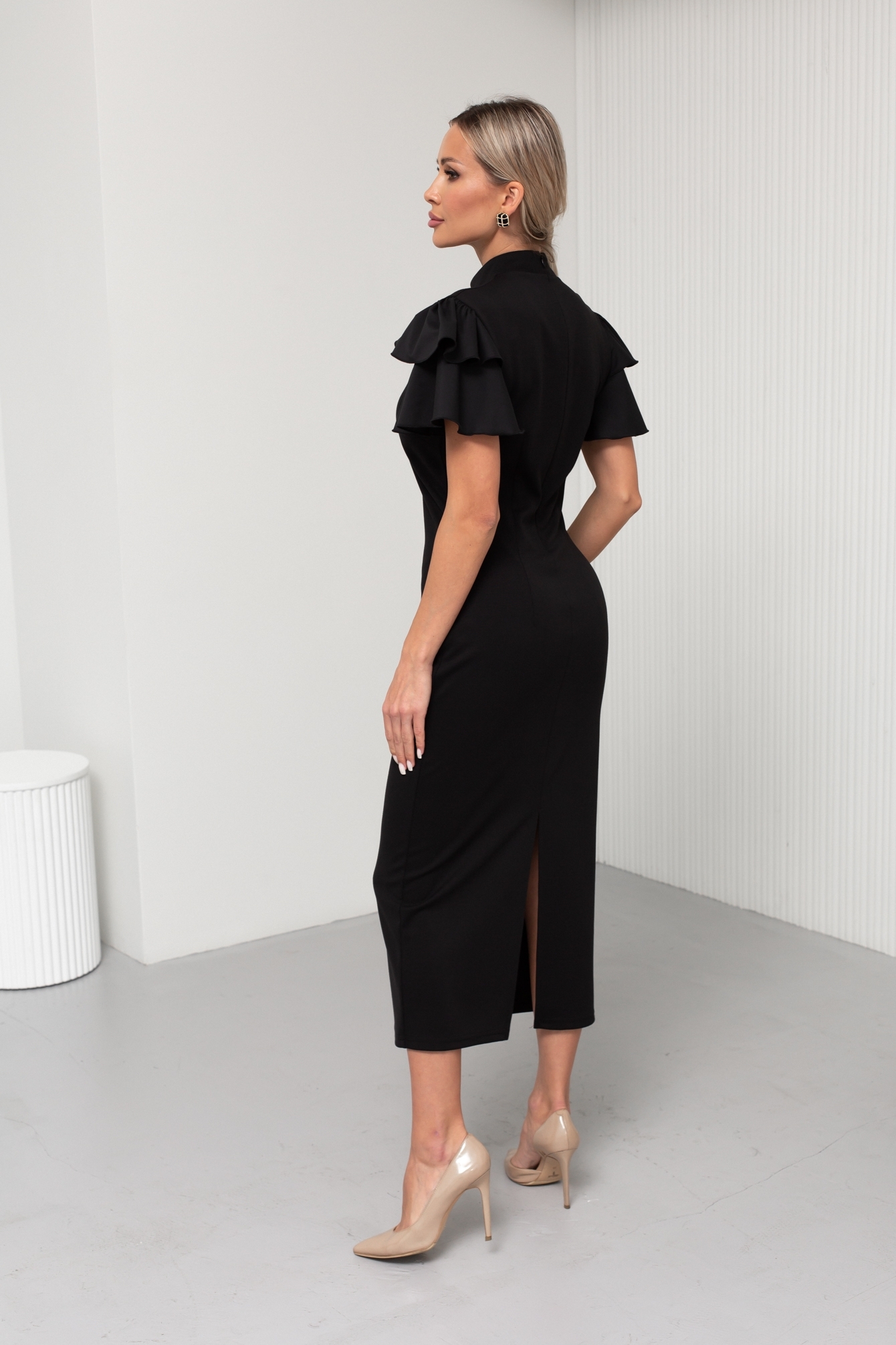 Элегантное платье прилегающего силуэта выполнено из однотонного трикотажного полотна. Горловина оформлена воротником - стойка. По среднему шву спинки застежка на потайную ленту - молнию. Короткие рукава - крылышки выполнены из хлопка. Низ ровный, сзади разрез.