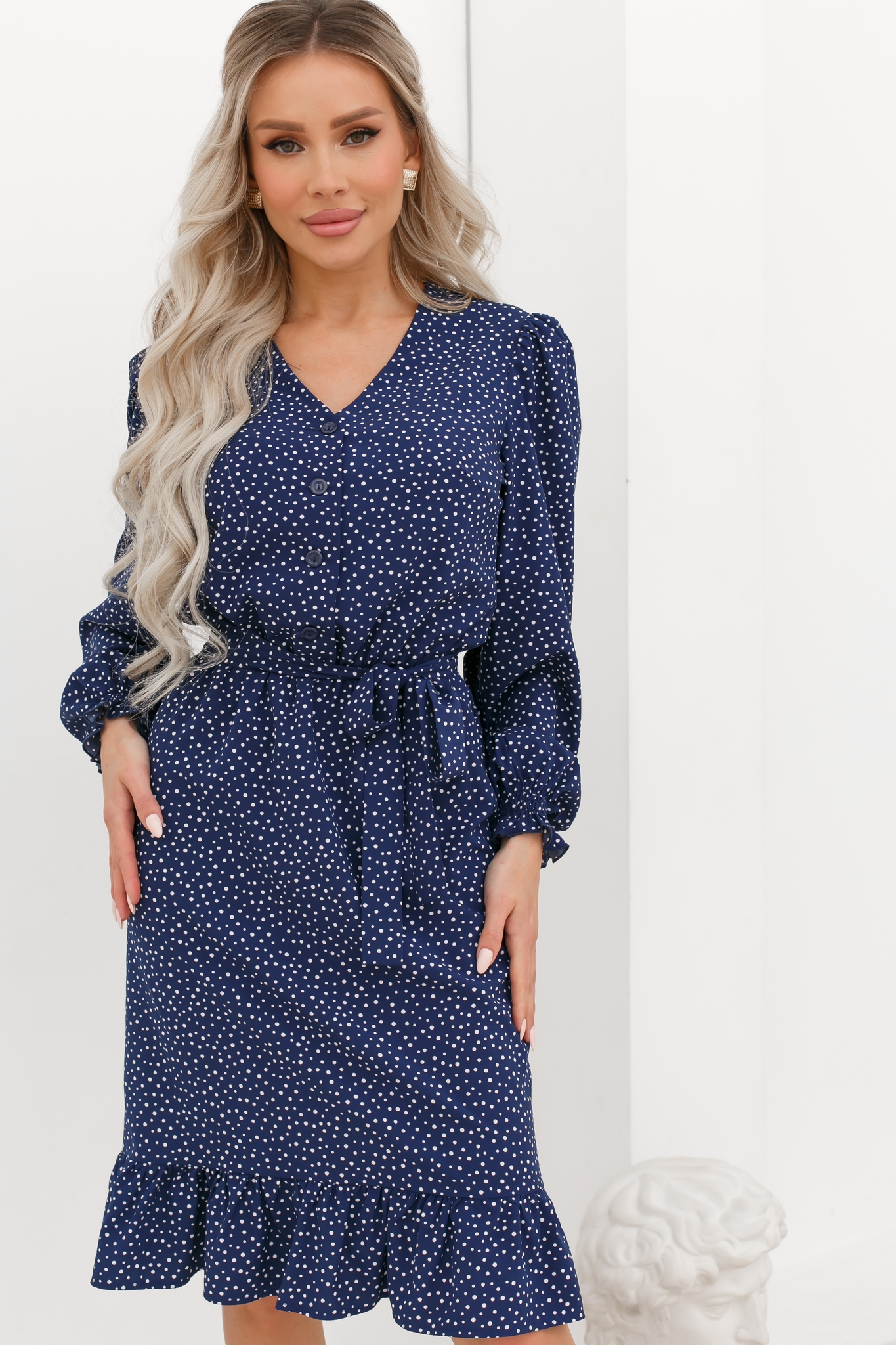Женственное платье приталенного силуэта. V - образная горловина на внутренней обтачке переходящей в планку с застежкой на петли и пуговицы. Длинный втачной рукав присборен на резинку. Модель отрезная по линии талии, на резинке. Низ оформлен воланом. Пояс из основного материала в комплекте.