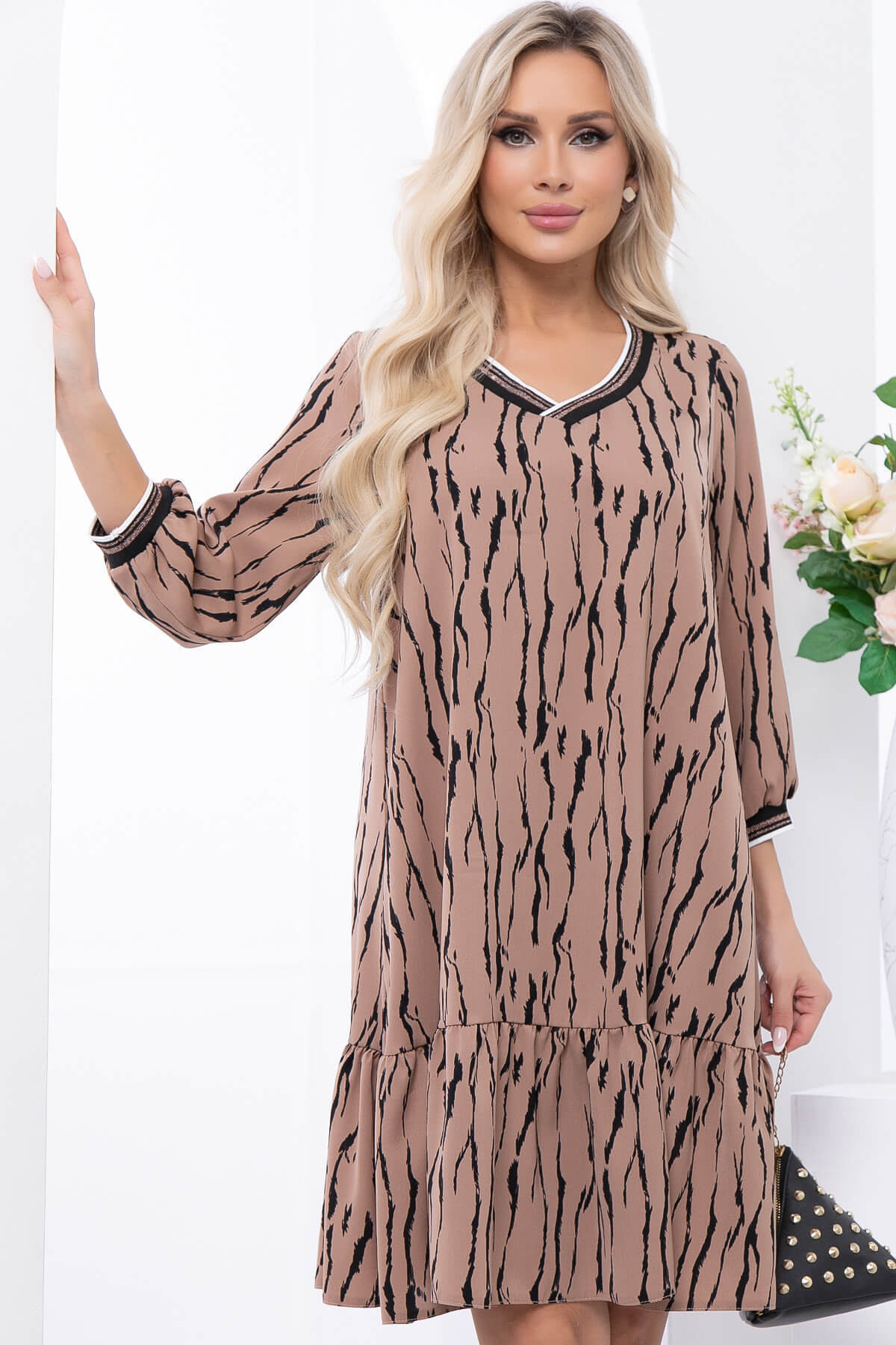 Платье свободного кроя изумительно смотрится как с каблучком, так и с кедами! Юбка с воланом по низу добавляет романтичности и воздушности образу. Рукав три четверти, втачной.