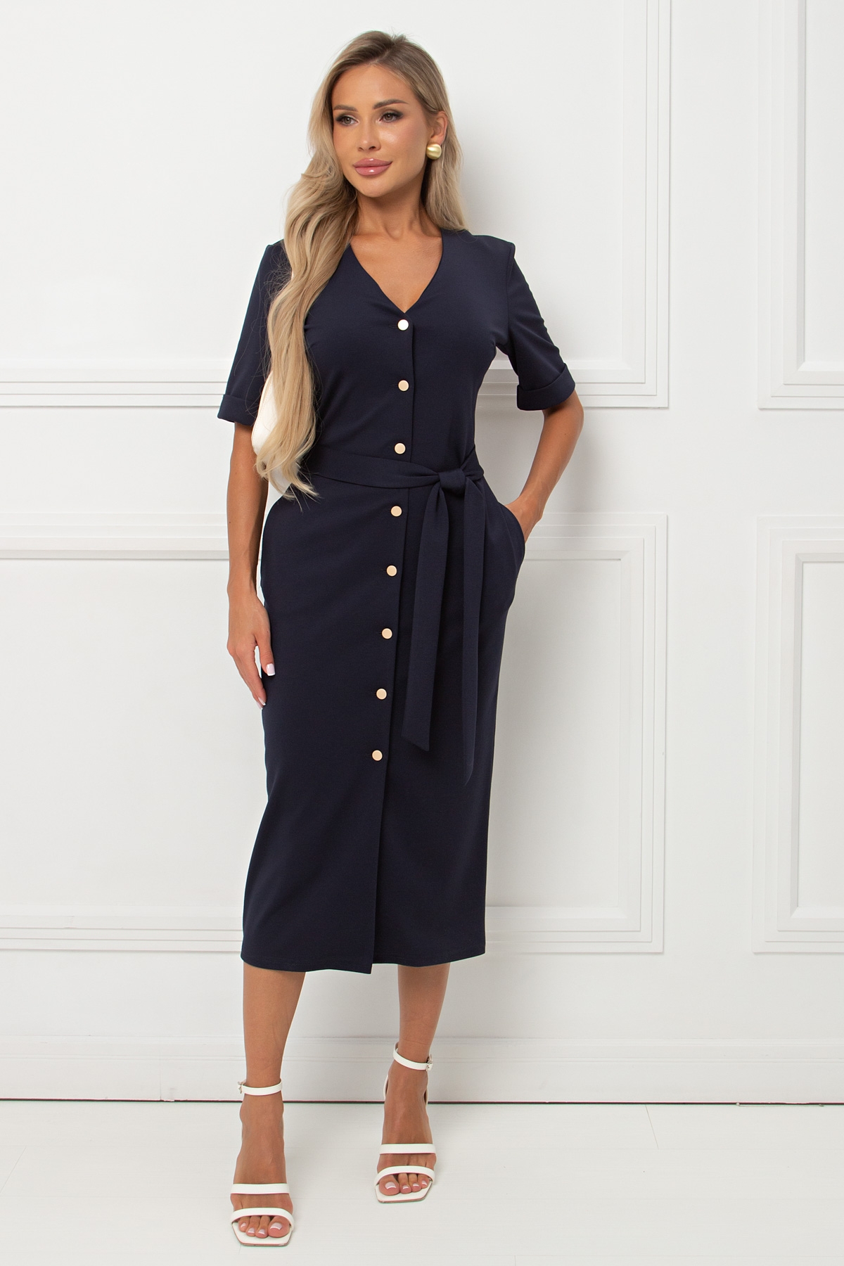 Повседневное платье полуприлегающего силуэта из трикотажного полотна .Короткий втачной рукав с отворотом по низу .V- образная горловина на внутренней обтачке переходящая в планку с застежкой на петли и пуговицы. В боковых швах функциональные карманы . Низ ровный , без разрезов. Пояс из основной ткани в комплекте.