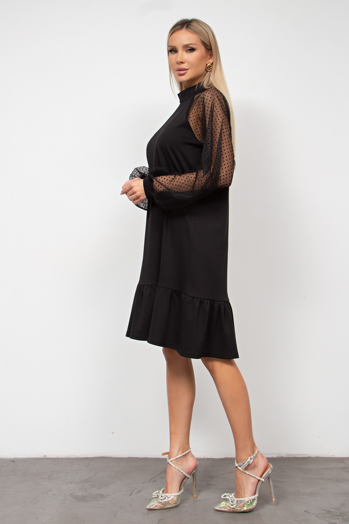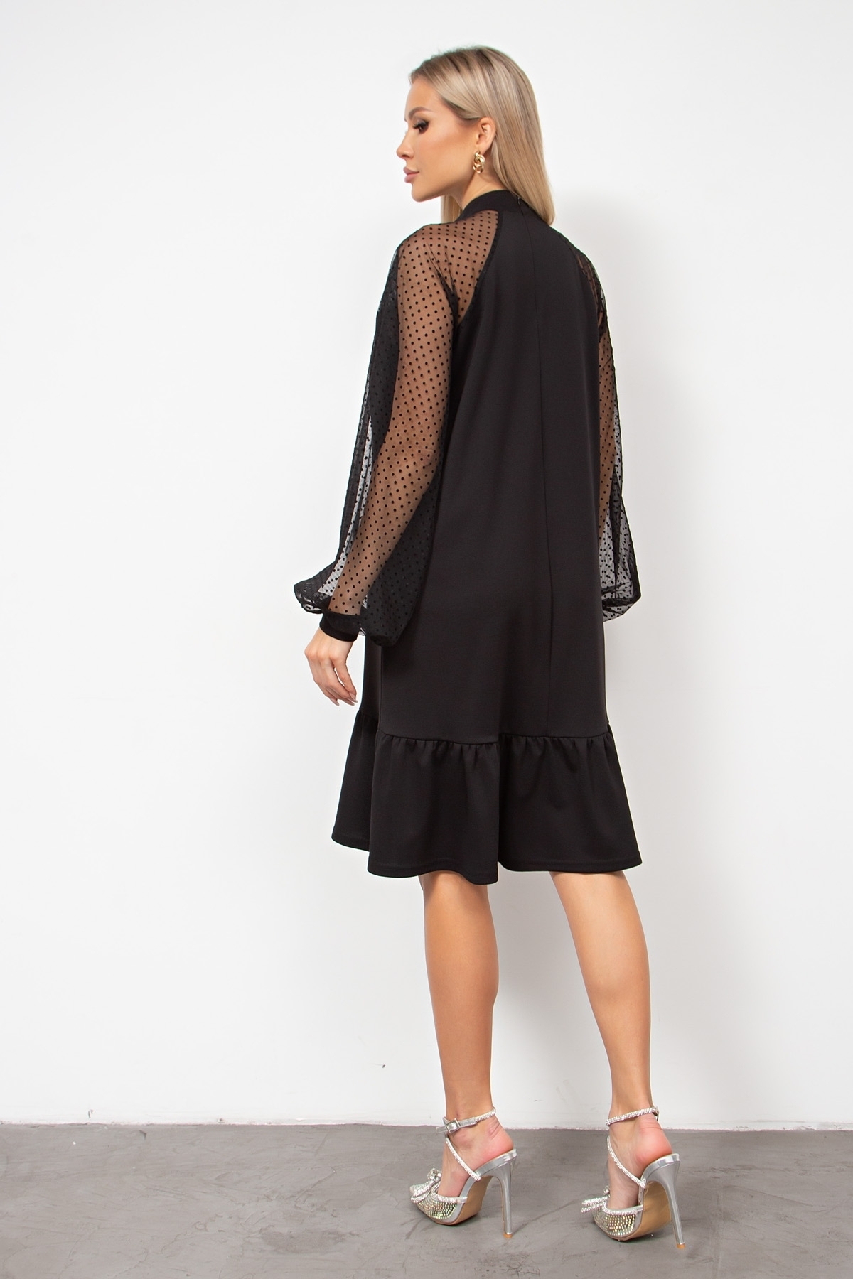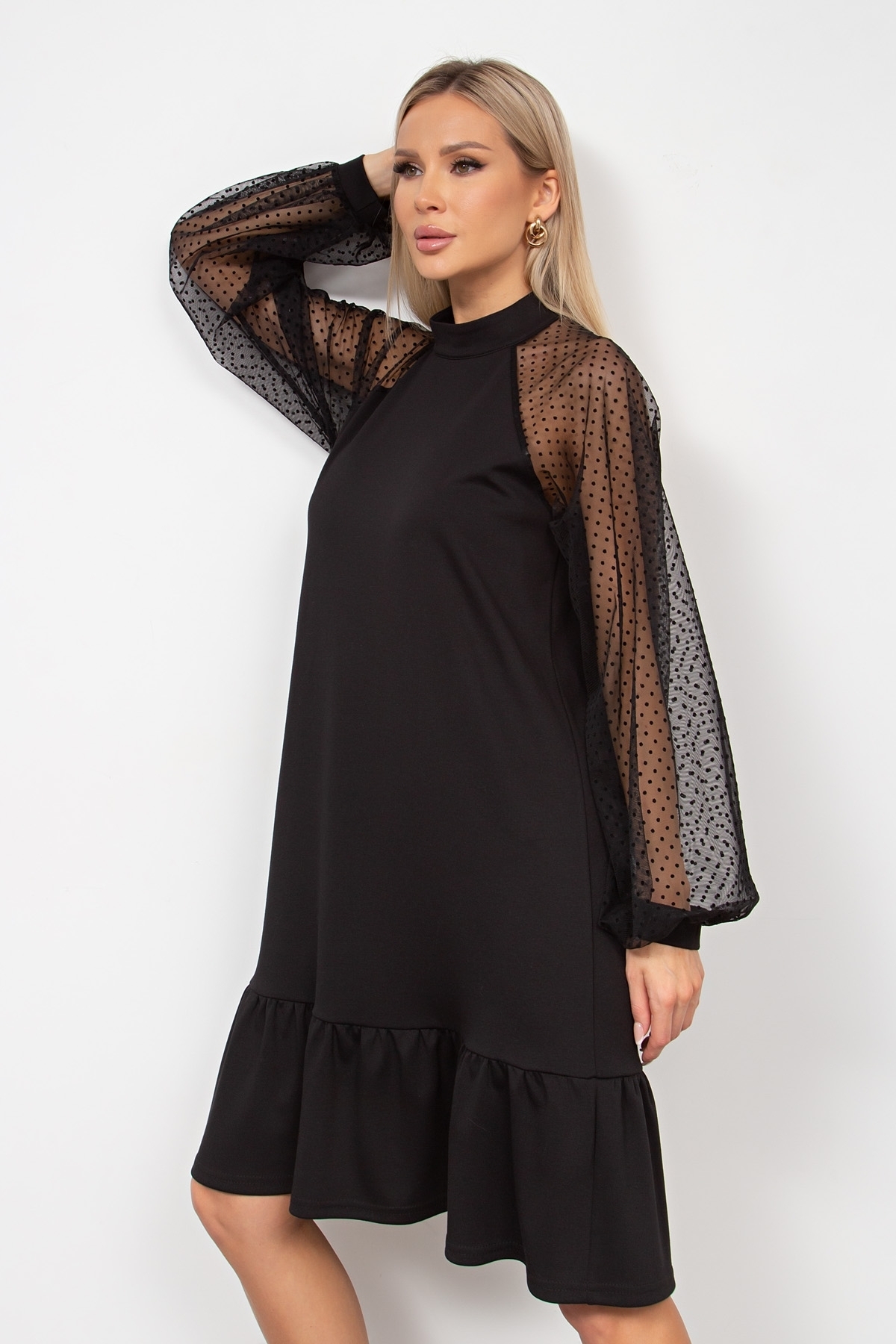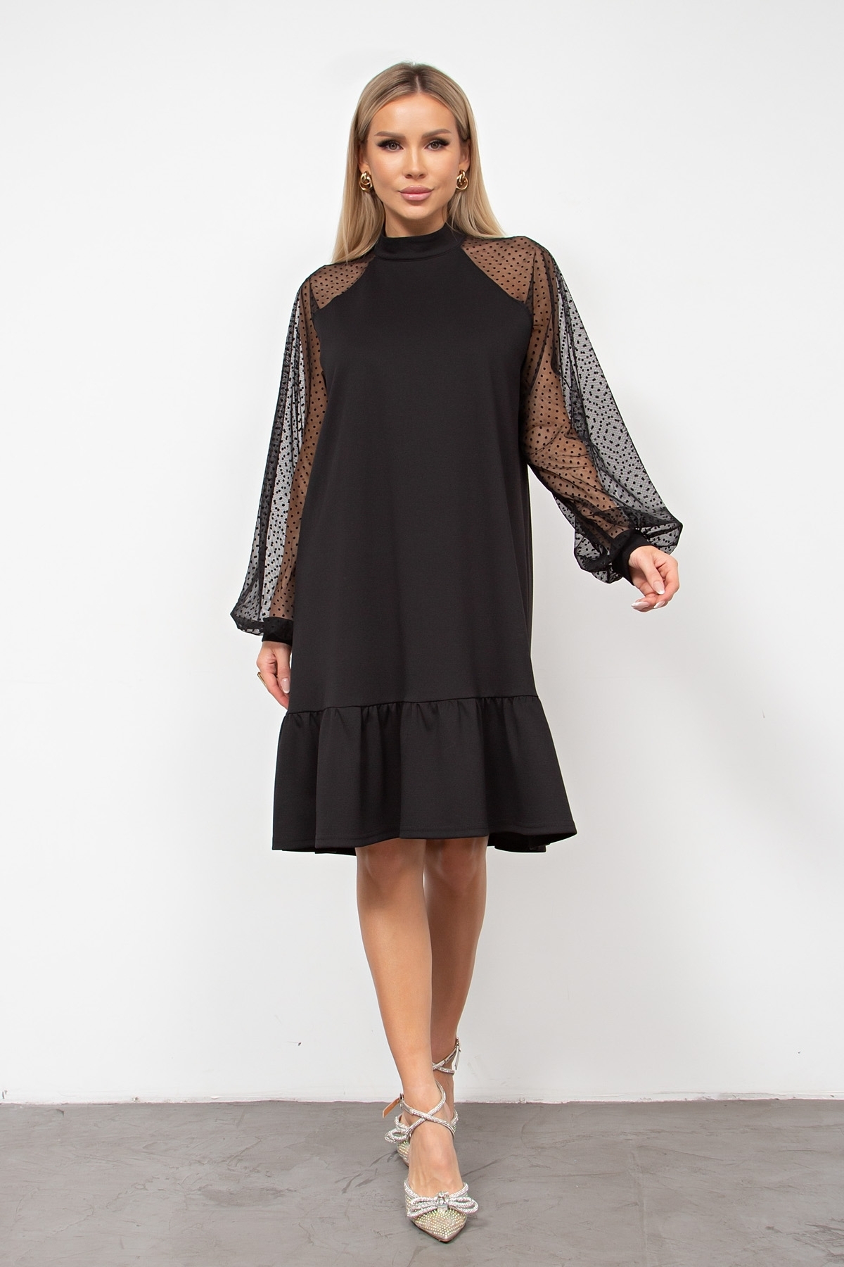 ОПИСАНИЕ Элегантное платье прямого кроя. Рукав реглан выполнен из сетки - горошек, оканчивается притачной манжетой. По горловине воротник - стойка. По среднему шву спинки застежка на потайную ленту - молнию. Низ дополнен притачным воланом. Пояс из основного материала в комплекте. Ремень №124 в комплект не входит, но вы можете приобрести его в разделе АКСЕССУАРЫ. Рекомендуемая стирка при t не более 30°. Длина изделия: 42, 44, 46, 48 р - 93 см; 50, 52 р - 98 см Длина рукава от горловины: 75 см Рост фотомодели: 168 см Размер фотомодели: 42 Ткань: Трикотаж, Сетка - горох
