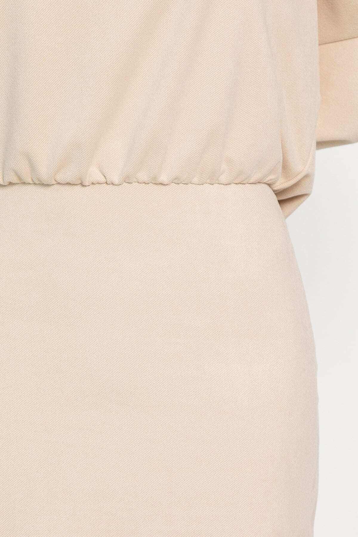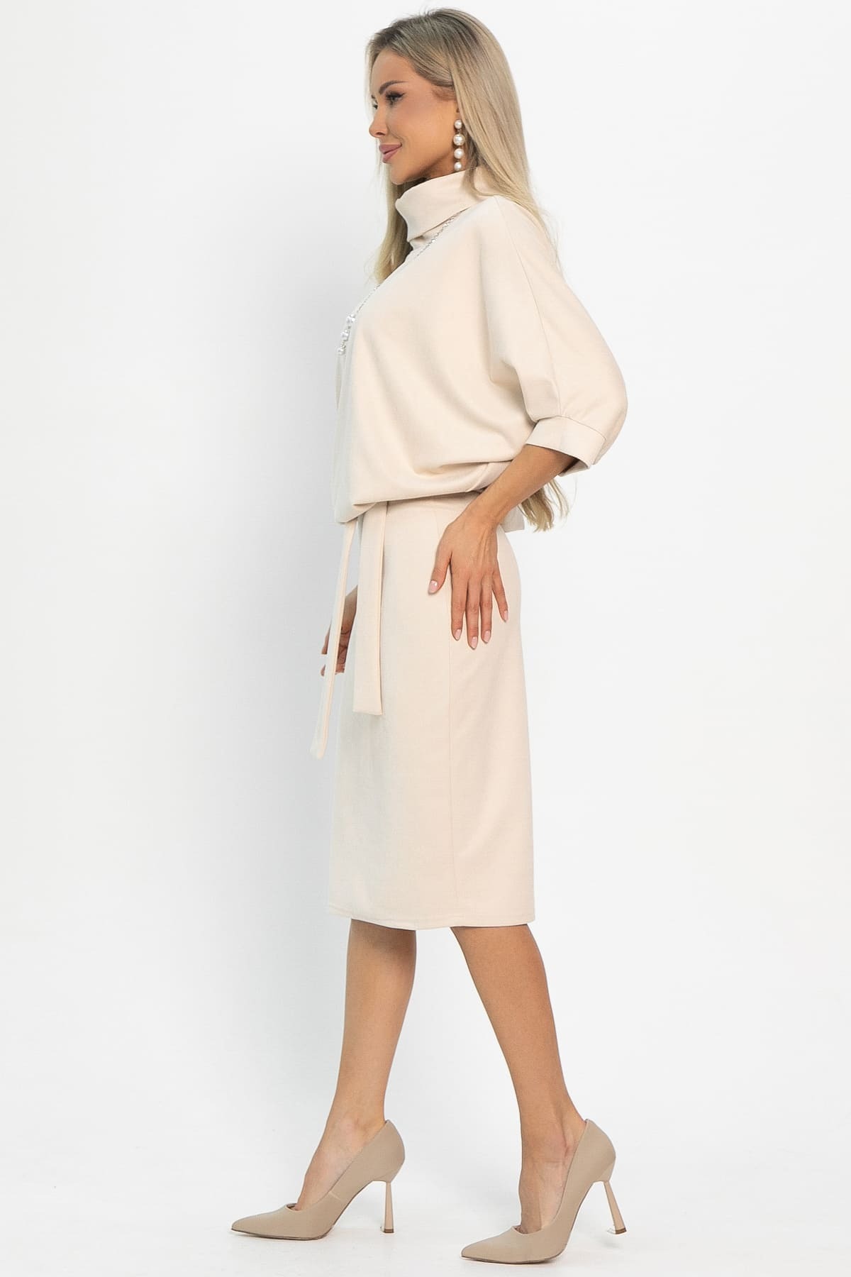 Платье из трикотажа в нежном молочном оттенке. Элегантная юбка прилегающего силуэта подчеркнёт красоту женской фигуры и визуально вытянет силуэт, а верх, скроенный по типу «летучая мышь», не будет сковывать движений. Платье прекрасно подойдёт в качестве повседневного варианта и будет хорошо сочетаться как с туфлями или ботильонами, так и с кроссовками или ботинками. Благодаря своему фасону платье прекрасно справляется с задачей скрыть небольшие недостатки фигуры и подчеркнуть достоинства. Пояс из основной ткани и подвеска входят в комплект.