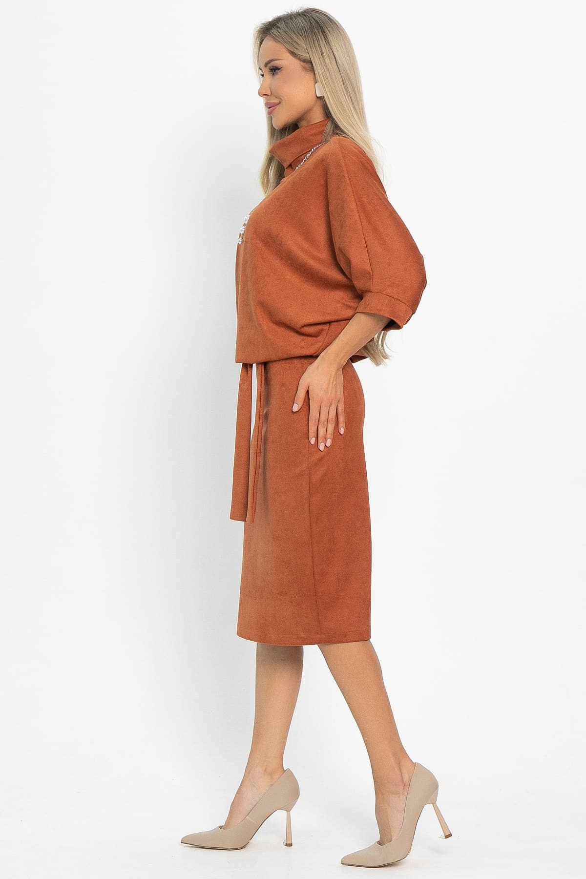 Платье из трикотажа в красивом терракотовом цвете. Элегантная юбка прилегающего силуэта подчеркнёт красоту женской фигуры, а свободный верх не будет сковывать движений. Платье прекрасно подойдёт в качестве повседневного варианта и будет хорошо сочетаться как с туфлями или ботильонами, так и с кроссовками или ботинками. Благодаря своему фасону платье прекрасно справляется с задачей скрыть небольшие недостатки фигуры и подчеркнуть достоинства. Подвеска с жемчужными бусинами и пояс из основной ткани входят в комплект.