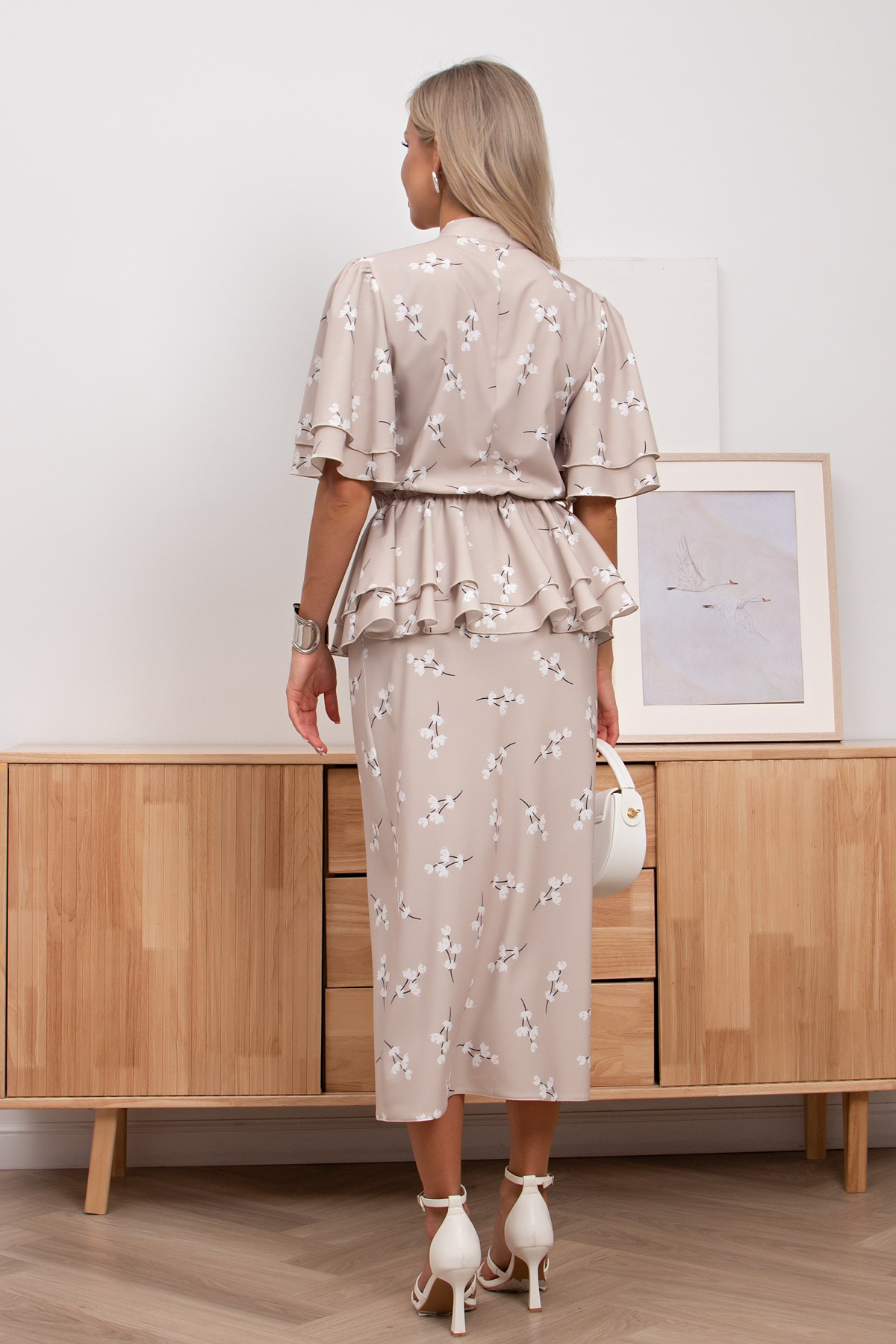 Романтическое , летнее платье приталенного силуэта из текстильного полотна. Горловина оформлена воротником - стойкой переходящей в вырез - капелька. Двойной широкий рукав. Модель отрезная по линии талии с втачной баской. Талия присборена на резинку. Пояс из основной ткани в комплекте.