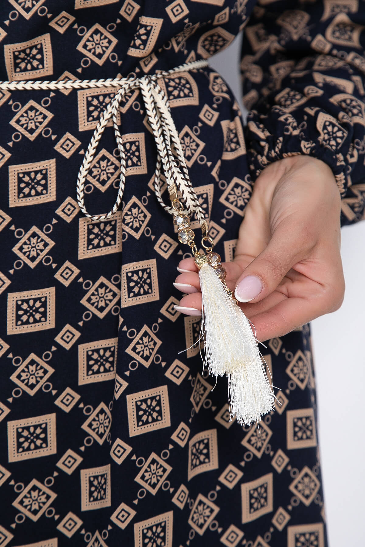 Это прекрасное платье поможет вам выглядеть стильно и элегантно в любой ситуации. Легкое платье в стиле "бохо" с длинными рукавами на резинке. Свободный крой платья больших размеров обеспечивает комфорт и свободу движений. Благодаря своему универсальному дизайну, платье подходит как для повседневного ношения, так и для особых случаев, включая вечерние мероприятия и торжества. В комплект входит ремень.