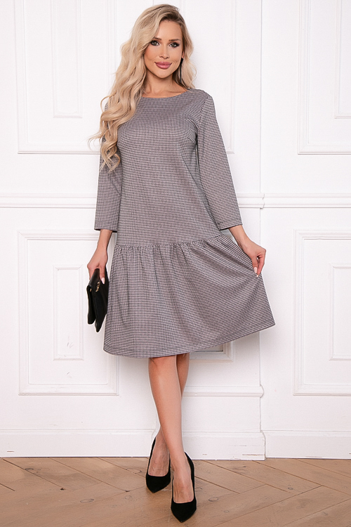 Платье А-силуэта из трикотажного полотна в гусиную лапку с притачным воланом по низу.