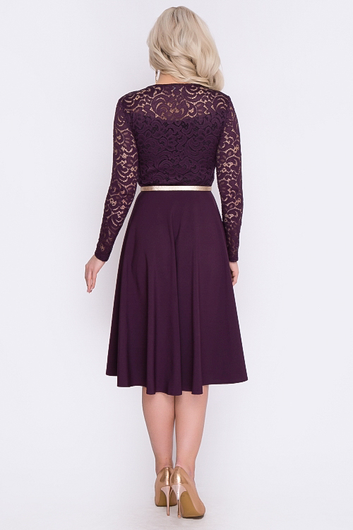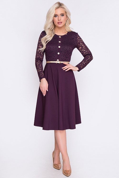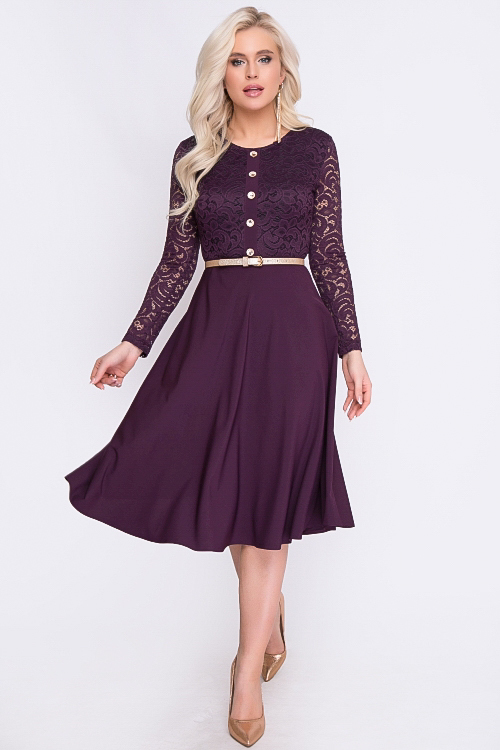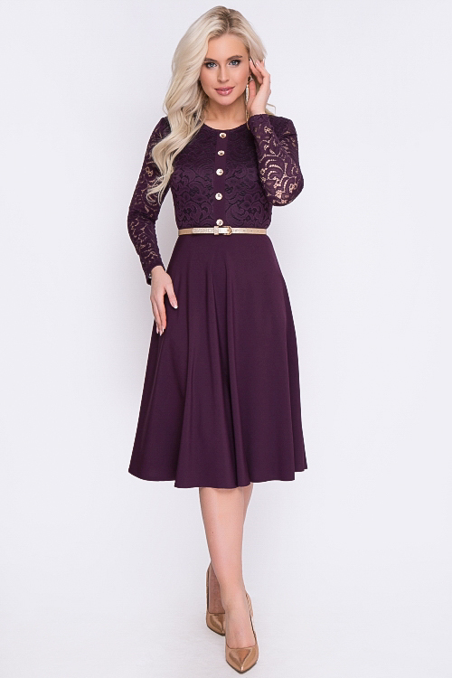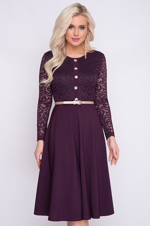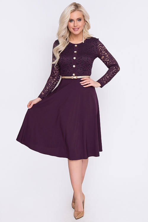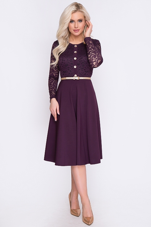 Платье приталенного силуэта,отрезное по линии талии.Юбка полусолнце из текстильного полотна.Лиф из кружевного полотна на трикотажном подкладе.По переду лифа декоративная планка с металлическими пуговицами.Рукав втачной,кружевной.Ремень в комплект не входит.