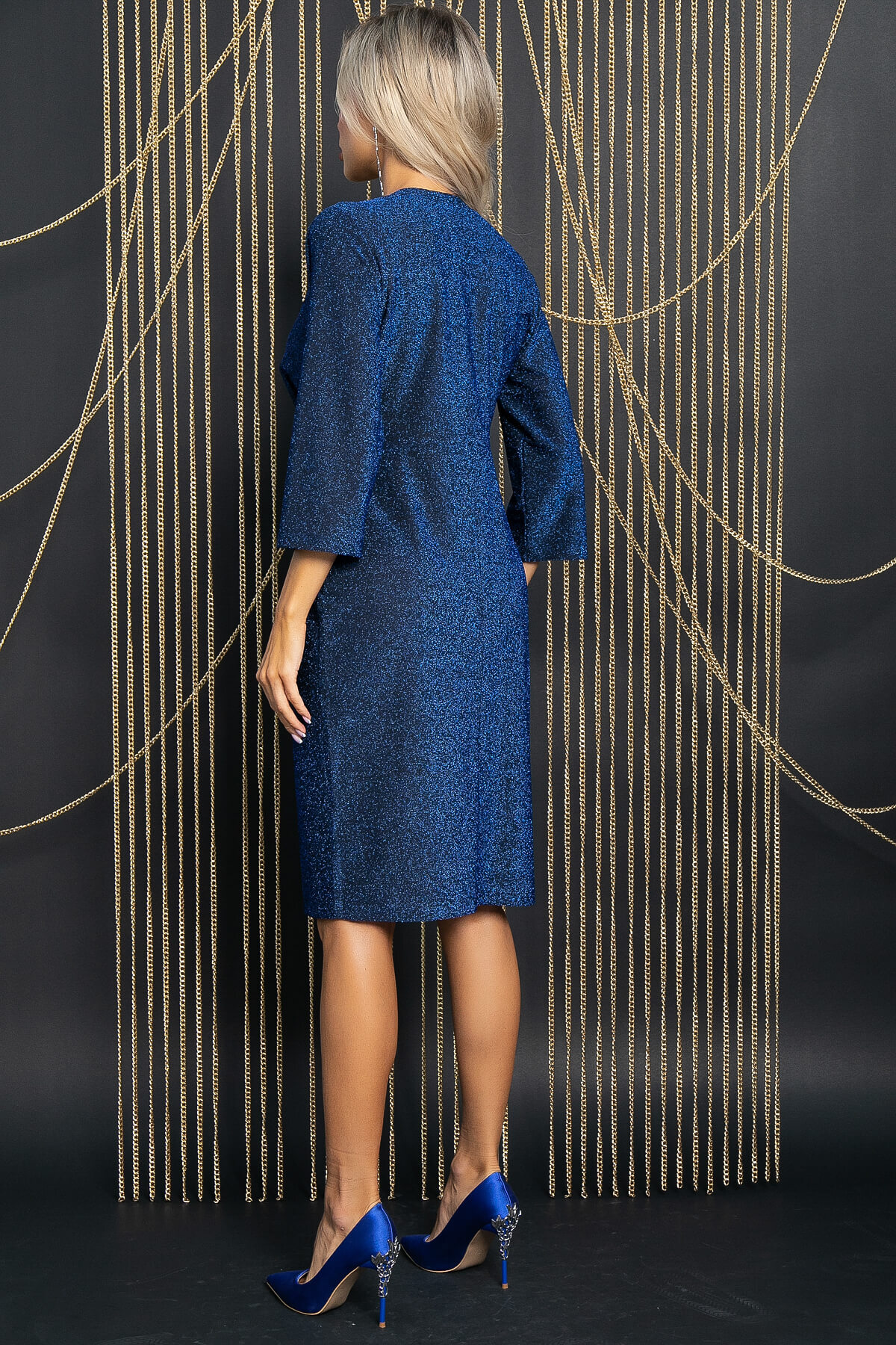 Вечернее платье прилегающего силуэта в красивом синем цвете, с невероятным мерцанием. Акцентом данной модели является асимметричный разрез по низу изделия. Рукав втачной, три четверти. V-образный вырез на запахе идеально подчёркивает зону декольте.