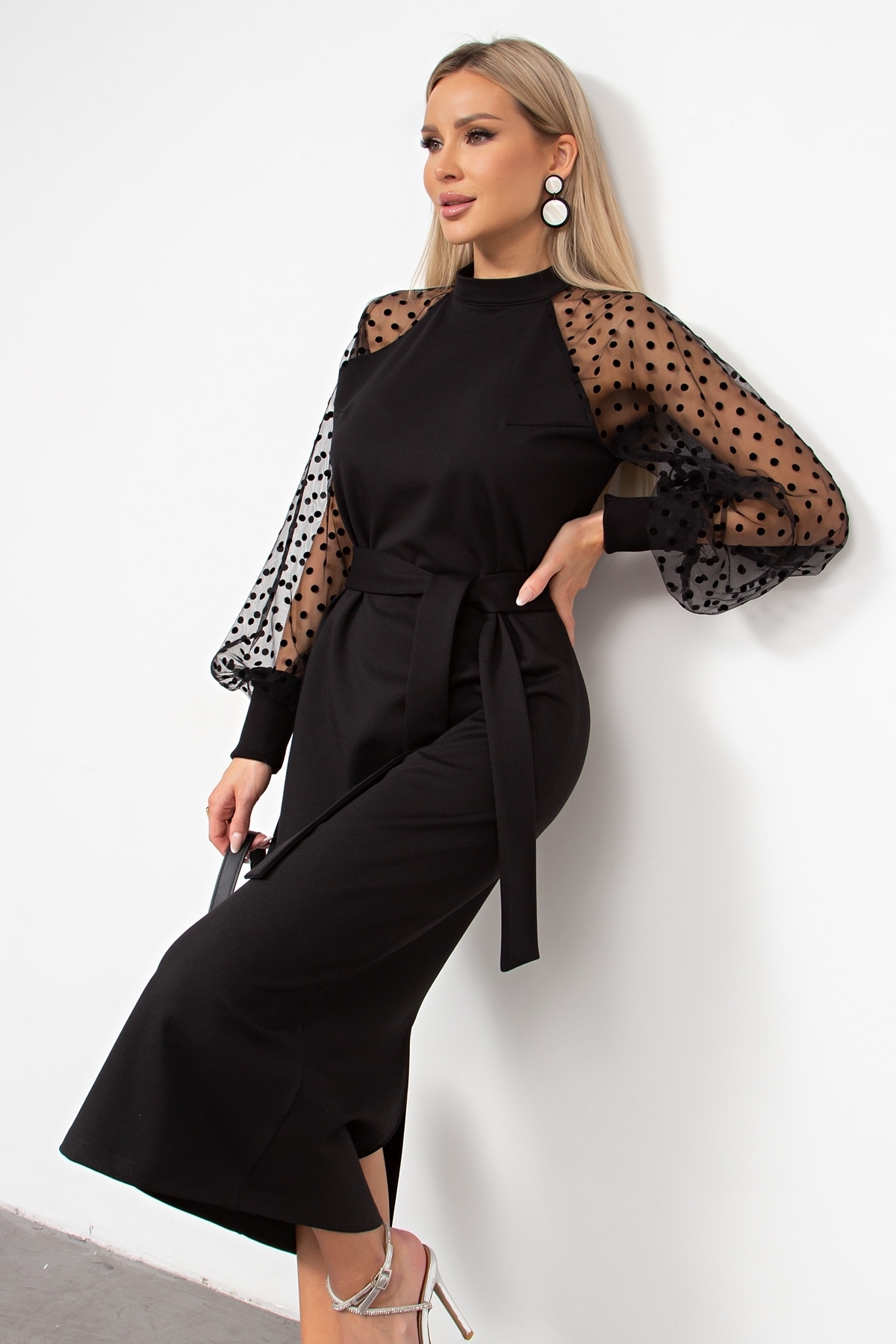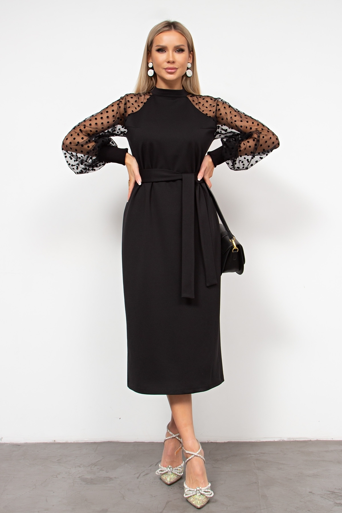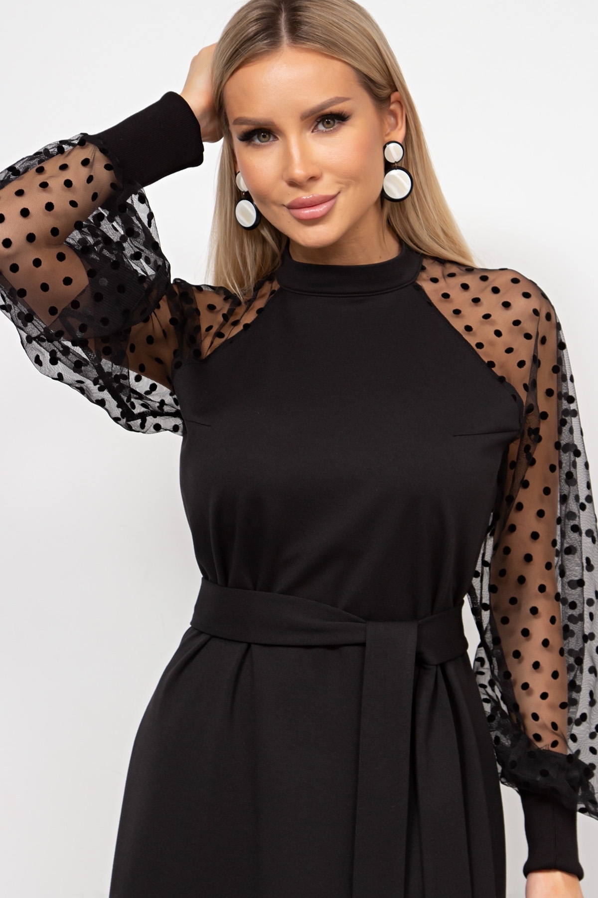 ОПИСАНИЕ Элегантное платье прямого кроя. Рукав реглан выполнен из сетки - горох, оканчивается притачной манжетой. По горловине воротник - стойка. По среднему шву спинки застежка на потайную ленту - молнию. Низ ровный, сзади разрез. Пояс из основного материала в комплекте. Рекомендуемая стирка при t не более 30°. Длина изделия: 115 см Длина рукава от горловины: 76 см Рост фотомодели: 168 см Размер фотомодели: 42 Ткань: Трикотаж, Сетка