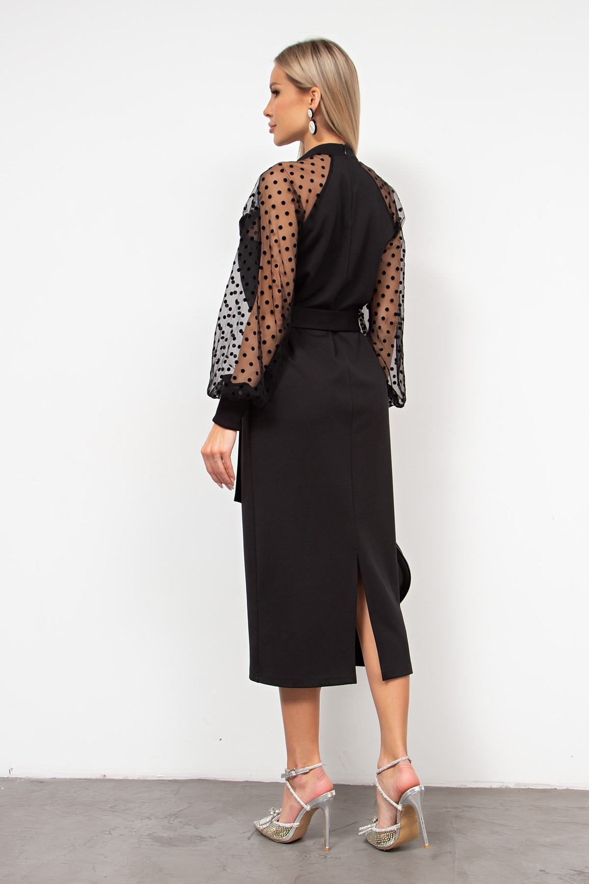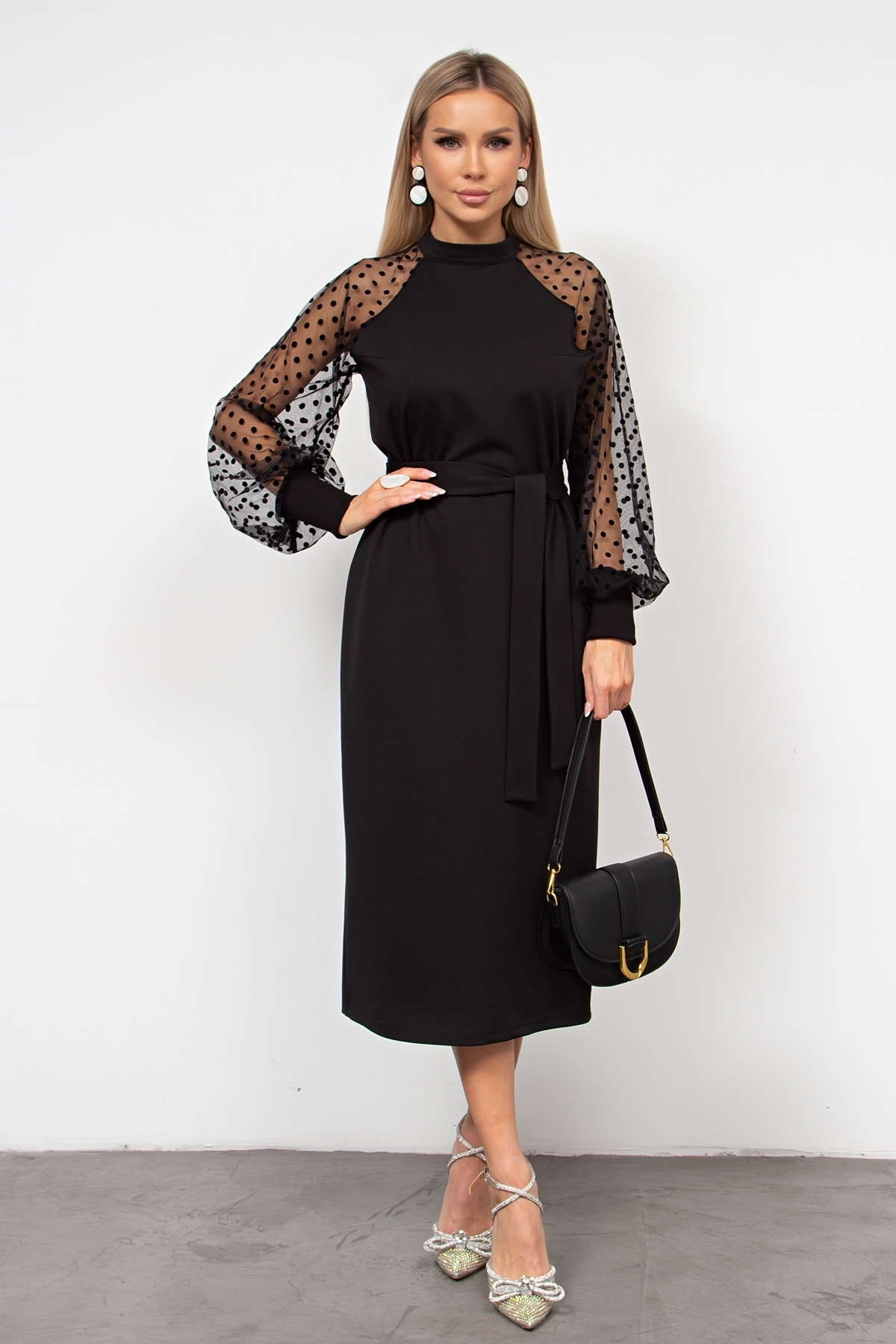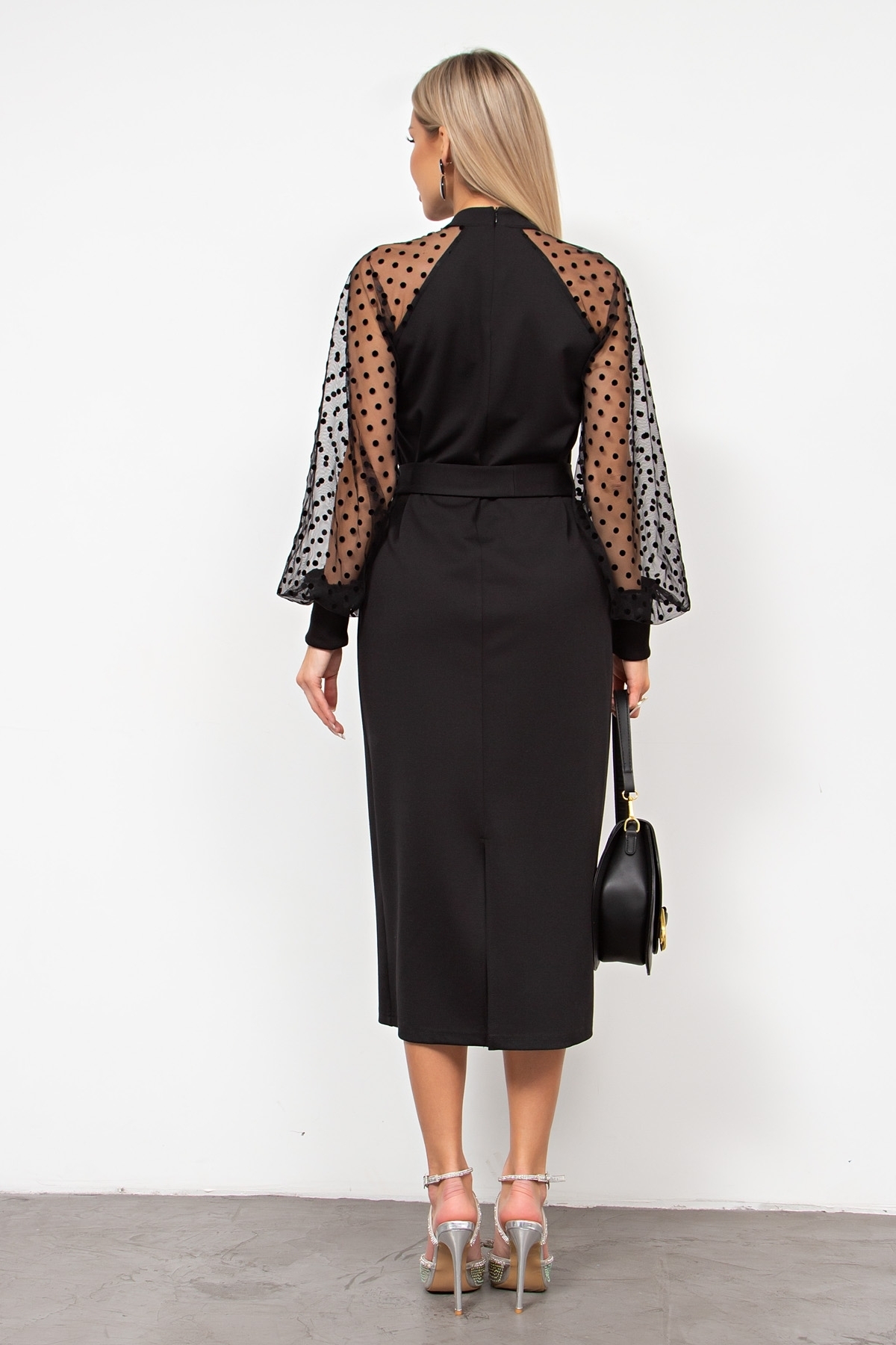 ОПИСАНИЕ Элегантное платье прямого кроя. Рукав реглан выполнен из сетки - горох, оканчивается притачной манжетой. По горловине воротник - стойка. По среднему шву спинки застежка на потайную ленту - молнию. Низ ровный, сзади разрез. Пояс из основного материала в комплекте. Рекомендуемая стирка при t не более 30°. Длина изделия: 115 см Длина рукава от горловины: 76 см Рост фотомодели: 168 см Размер фотомодели: 42 Ткань: Трикотаж, Сетка