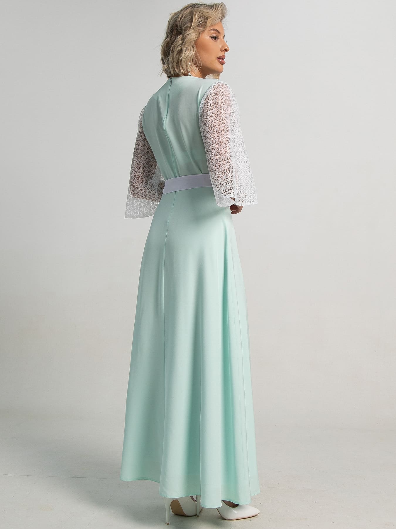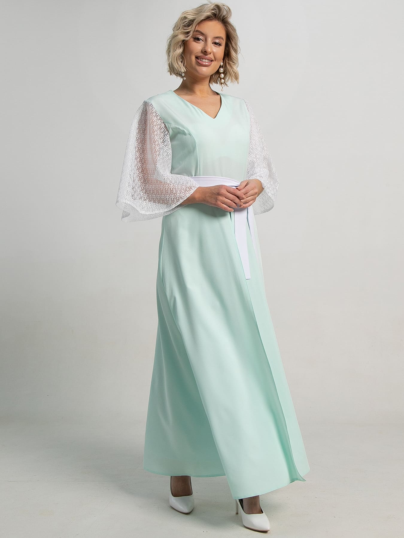 Элегантное комбинированное платье полной длины с приталенным силуэтом идеально подчеркнет вашу женственность. Застежка на молнии по спинке обеспечивает комфортную посадку, а округлая горловина придает образу классическую утонченность. Втачные рукава средней длины выполнены из белого кружева в виде расклешенных крылышек, добавляя романтичности и изящества.