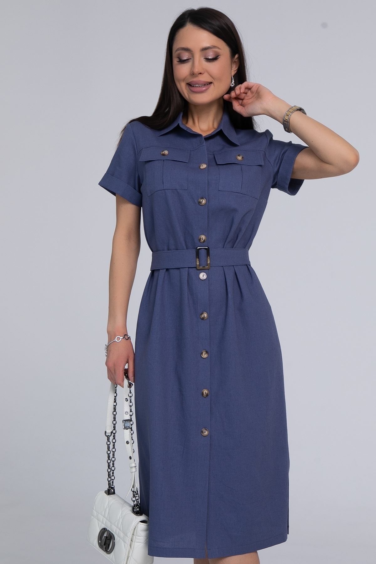 Модное платье-рубашка из натуральной ткани изо льна. Платье прямое, с идеальной посадкой, декоративными элементами в виде пуговиц и пряжки. Накладные карманы в области груди создают трендовый образ лета 2025 года. Платье застёгивается спереди на петли-пуговицы. Воротничок на стойке, по переду сделаны вытачки на грудь. На груди накладные карманы с пуговицами. По спинке сделаны две вытачки приталивания. Рукав короткий, втачной, с манжетом. В области талии и бёдер свободного прилегания. Платье дополняется поясом из основной ткани с красивой пряжкой.