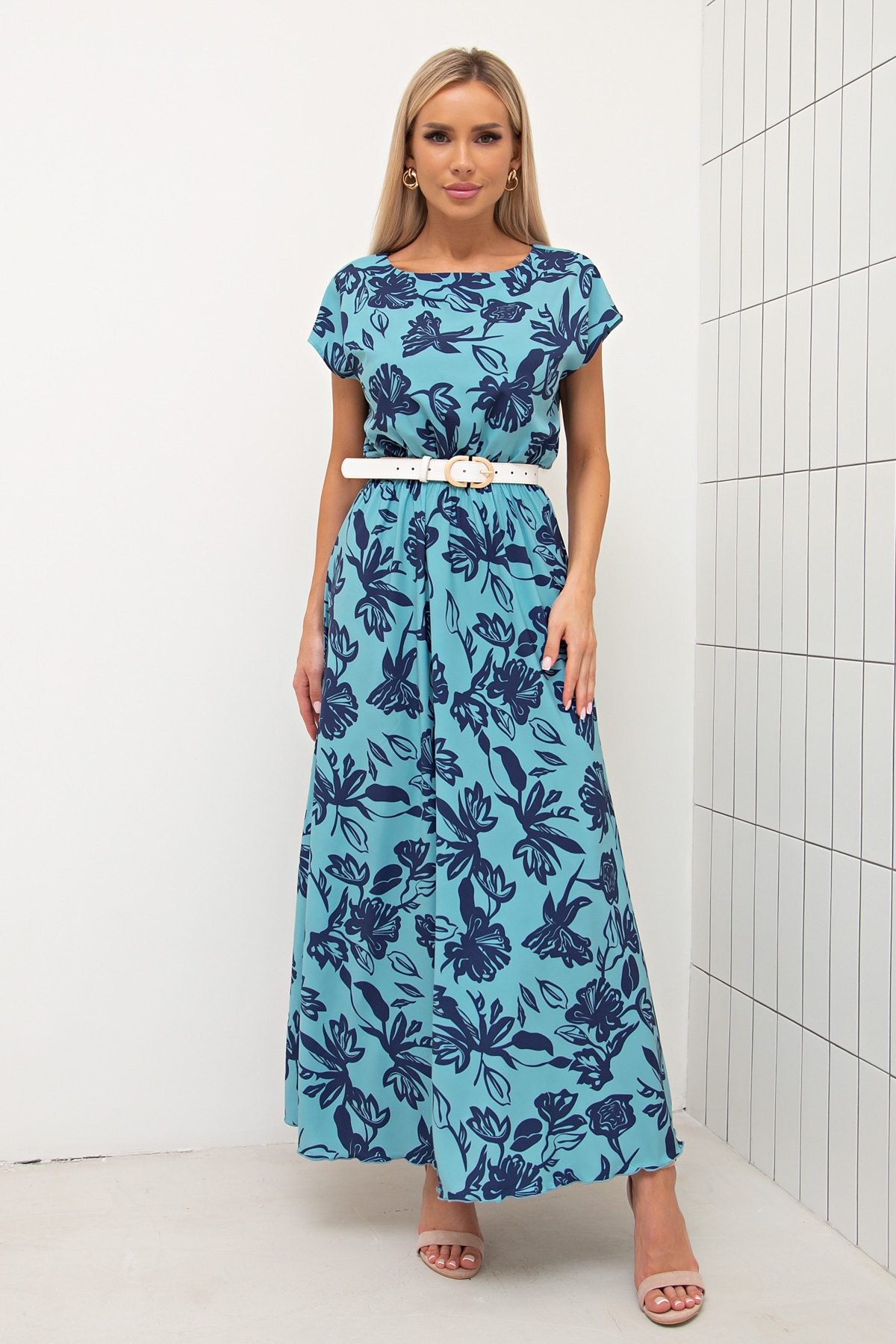 Воздушное платье полуприлегающего силуэта с цветочным принтом. Короткие спущенные рукава. Горловина на внутренней обтачке оформлена "лодочкой". Модель отрезная по талии, собрана на резинку. Низ ровный, без разрезов.