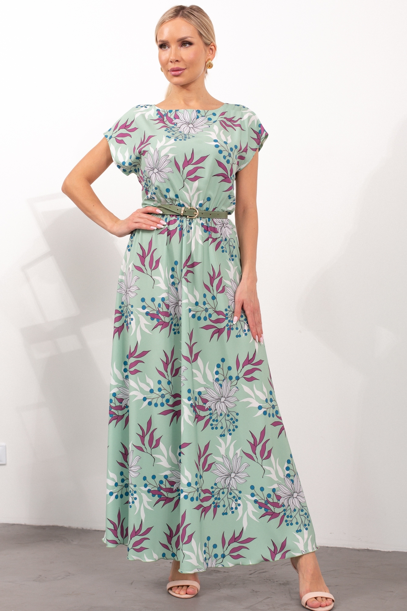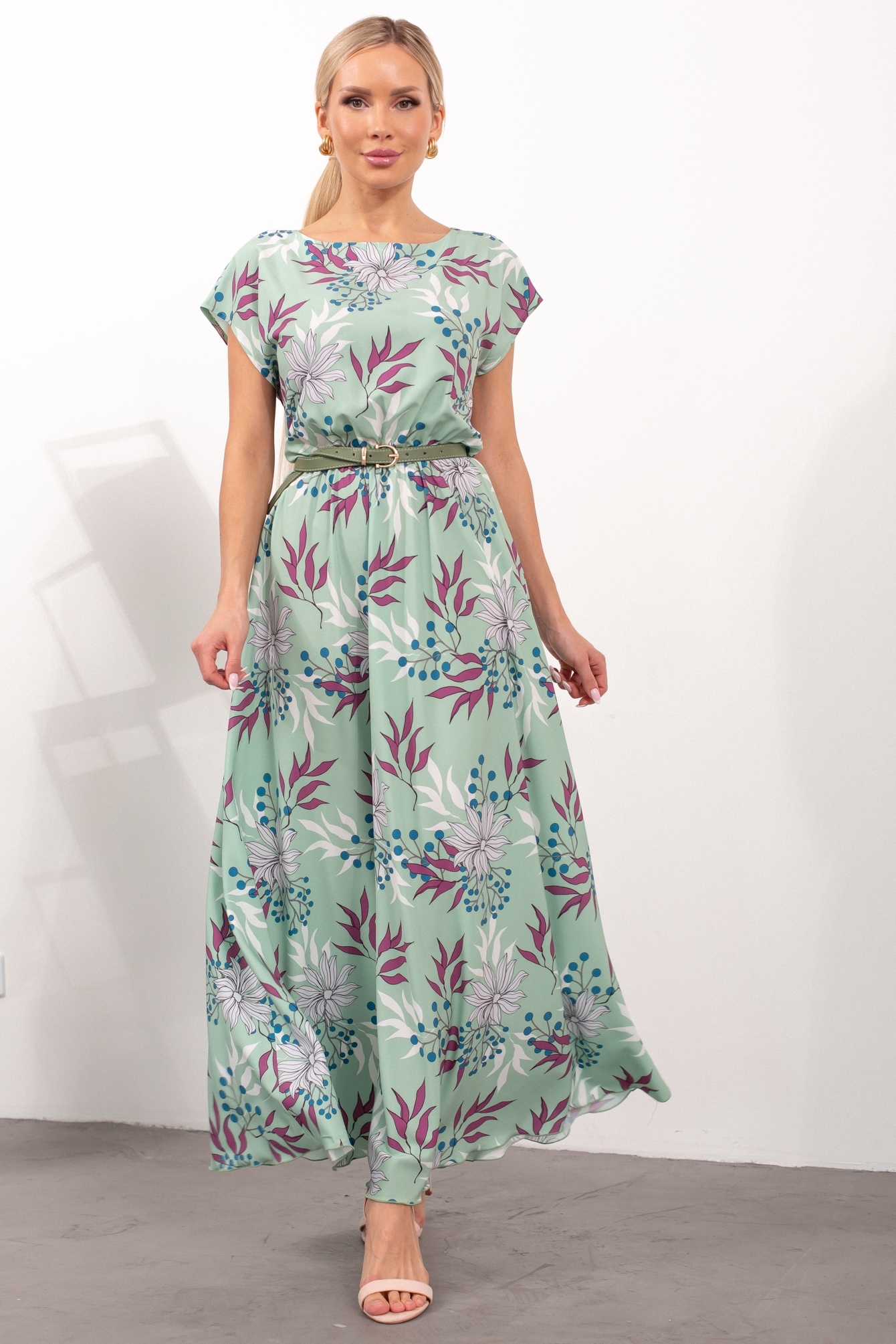 Воздушное платье полуприлегающего силуэта с оригинальным принтом. Короткие спущенные рукава. Горловина на внутренней обтачке оформлена "лодочкой". Модель отрезная по талии, собрана на резинку. Низ ровный, без разрезов.