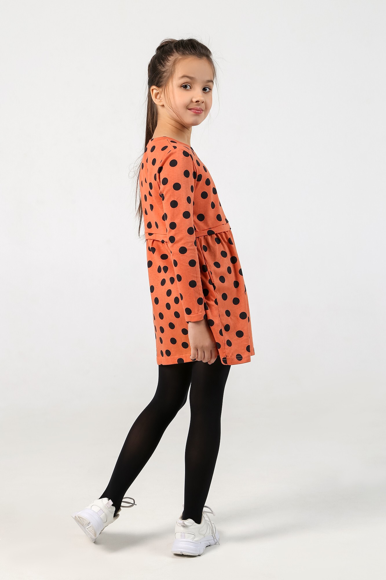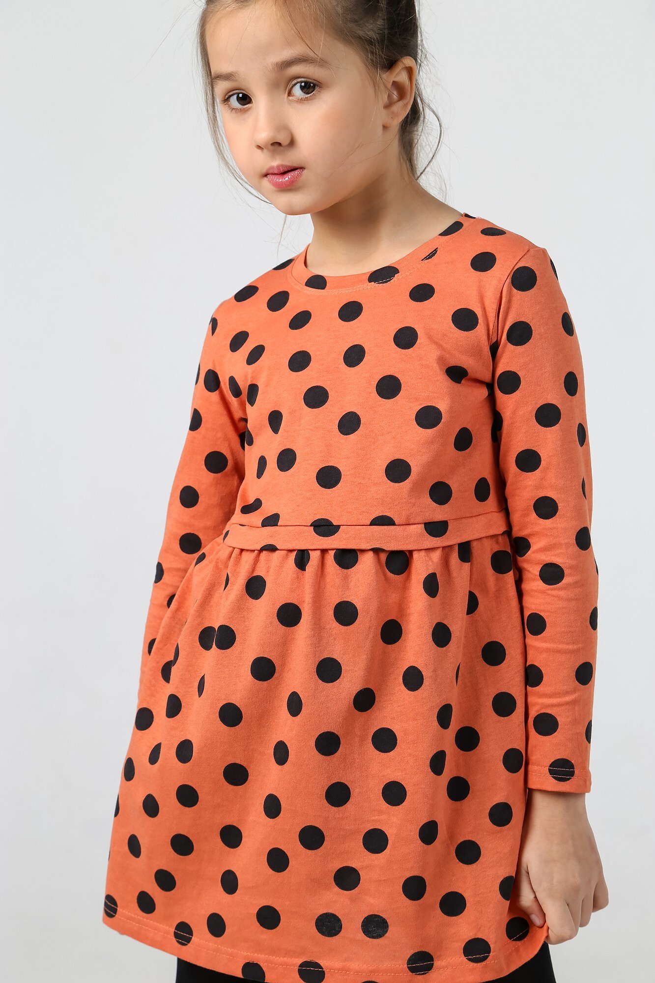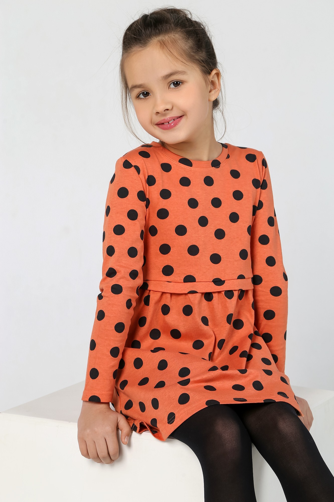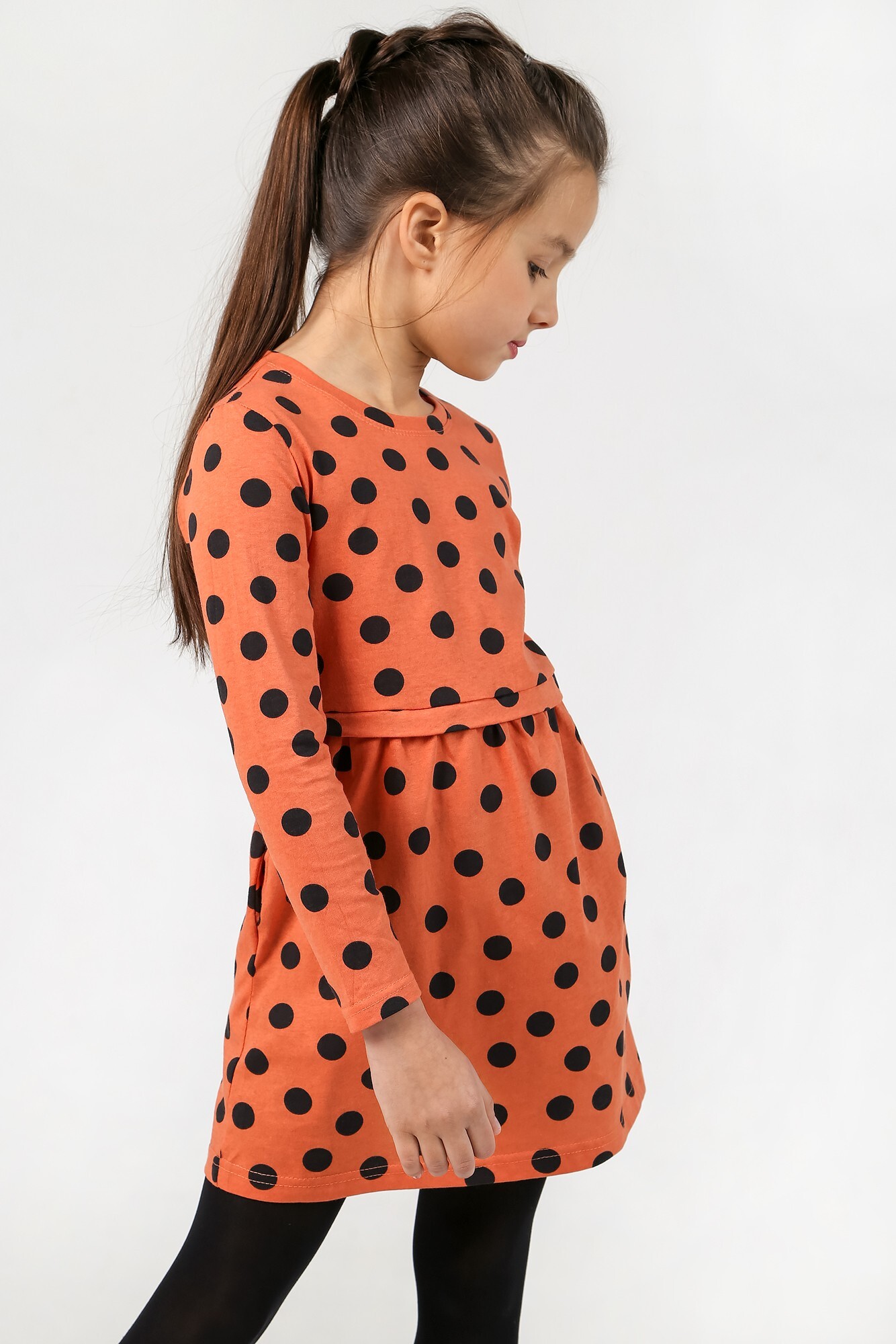 Платье для девочки х/б полотна кулирного переплетения с набивным рисунком. Модель длиной выше колен, с отрезной присборенной по верху юбкой, с карманами в боковых швах и декоративной планкой по линии талии. Рукава длинные, базового покроя.