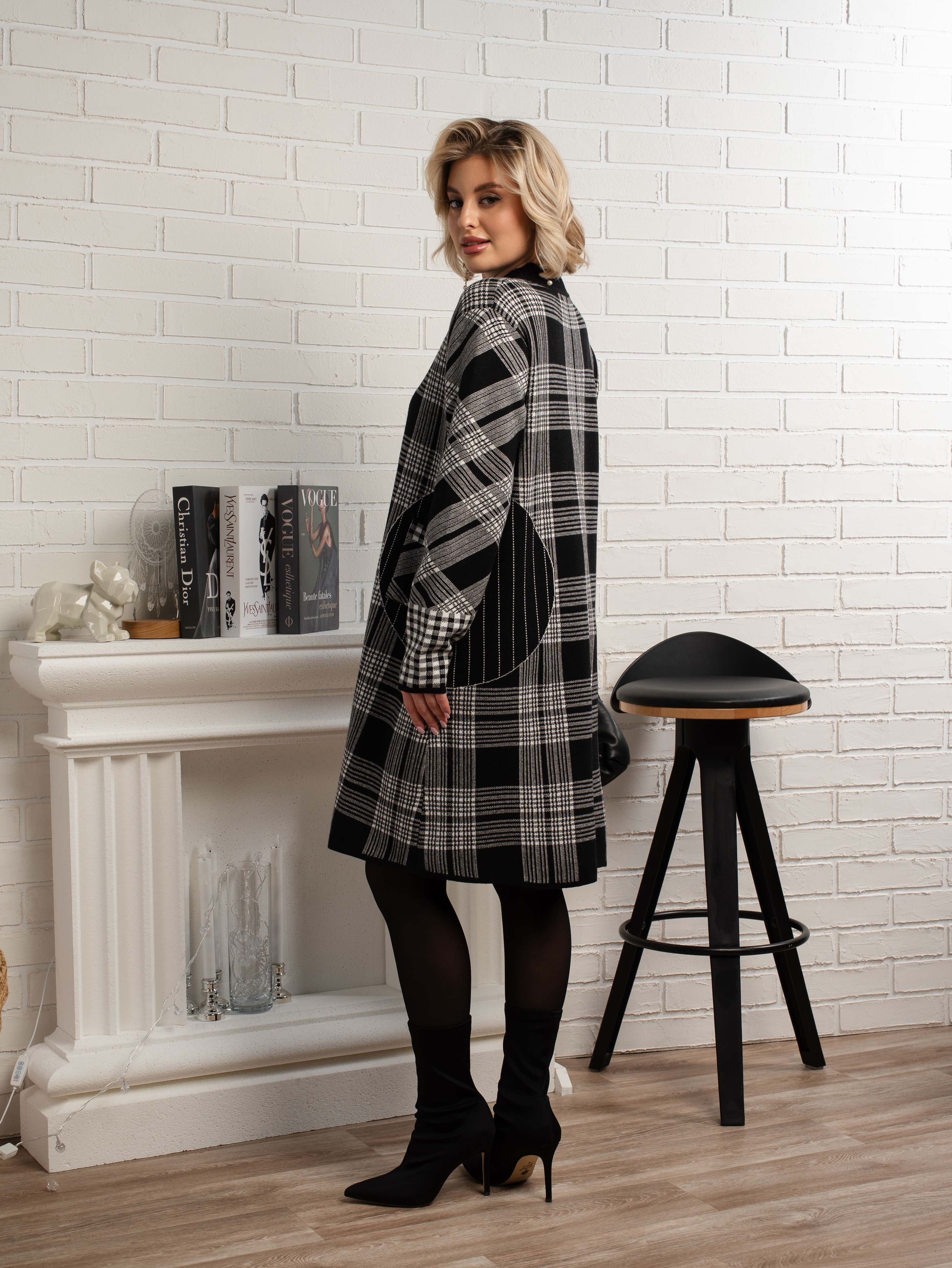 Стильное женское платье из вязаного полотна — идеальный выбор для любого гардероба. Классический черно-белый цвет подходит как для повседневных образов, так и для офисного стиля. Свободный крой и длина миди обеспечивают комфорт и уверенность.