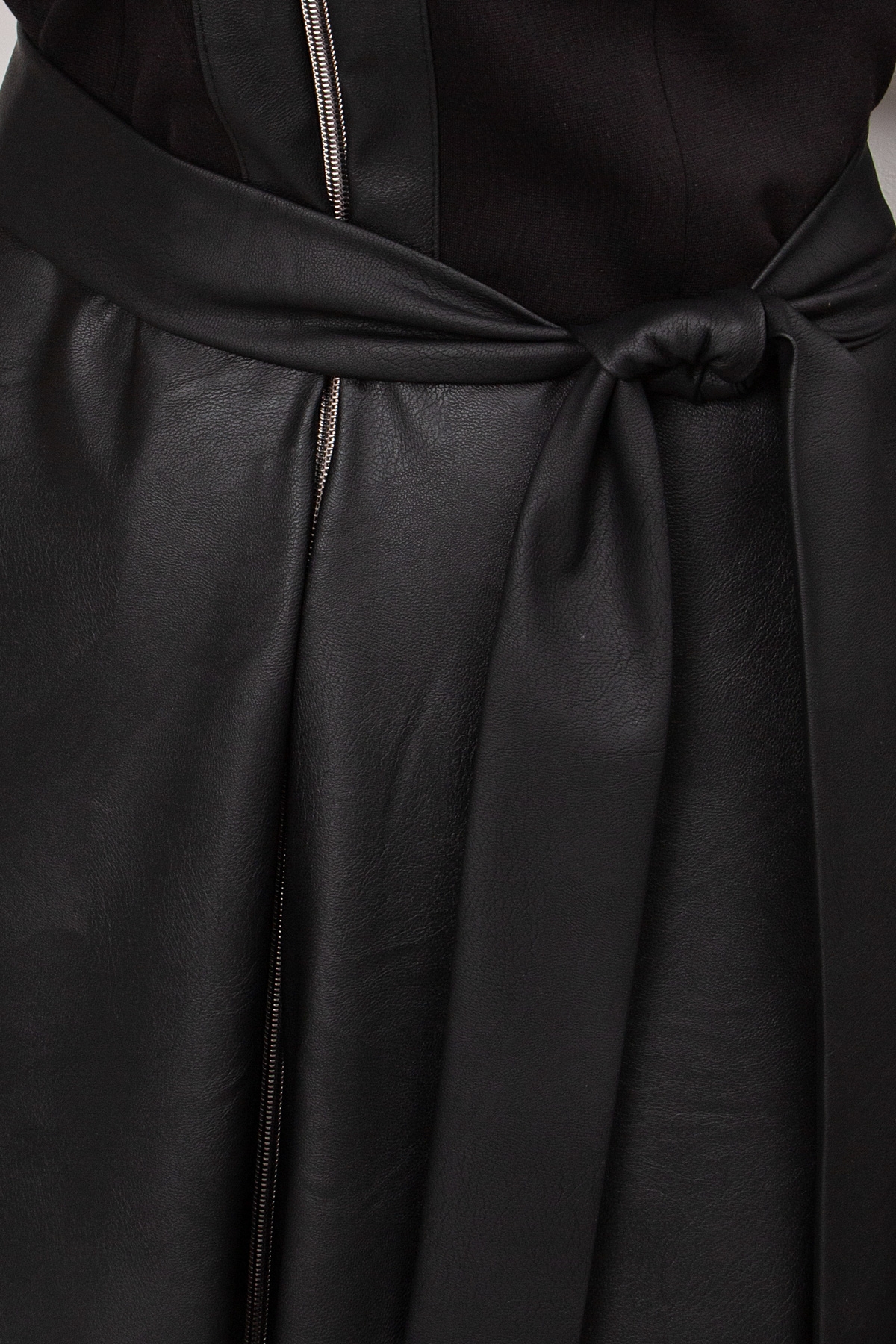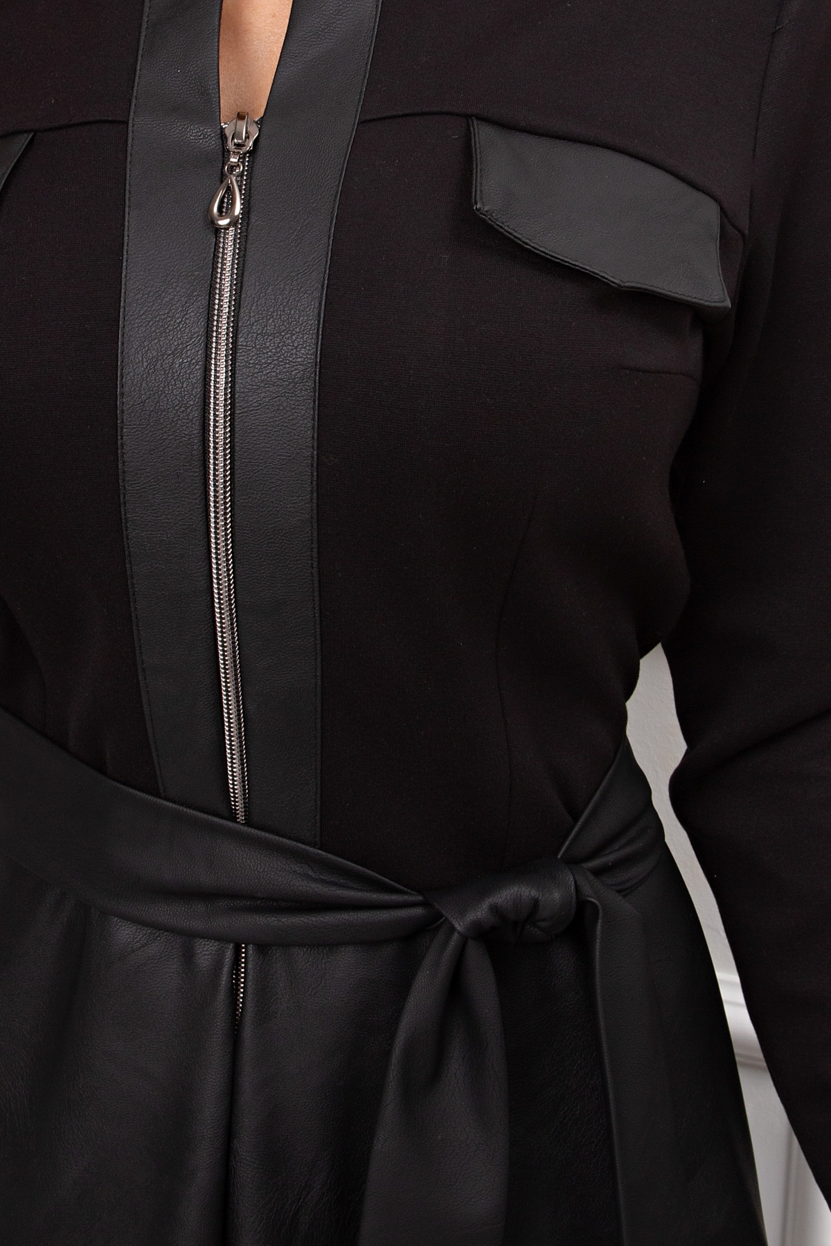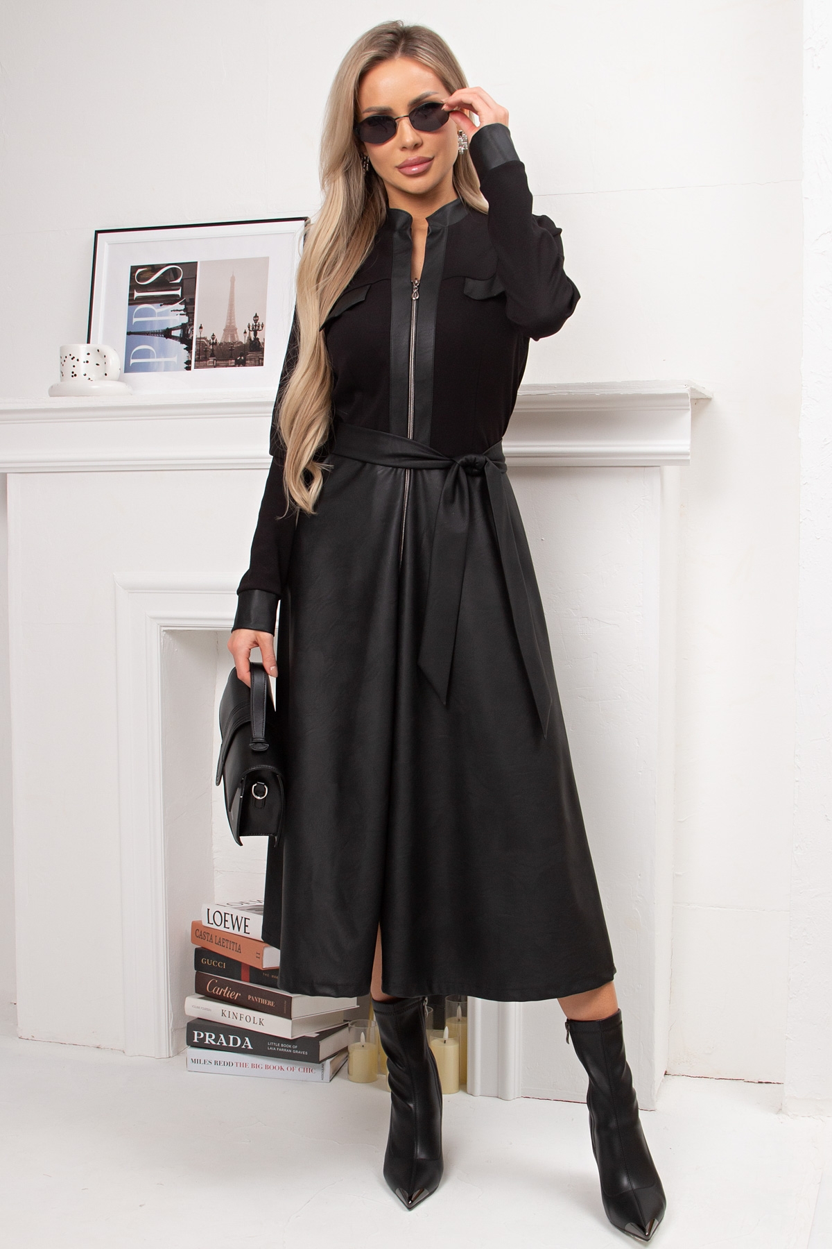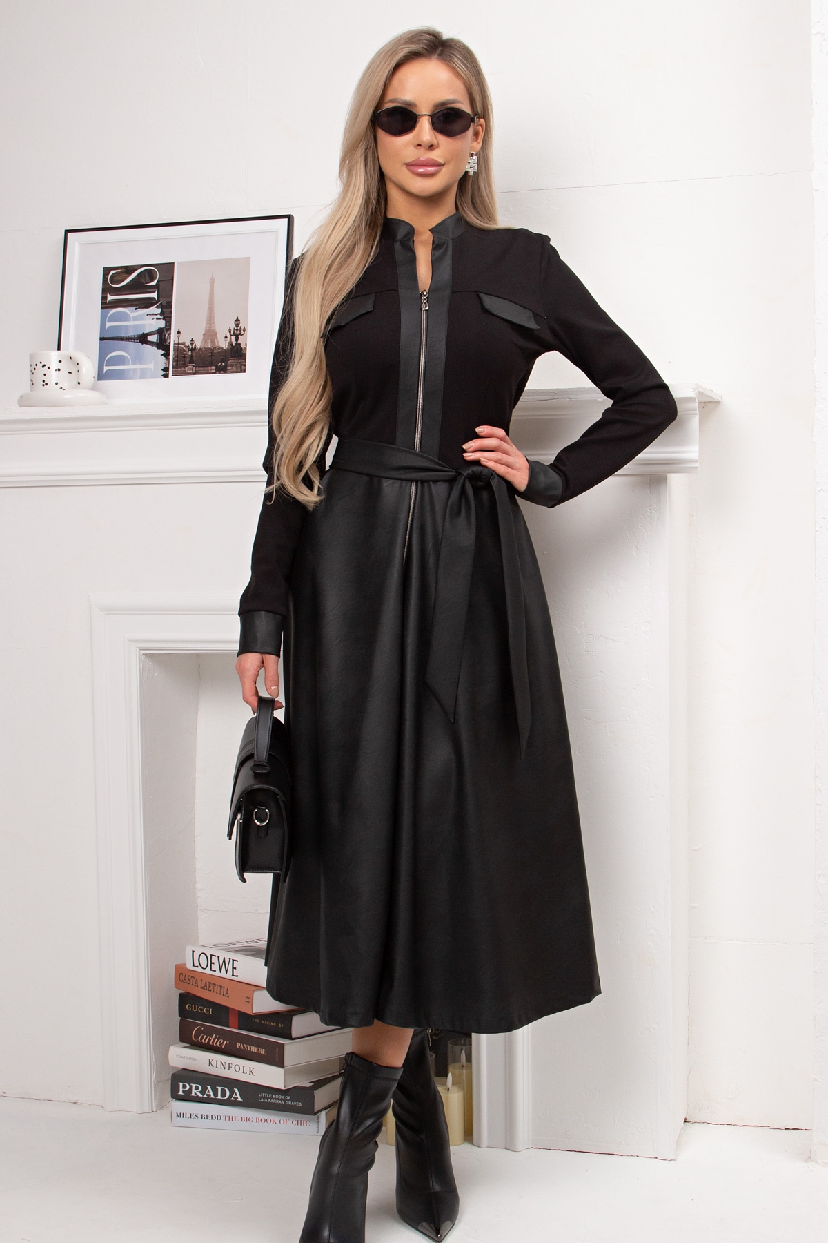 Стильное платье приталенного силуэта. Длинный втачной рукав окантованный притачной манжетой из кожи. Горловина оформлена воротником-стойкой. Перед дополнен накладными клапанами. Модель отрезная по линии талии. По переду застежка на молнию. Пояс в комплекте.