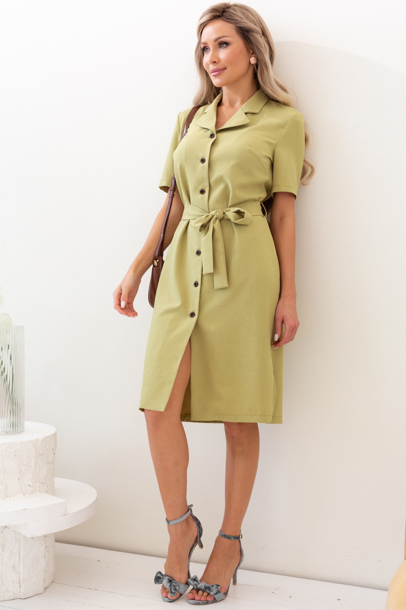Стильное платье полуприлегающего силуэта. V - образный вырез горловины с английским отложным воротником. По переду выполнена застежка на петли и пуговицы. Втачной короткий рукав. Низ ровный, по бокам разрезы. Пояс из основного материала в комплекте.