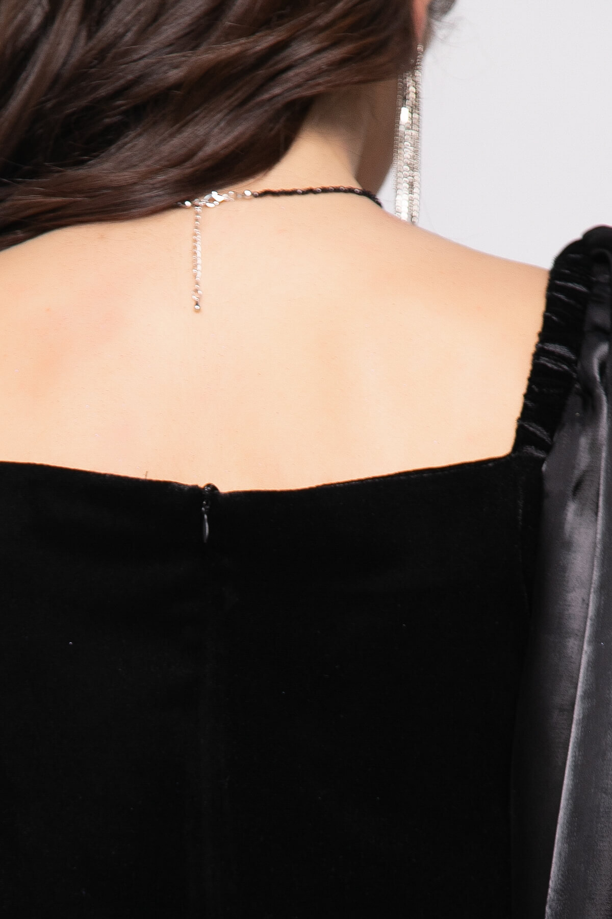 Роскошное платье для эффектного выхода! Оно наполнено всеми элементами, которые подчеркивают женственность и элегантность. Элегантный вырез подчеркивает зону декольте. Объемные рукава, выполненные из органзы, придают особый шарм - они на резинке, что позволяет их спустить с плеч и придать более роскошный вид.