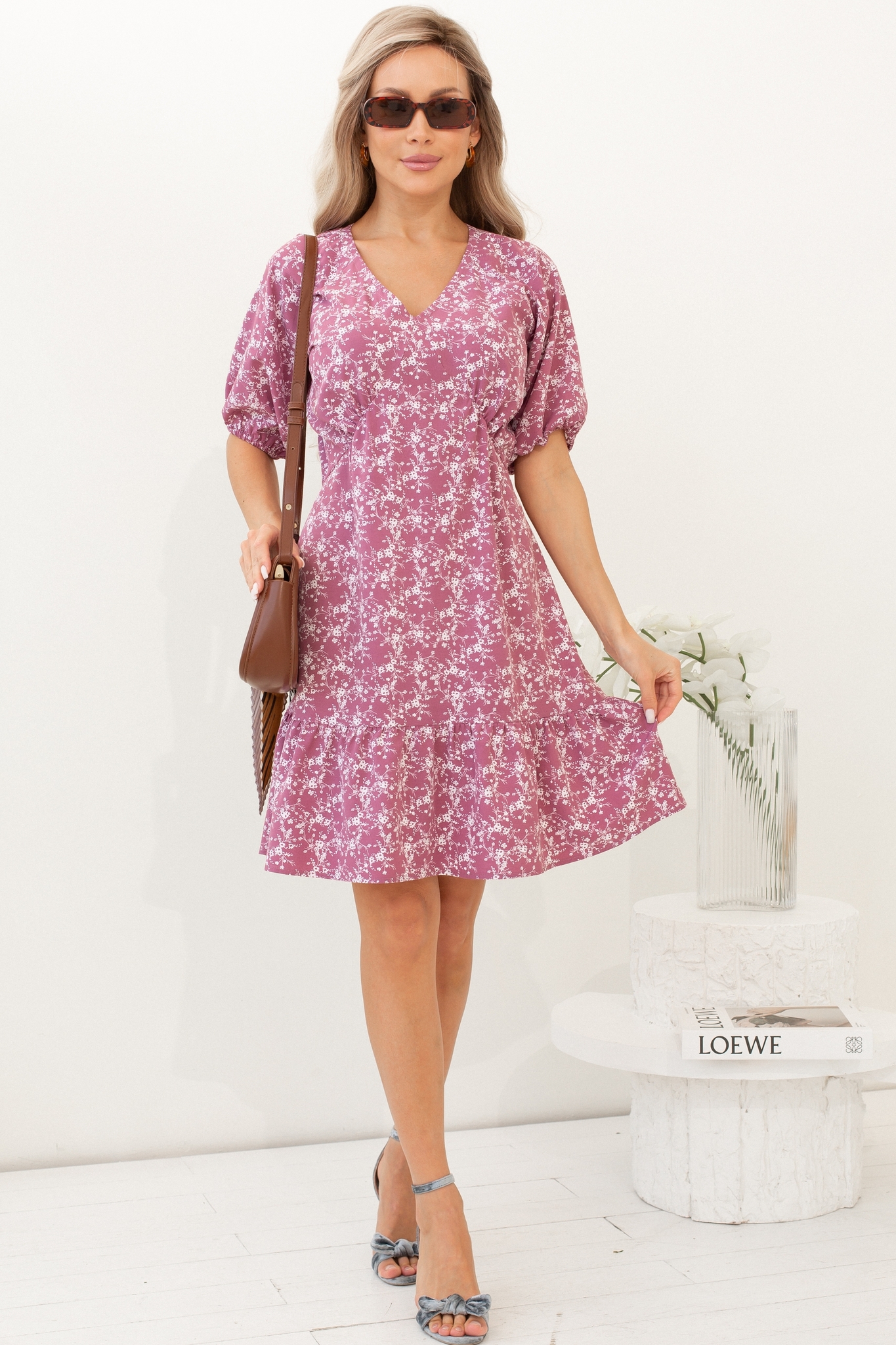Платье приталенного силуэта. Короткий рукав - реглан, присборен на эластичную резину. V - образная горловина на внутренней обтачке. Модель отрезная под грудью и присборена на резину. Низ платья оформлен притачным воланом.