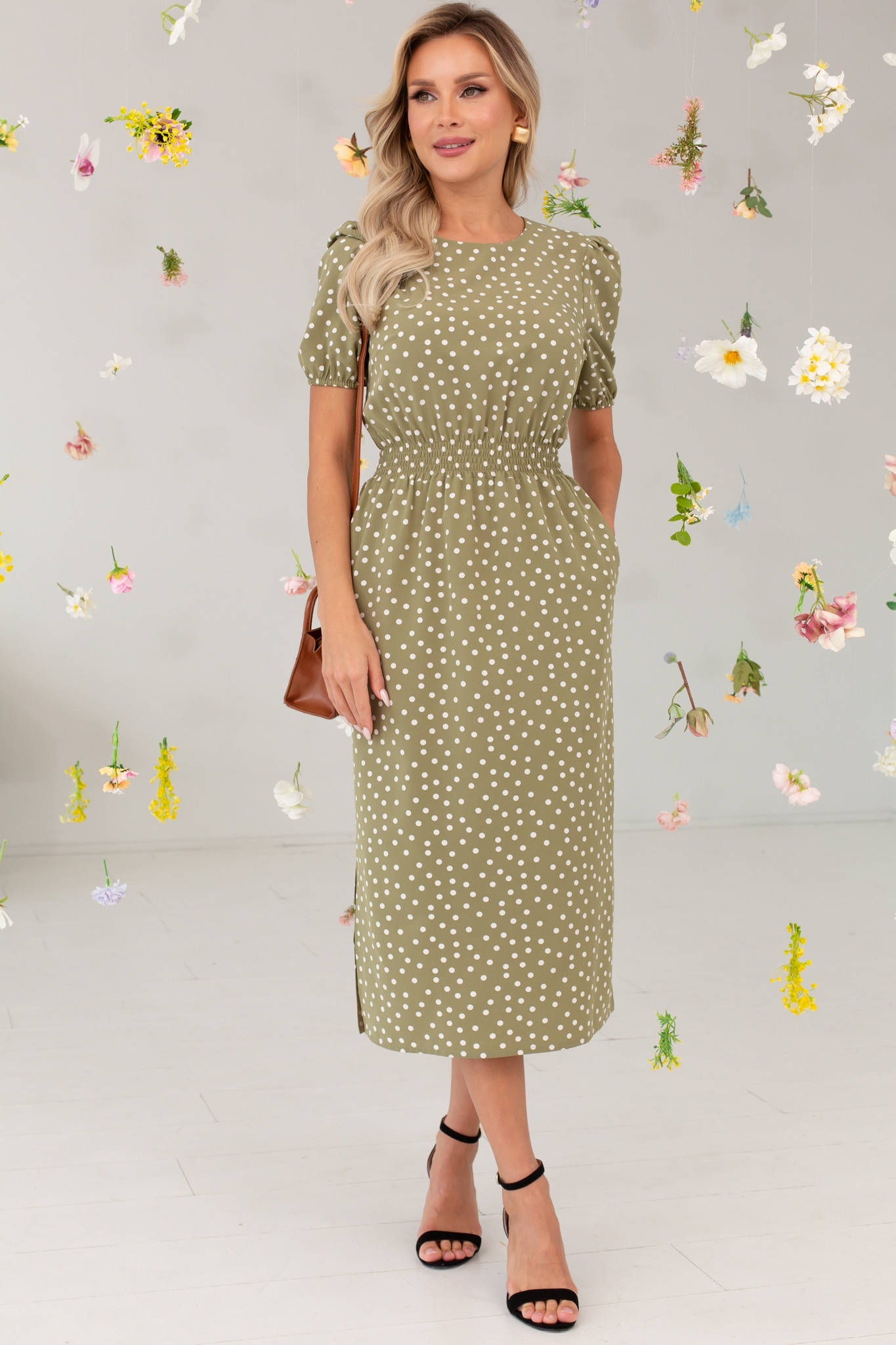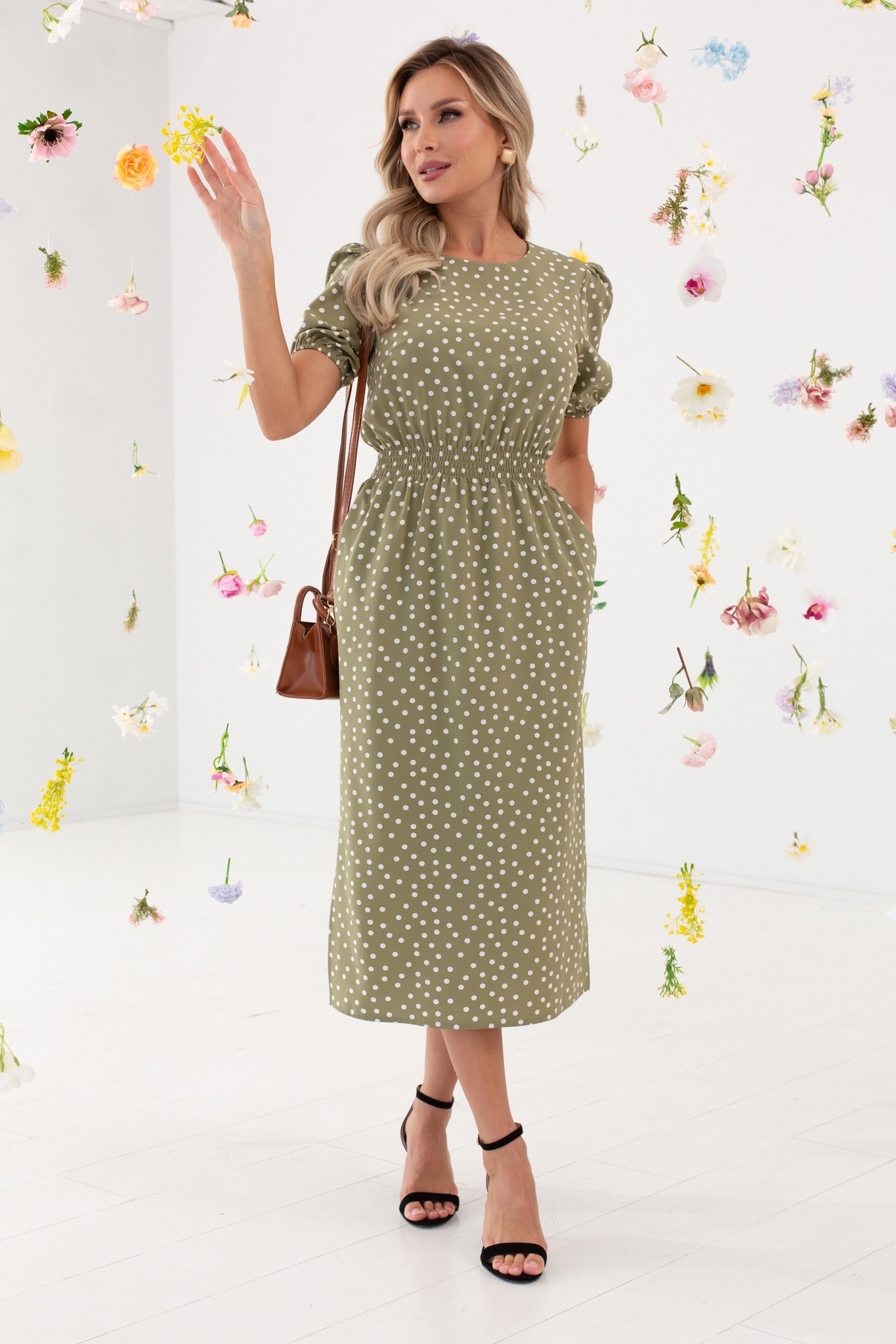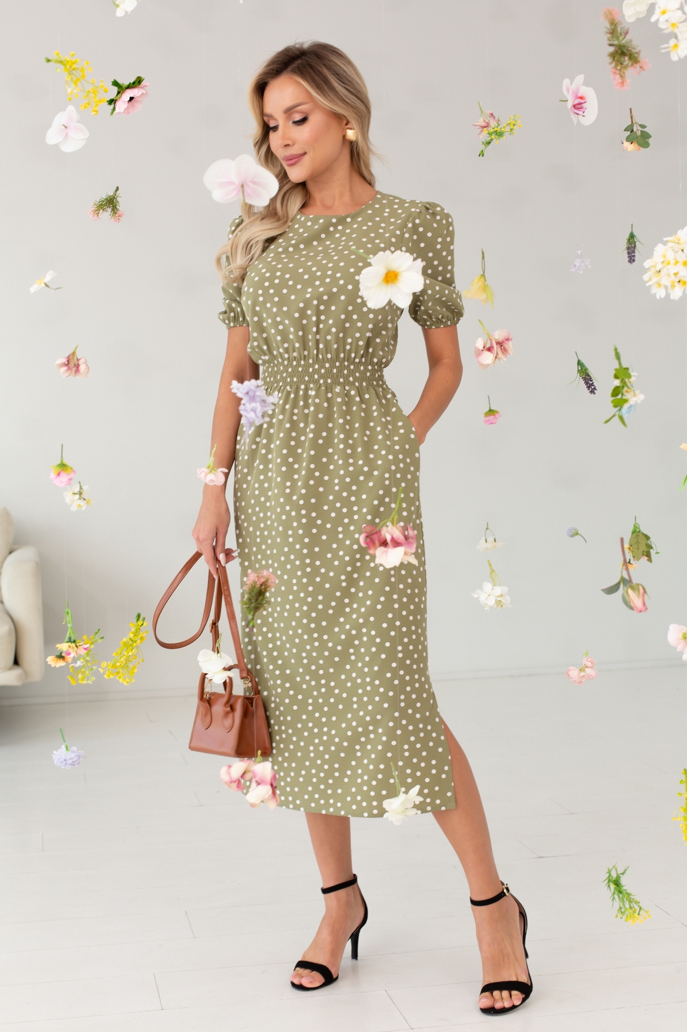 Красивое платье приталенного силуэта добавит Вашему образу женственности и шарма. Округлая горловина на внутренней обтачке с застежкой по спинке на петлю и пуговицу. Короткий втачной рукав - фонарик присборен на эластичную резинку. Модель отрезная по линии талии. В боковых швах функциональные карманы. По талии проложена эластичная резинка в несколько рядов, что дополнительно подчеркнет Ваш силуэт. Низ ровный, по бокам разрезы.