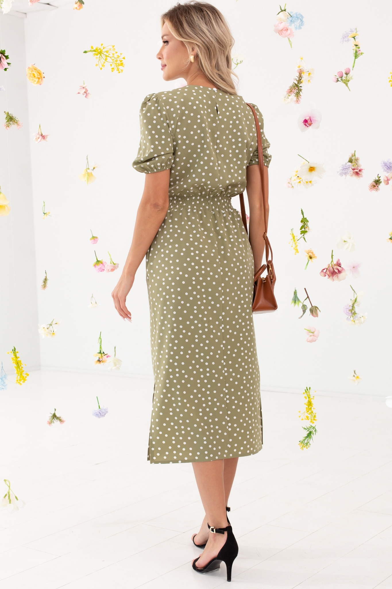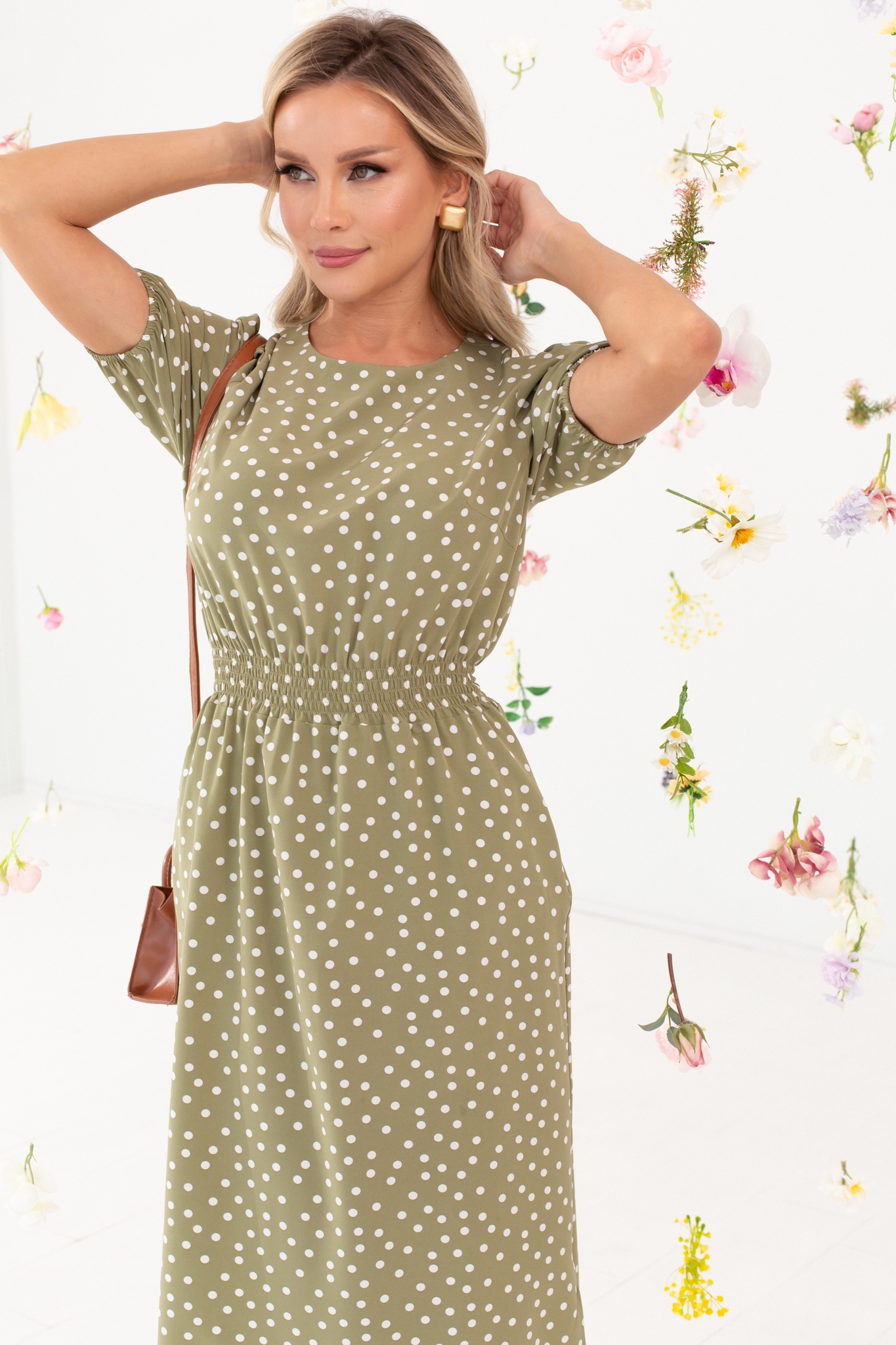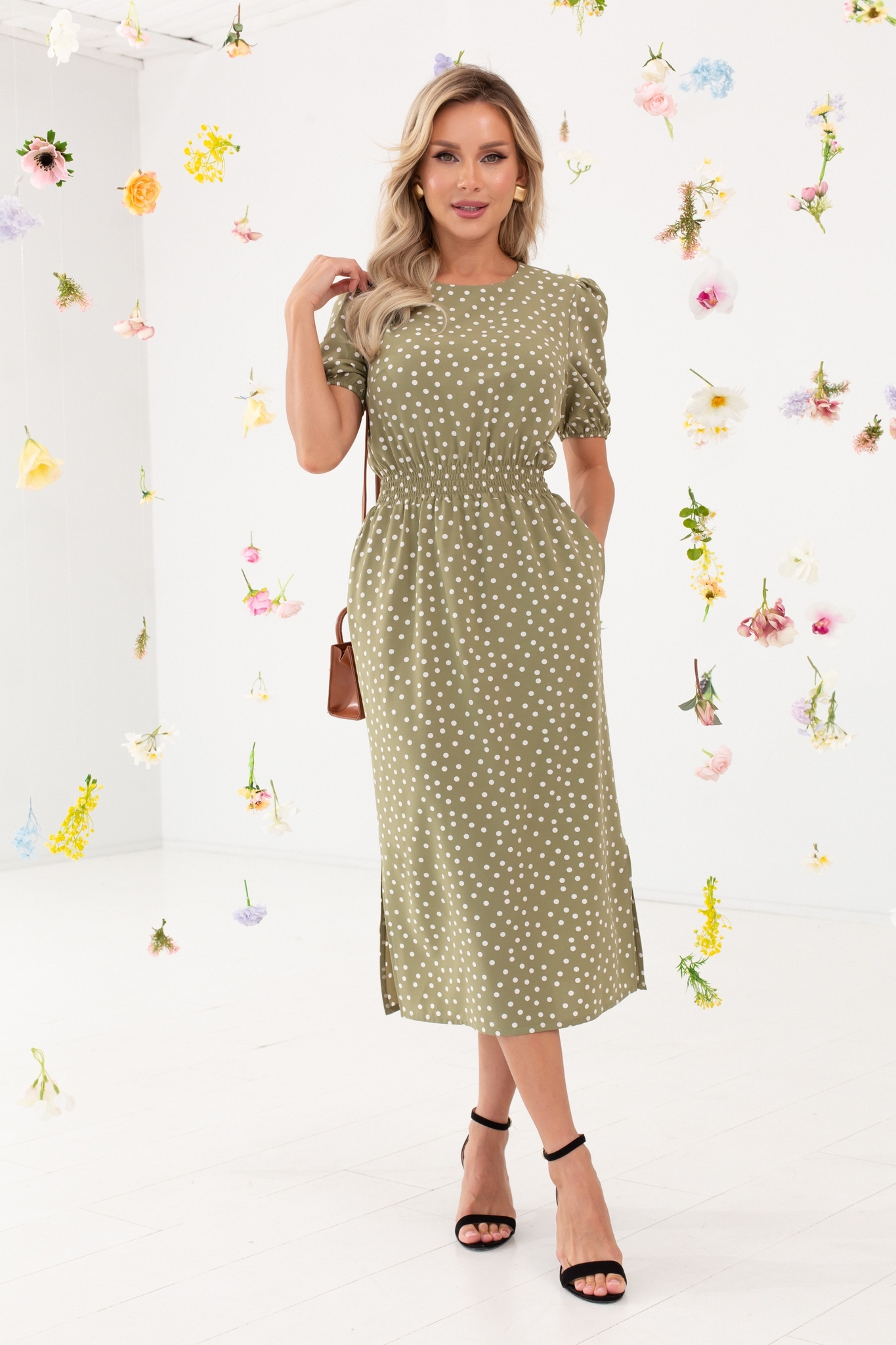 Красивое платье приталенного силуэта добавит Вашему образу женственности и шарма. Округлая горловина на внутренней обтачке с застежкой по спинке на петлю и пуговицу. Короткий втачной рукав - фонарик присборен на эластичную резинку. Модель отрезная по линии талии. В боковых швах функциональные карманы. По талии проложена эластичная резинка в несколько рядов, что дополнительно подчеркнет Ваш силуэт. Низ ровный, по бокам разрезы.