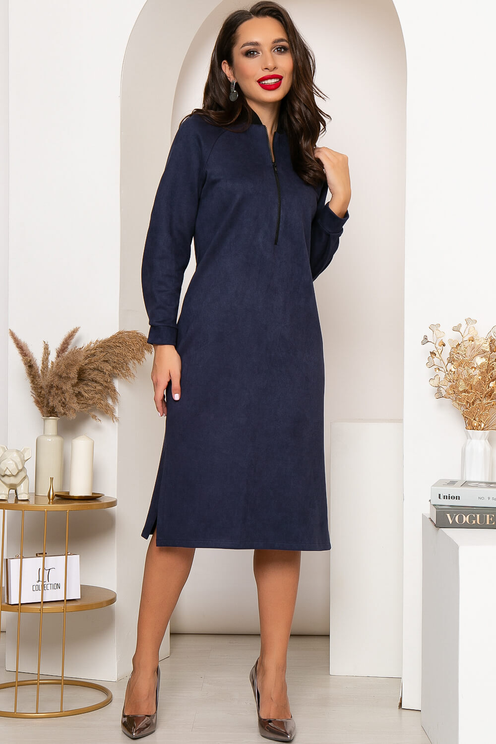 Стильное платье прямого силуэта, невероятно приятное на ощупь. Рукав реглан оканчивается притачной манжетой. Воротник выполнен из эластичной трикотажной резинки — кашкорсе. По переду застёгивается на молнию. Низ ровный, по бокам разрезы. При помощи пояса, входящего в комплект, можно подчеркнуть талию.
