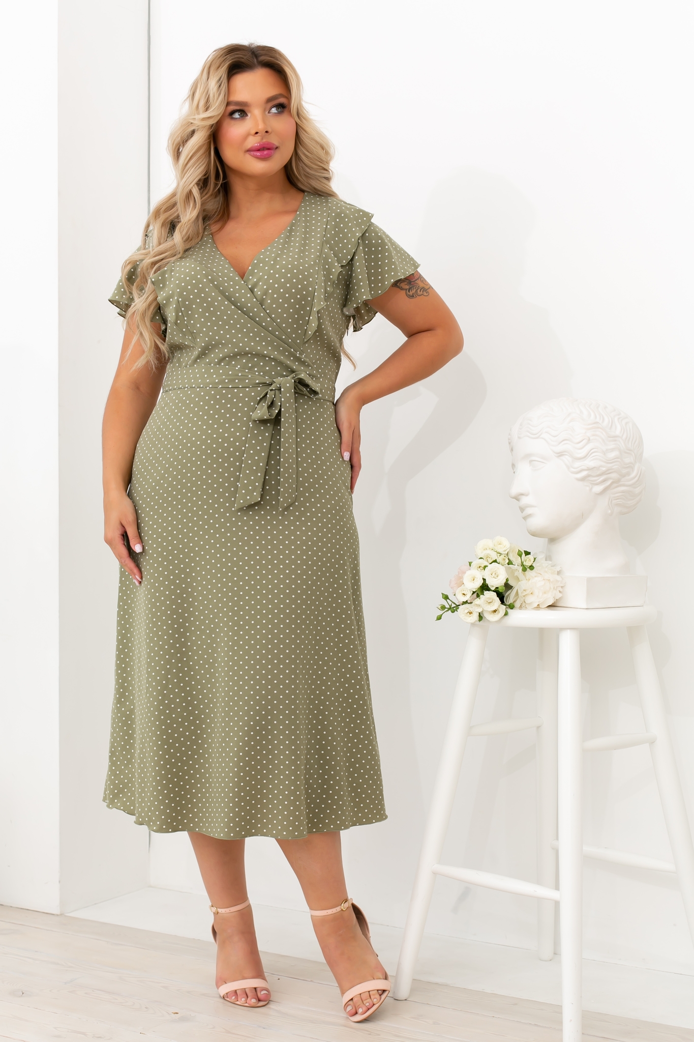 Красивое летнее платье приталенного силуэта. Модель отрезная по линии талии. V - образная горловина переходящая на запах. Короткий втачной рукав. Лиф декорирован втачной рюшей. Низ ровный, без разрезов. Сбоку застежка на потайную молнию. Пояс из основного материала в комплекте.