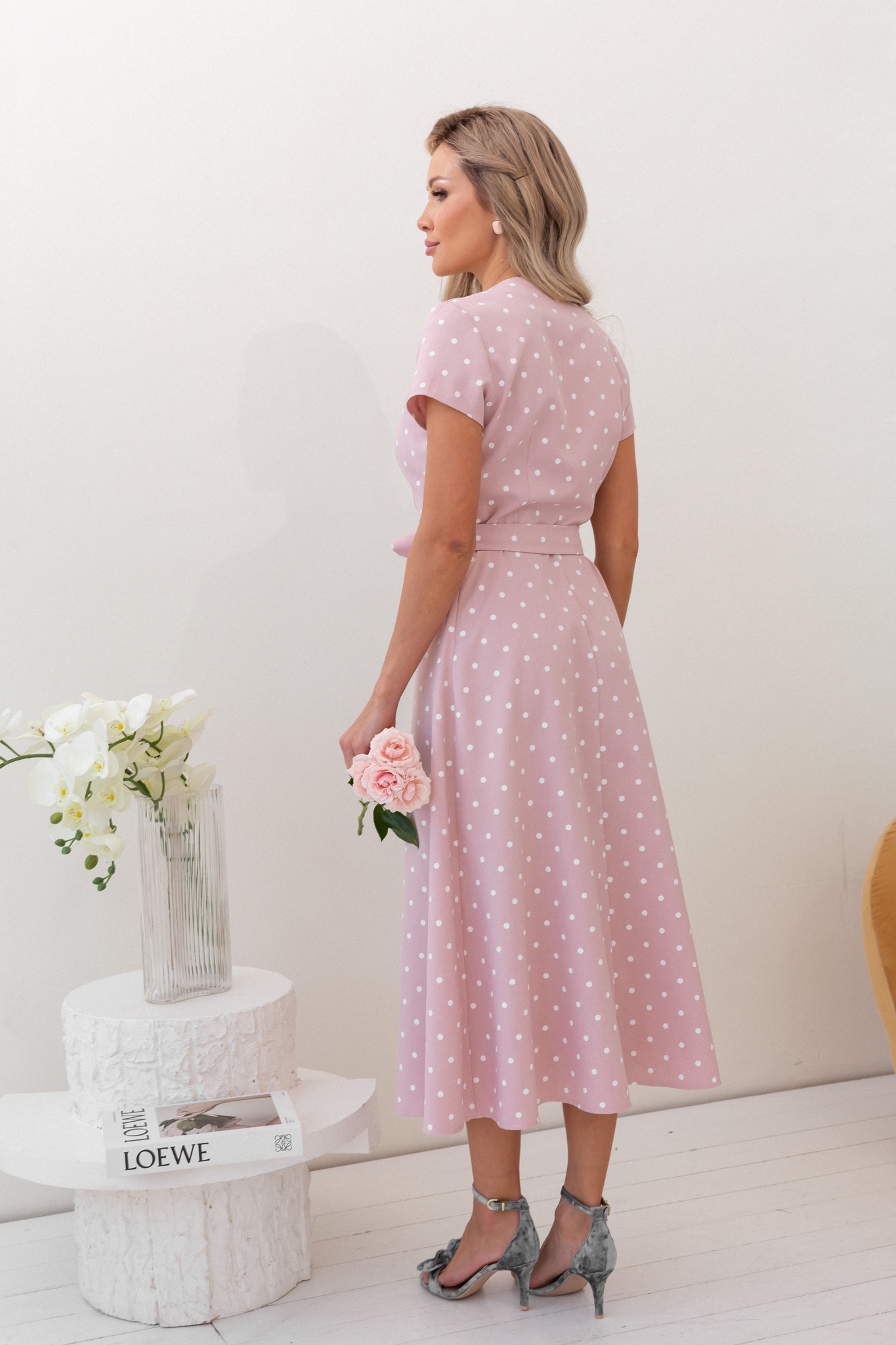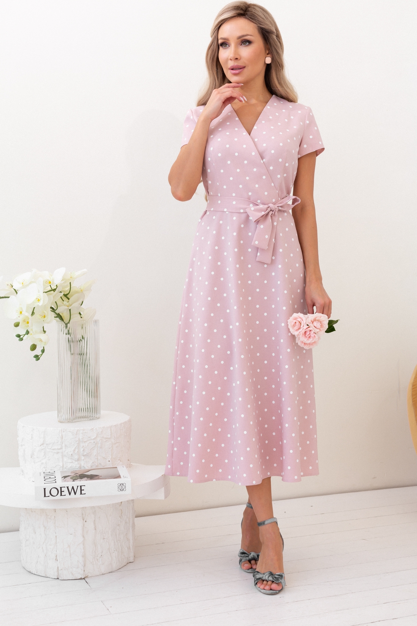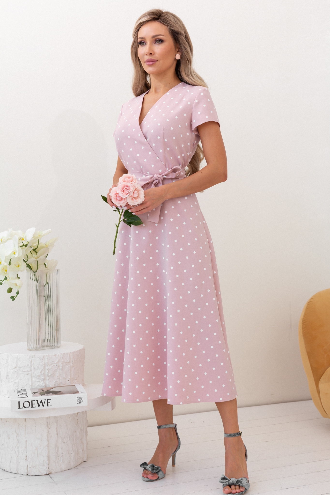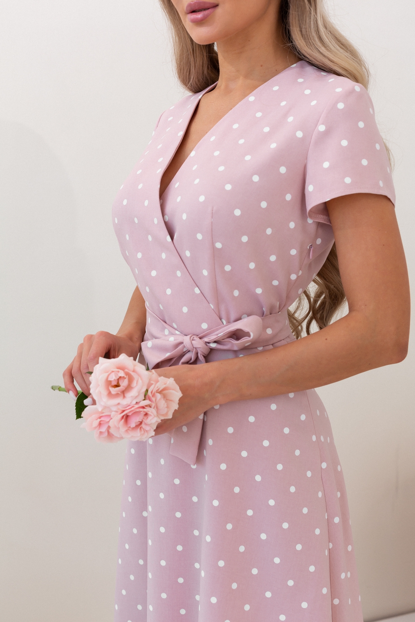 Комфортное платье приталенного силуэта. V - образная горловина на внутренней обтачке переходящая в запах. Короткий втачной рукав. Модель отрезная по линии талии, сбоку застежка на потайную молнию. Низ ровный, без разрезов. Пояс из основного материала в комплекте.