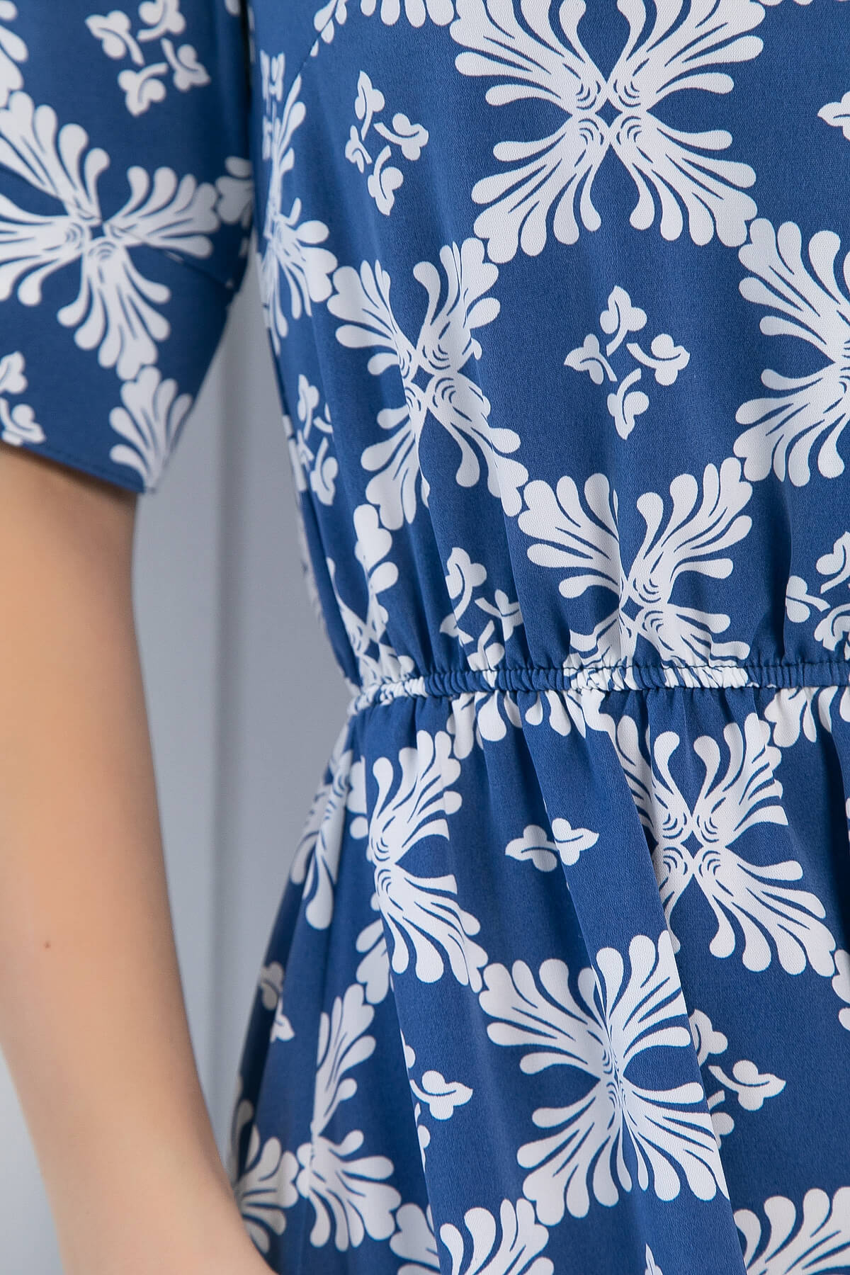 Элегантное платье средней длины станет прекрасным дополнением к вашему гардеробу. Оно отличается рубашечным воротником и рукавами три четверти на манжете, что придает ему стильный и современный вид. В комплекте с платьем идет пояс из основной ткани, который подчеркивает вашу талию и создает гармоничный силуэт. По талии резинка.
