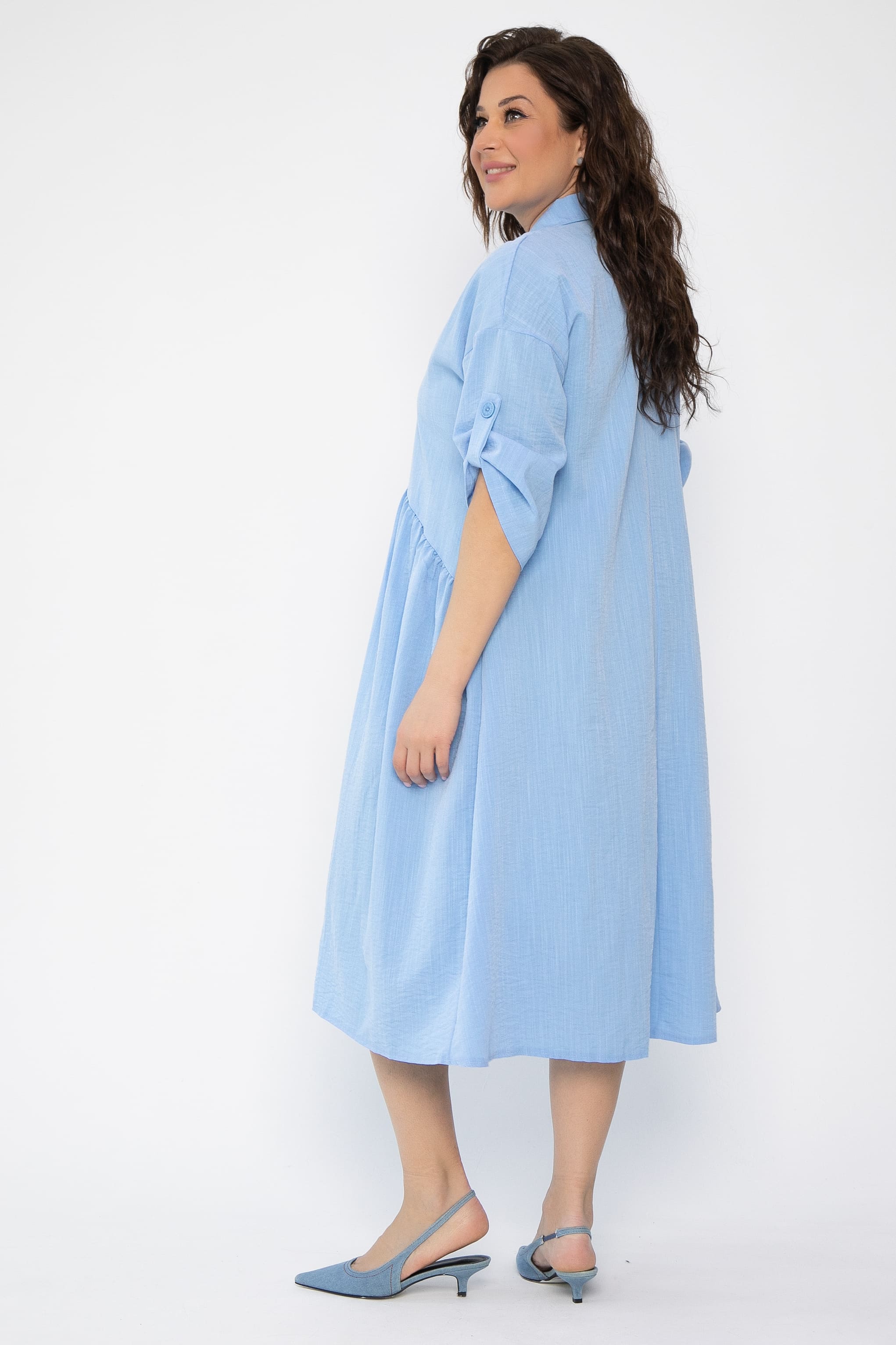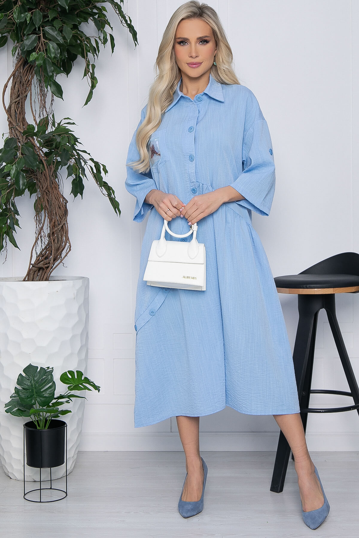 Стильное платье придаст вам привлекательности, при этом образ получится достаточно сдержанным и комфортным. Платье будет отлично смотреться даже без аксессуаров, украшает образ карман с декором. Рукав втачной со спущенным плечевым швом, длина - три четверти, подворачивается на пату. Функциональные пуговицы только в верхней части платья, по юбке присутствует имитация застежки.