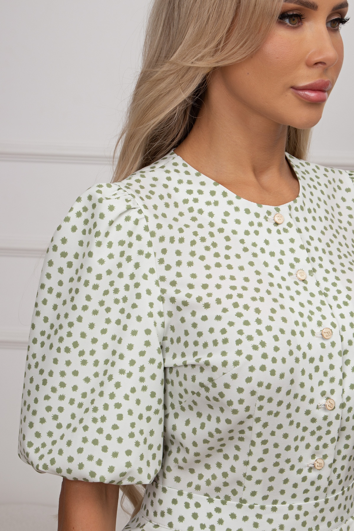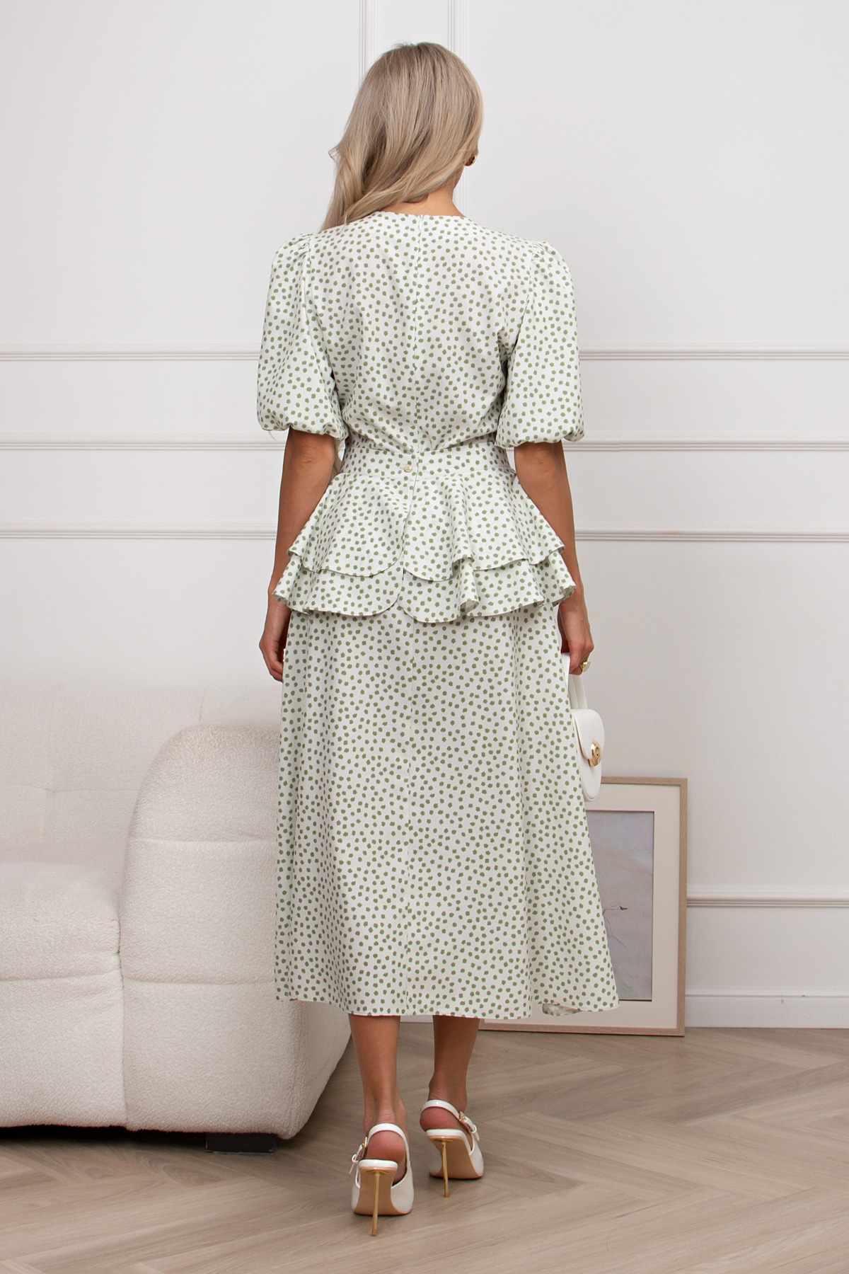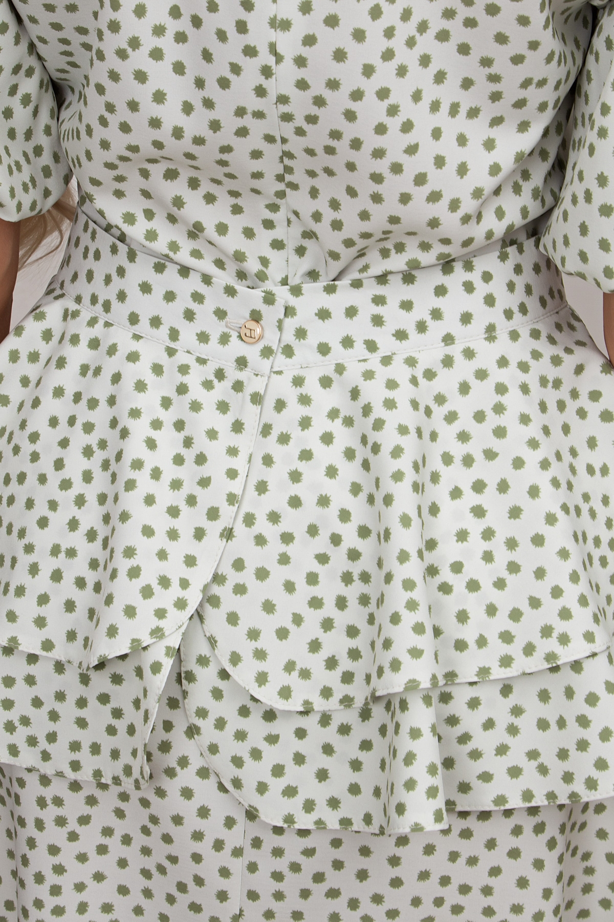 Романтичное летнее платье со съемной баской изготовлено из текстильного полотна. Округлая горловина на внутренней обтачке переходящая в планку с застежкой на петли и пуговицы. Втачной рукав - фонарик на подкладке. Модель обрезная по линии талии. В среднем шве спинки застежка на потайную молнию. Низ ровный,без разрезов.