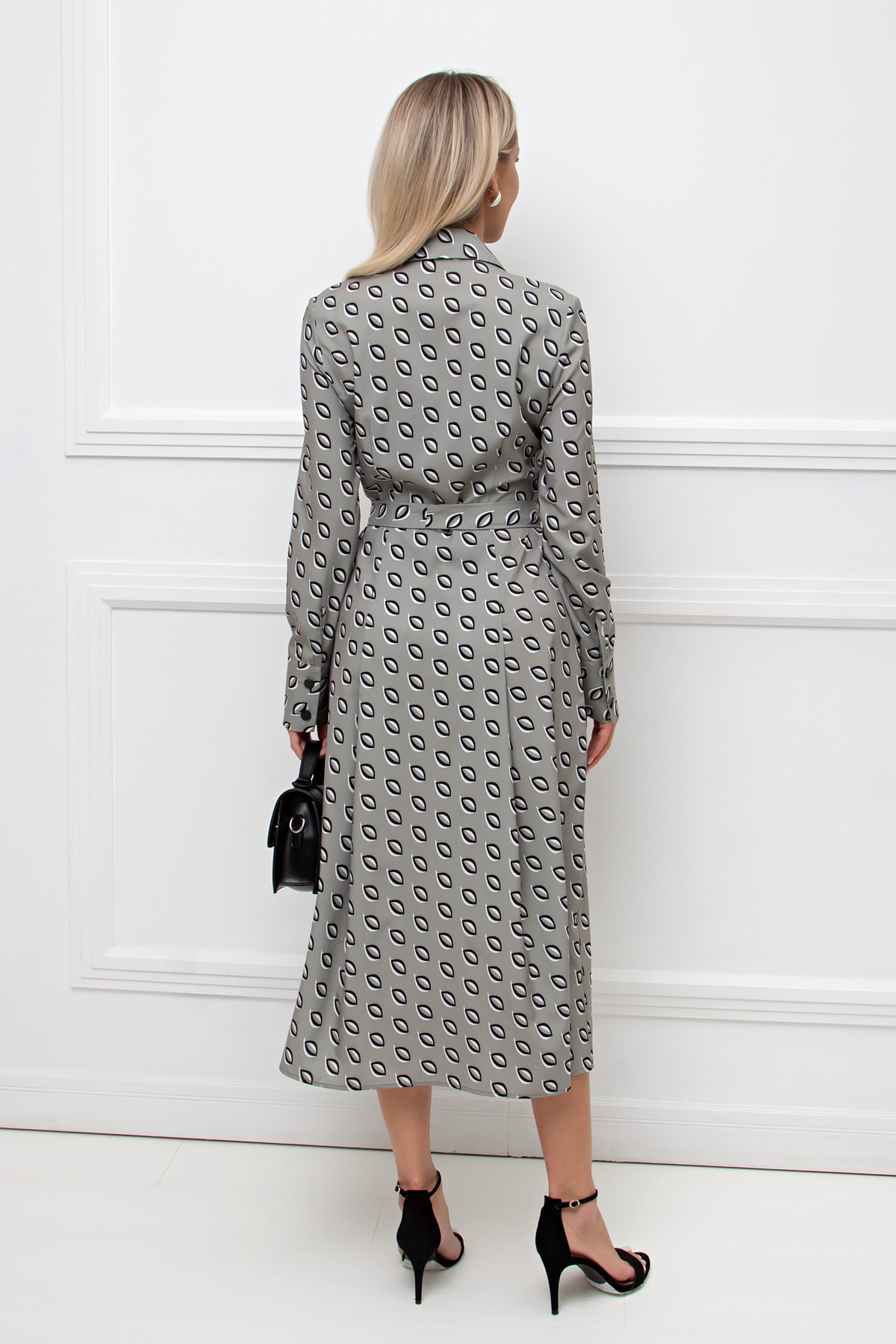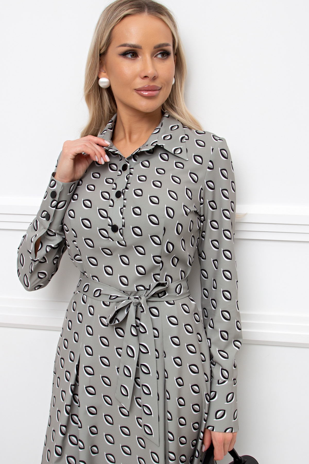 Женственное платье приталенного силуэта. Горловина оформлена отложным воротником на стойке. По переду втачная планка с застежкой на петли и пуговицы. Длинный втачной рукав оканчивается притачной манжетой. Модель отрезная по линии талии, с боку застежка на потайную молнию. Юбка дополнена встречными складками. Пояс из основной ткани в комплекте.