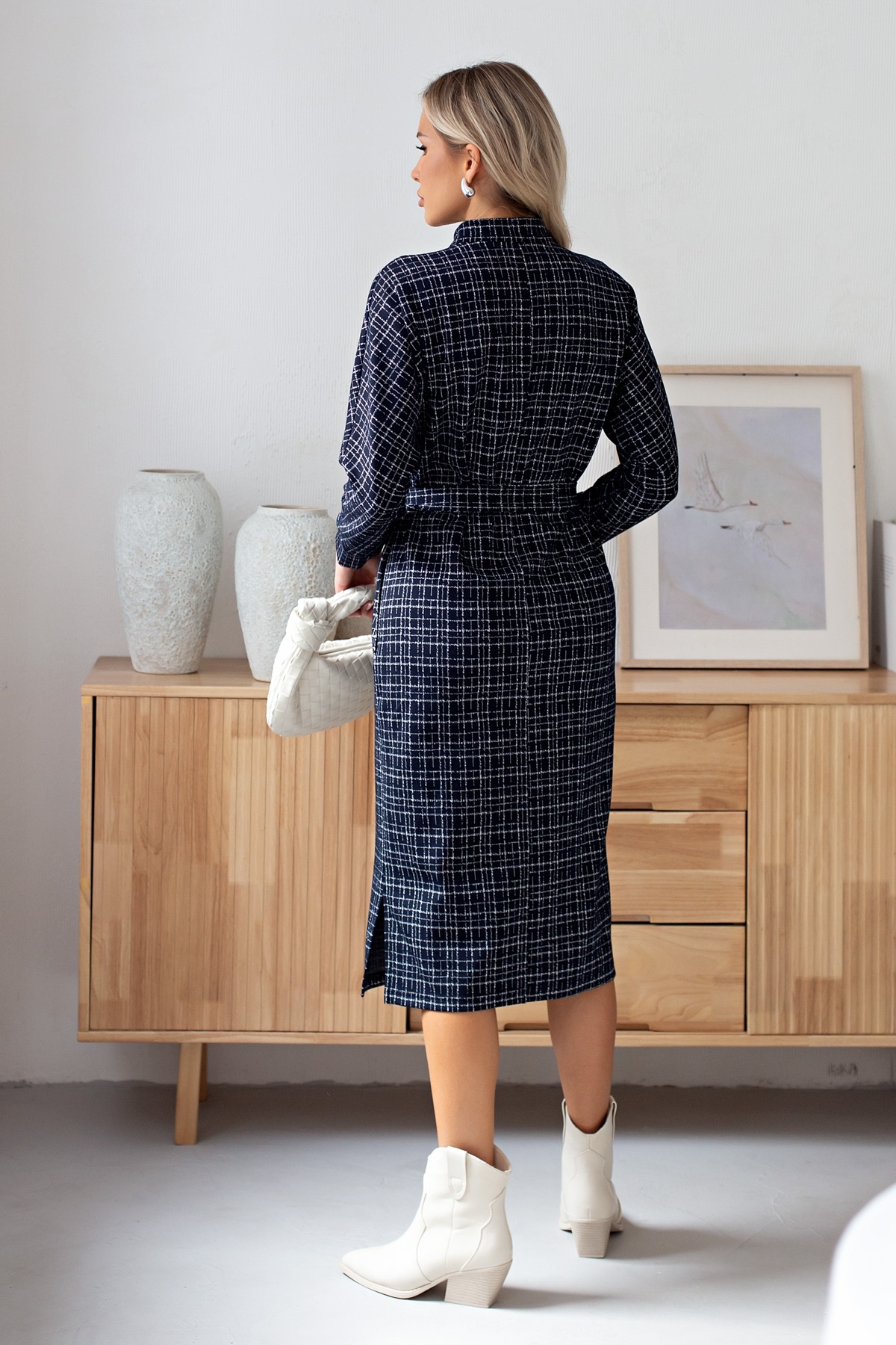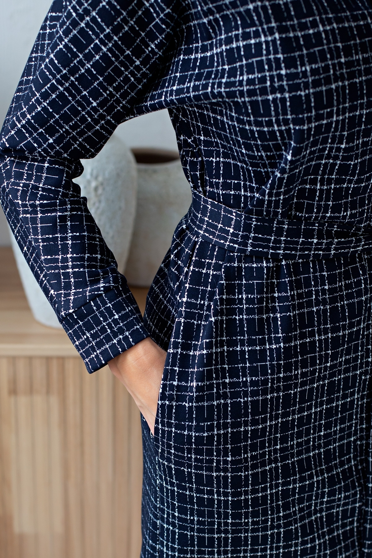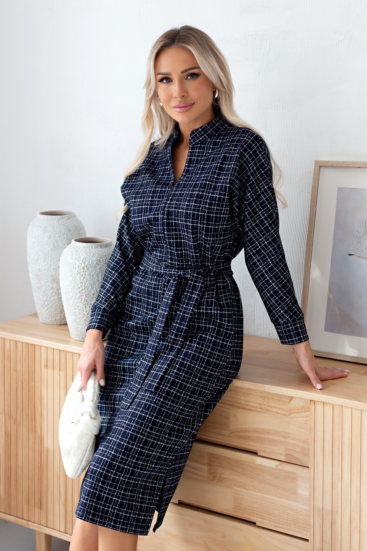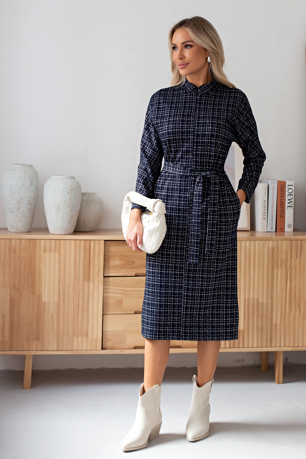 Лаконичное платье прямого силуэта выполнено из трикотажного полотна. Длинный цельнокроеный рукав летучая мышь, оканчивается притачной манжетой. Горловина оформлена воротником - стойка. По переду застежка на потайную молнию. По боковым швам расположены функциональные карманы. Низ ровный, по бокам разрезы. Пояс из основного материала в комплекте.