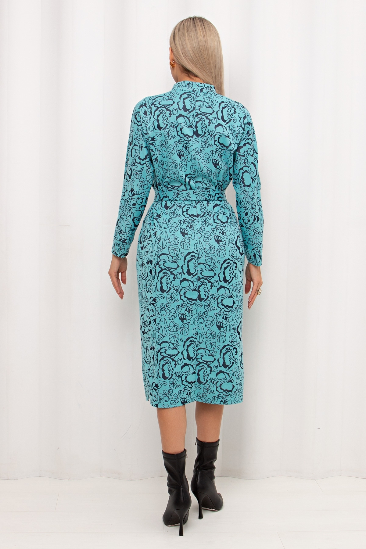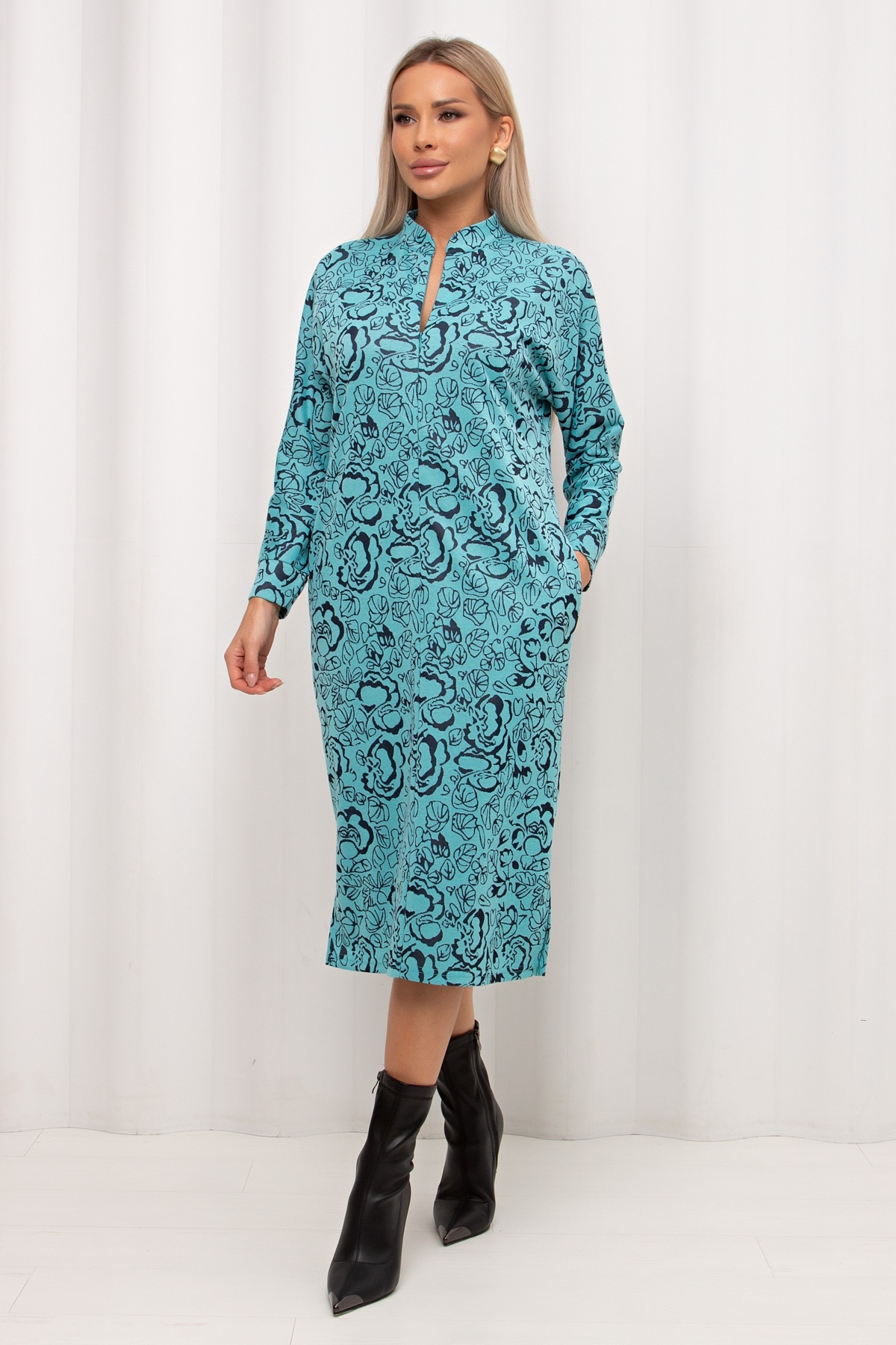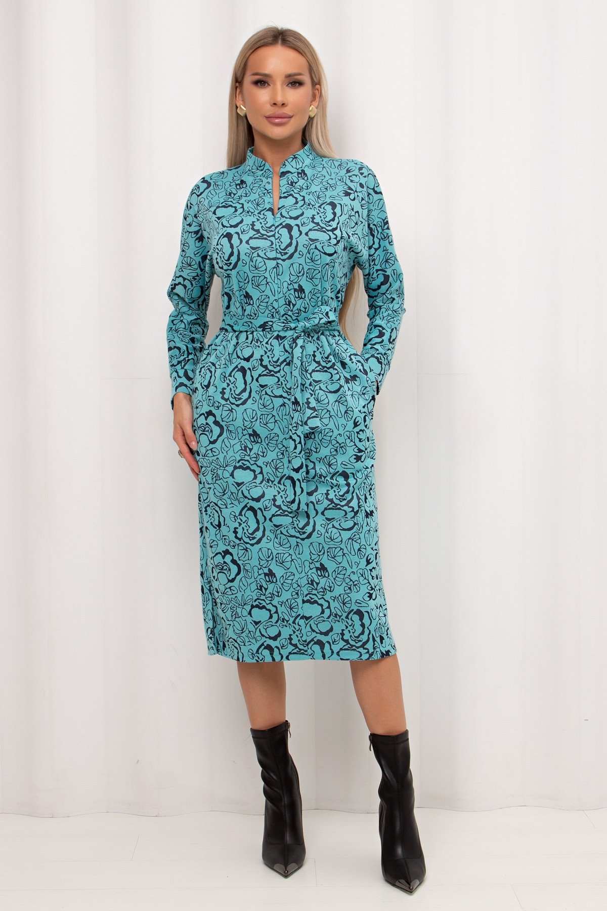 Лаконичное платье прямого силуэта выполнено из трикотажного полотна. Длинный цельнокроеный рукав летучая мышь, оканчивается притачной манжетой. Горловина оформлена воротником - стойка. По переду застежка на потайную молнию. По боковым швам расположены функциональные карманы. Низ ровный, по бокам разрезы. Пояс из основного материала в комплекте.