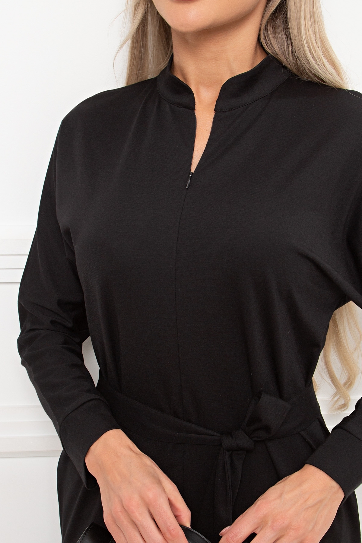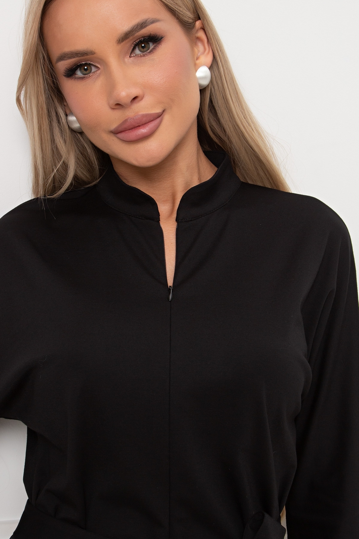 Лаконичное платье прямого силуэта выполнено из трикотажного полотна. Длинный цельнокроеный рукав летучая мышь, оканчивается притачной манжетой. Горловина оформлена воротником - стойка. По переду застежка на потайную молнию. По боковым швам расположены функциональные карманы. Низ ровный, по бокам разрезы. Пояс из основного материала в комплекте.