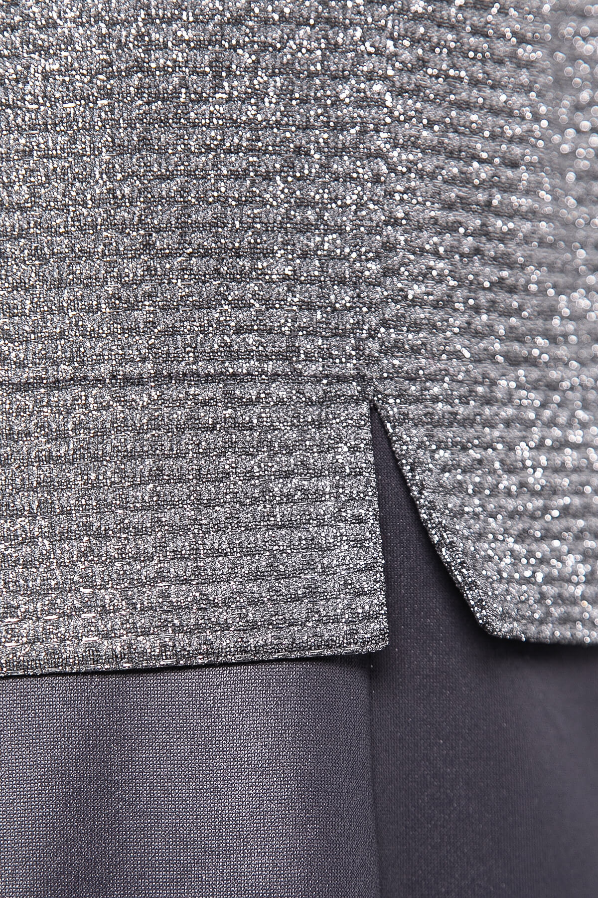 Элегантное нарядное платье с полуприлегающим силуэтом. Верх выполнен из трикотажа с изысканным глиттерным напылением, добавляющим блеск вашему образу. Низ изделия выполнен из плотного, хорошо растяжимого трикотажа. Декоративный элемент в виде разрезов по линии талии придает платью особый шарм. Рукав три четверти дополнен нежными разрезами по низу, создавая стильный акцент.