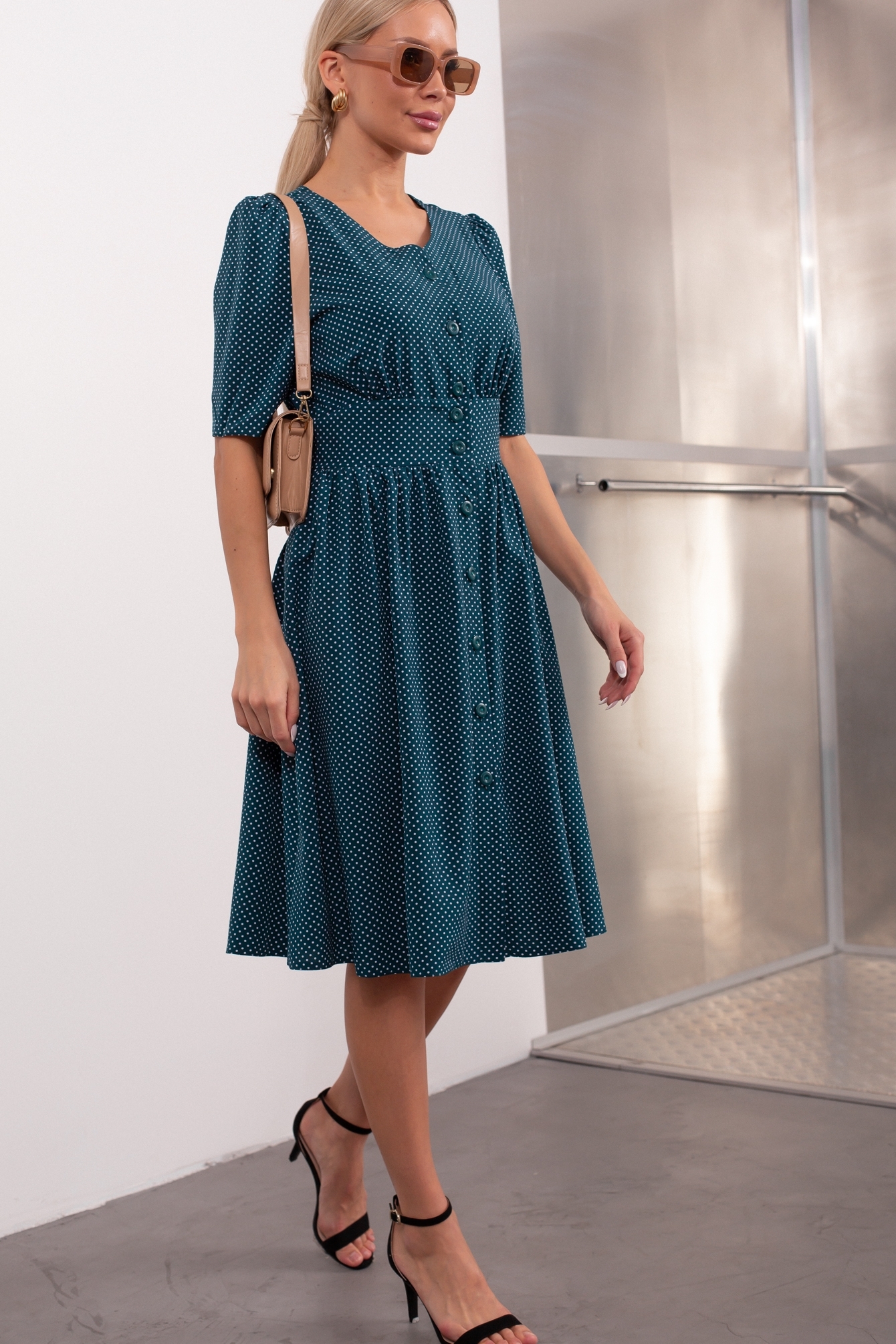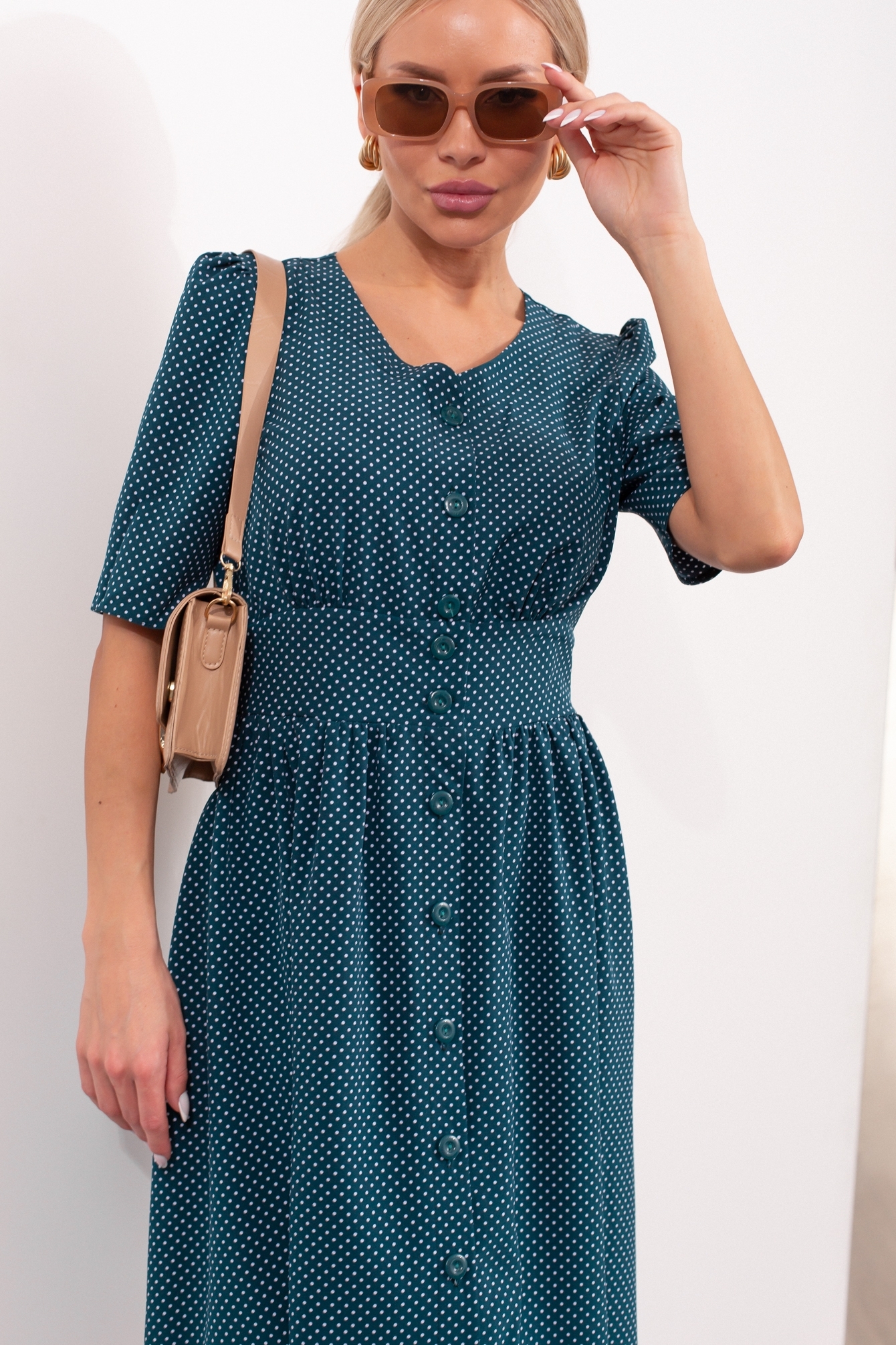 Красивое платье приталенного силуэта из легкой ткани Ниагара с принтом - горох. V - образная горловина переходящая в планку с застежкой на пуговицы. Линию талии подчеркивает притачной пояс. Короткий втачной рукав. Легкое и воздушное платье придаст вам женственности и шарма.