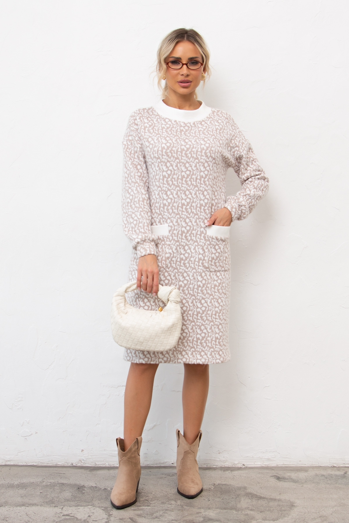 Комфортное платье прямого силуэта выполнено из трикотажного полотна "Ангора". Округлая горловина оформлена стойкой.