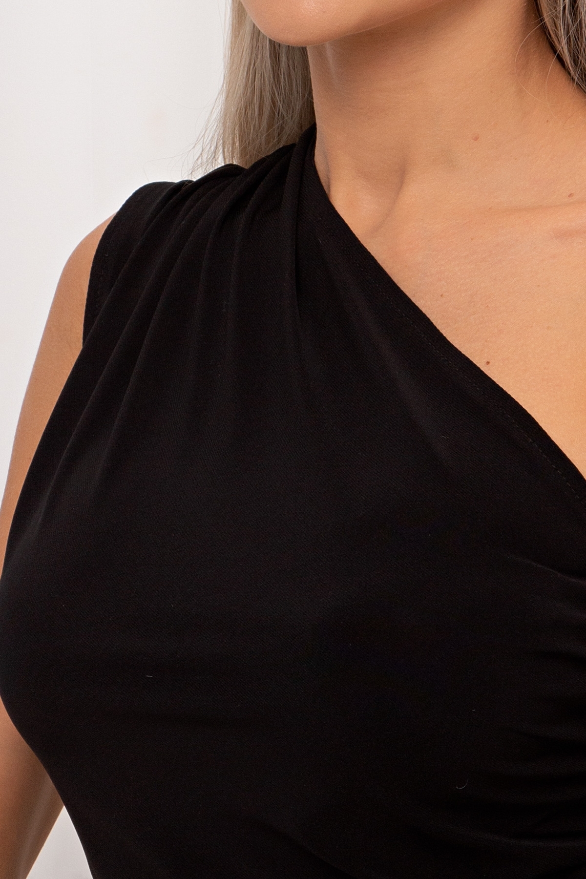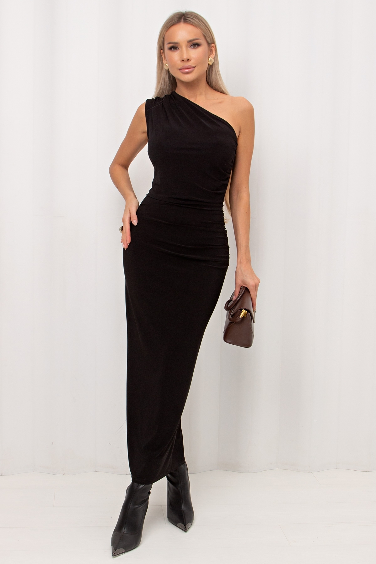 Вечернее платье облегающего силуэта выполнено из легкого трикотажного полотна. Платье на одно плечо, с драпировкой. С боку по ноге разрез.