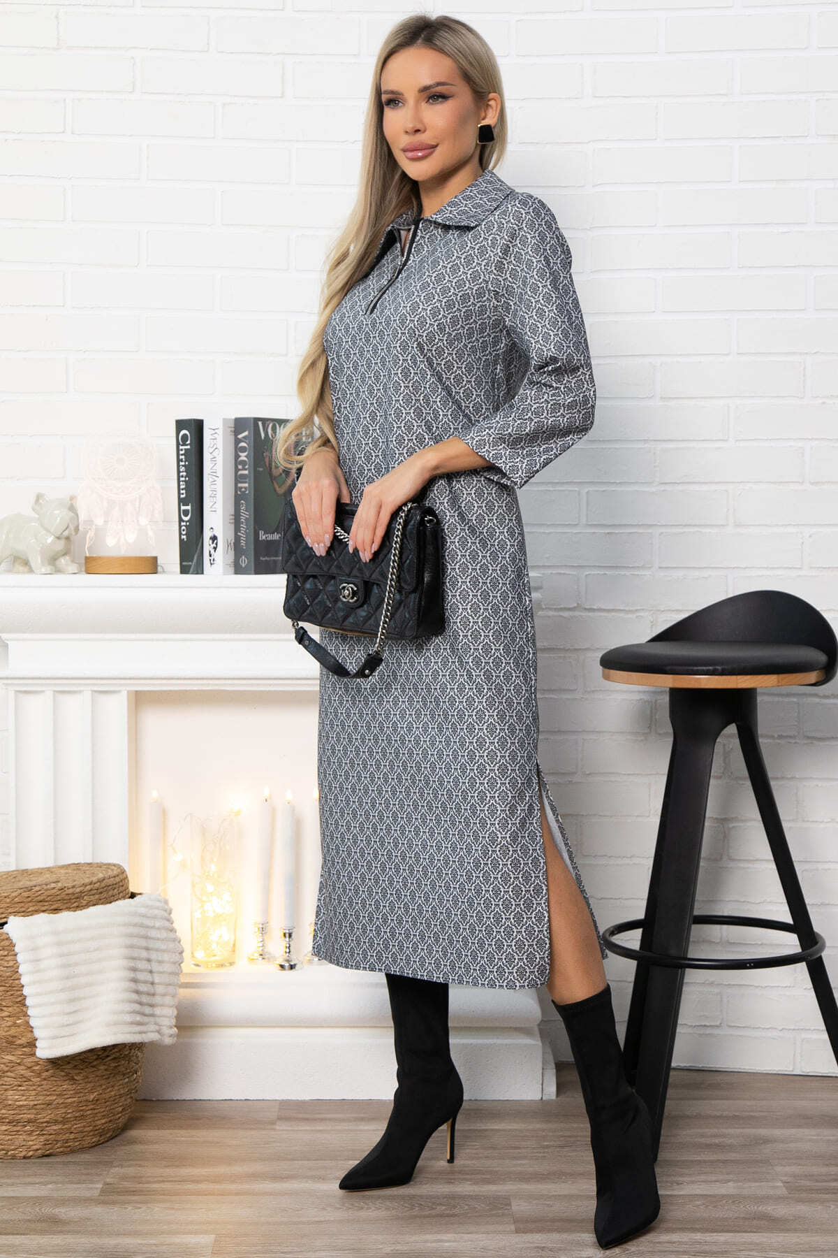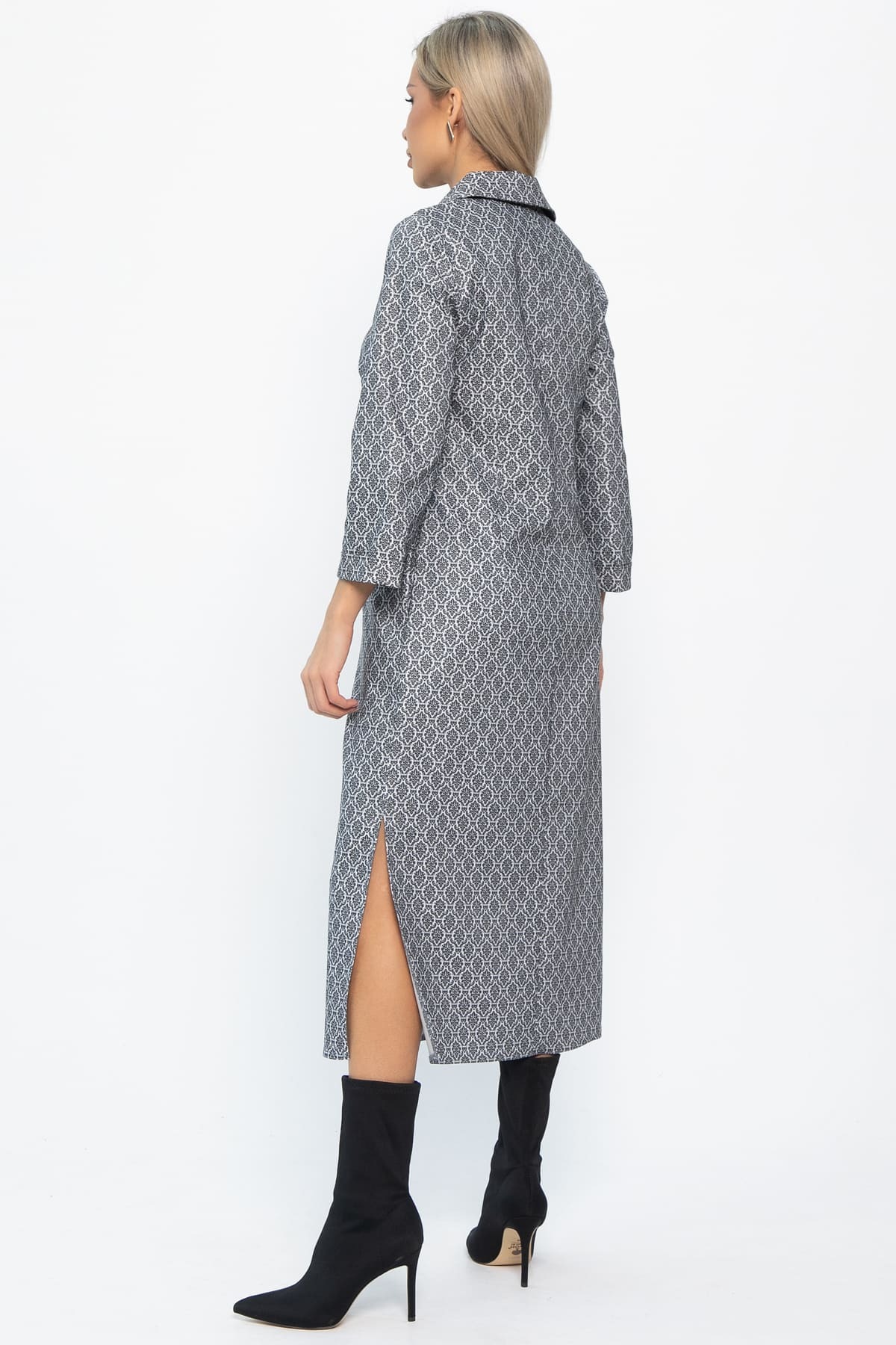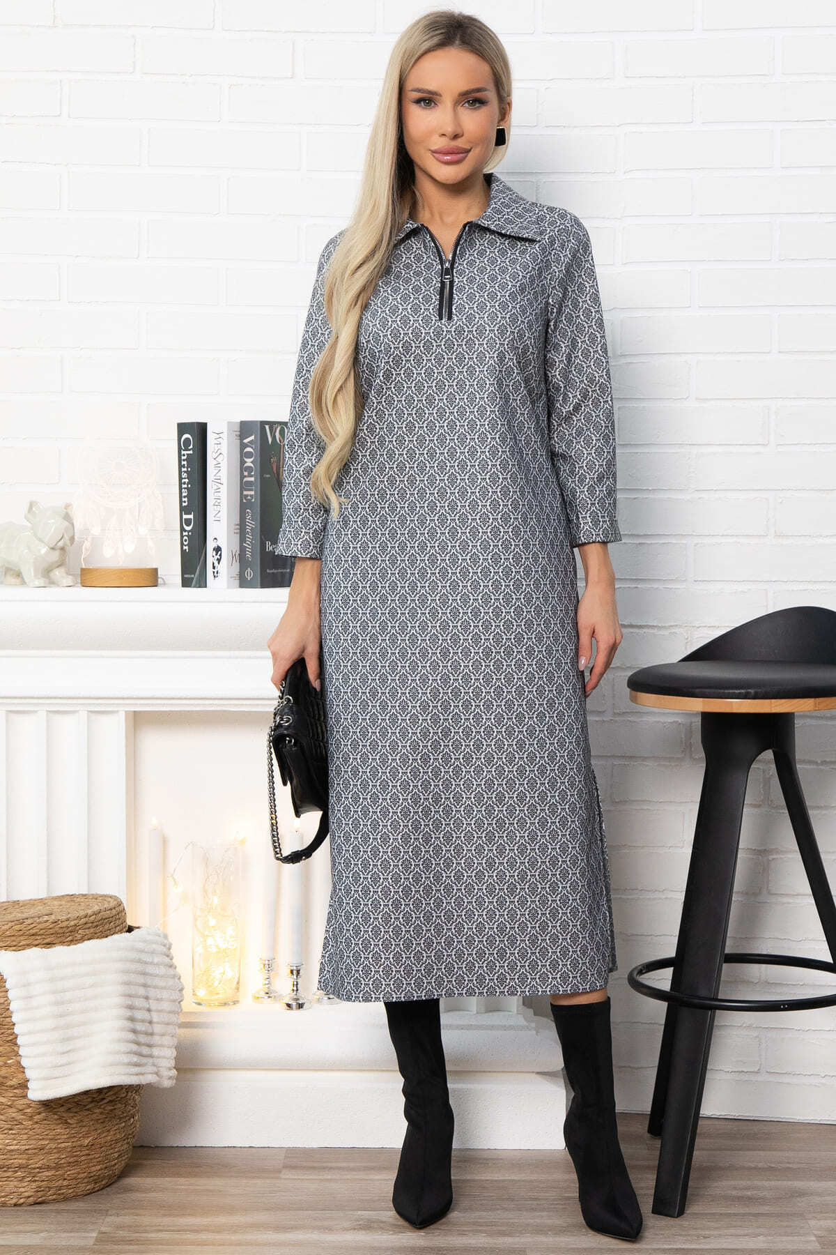 Это платье – ваш универсальный помощник в создании безупречного образа. Удобные боковые разрезы придают образу динамичность и легкость. Рукава втачные длиной 3/4 с манжетами придают платью завершенный вид, а отложной воротничок на горловине добавляет делового шика. Застежка на декоративной молнии по переду подчеркивает современный стиль модели. Это платье прекрасно подходит для офисных будней, а также для повседневного образа.