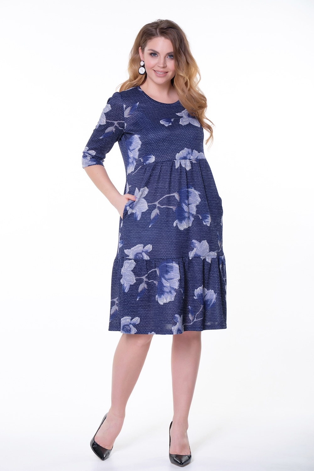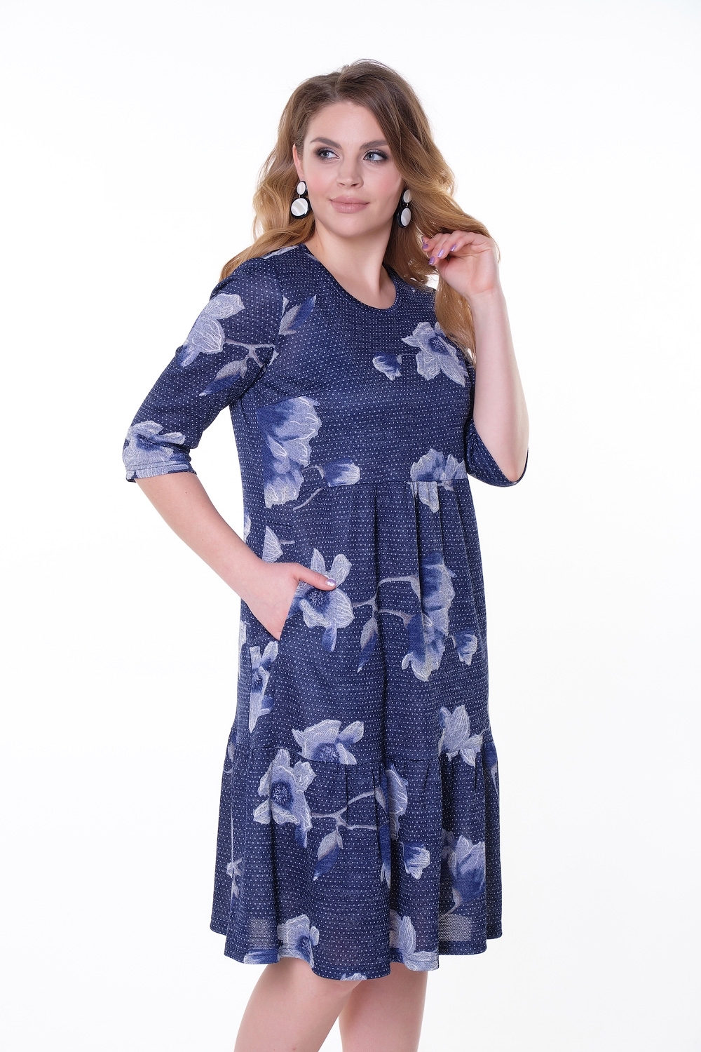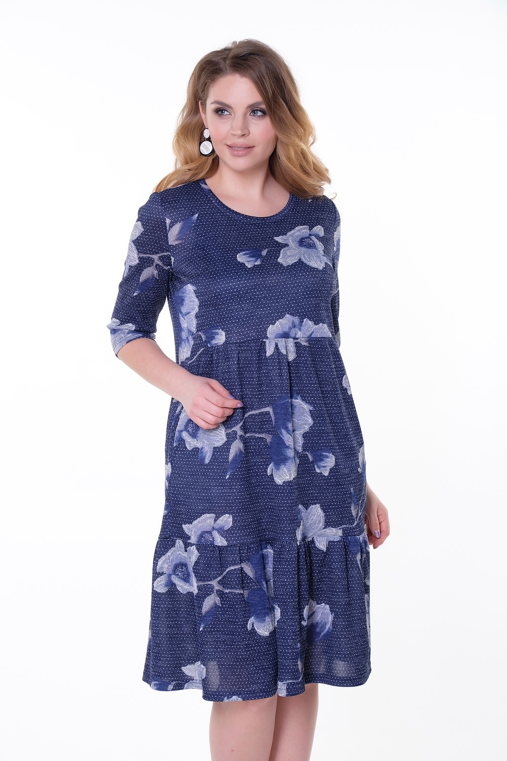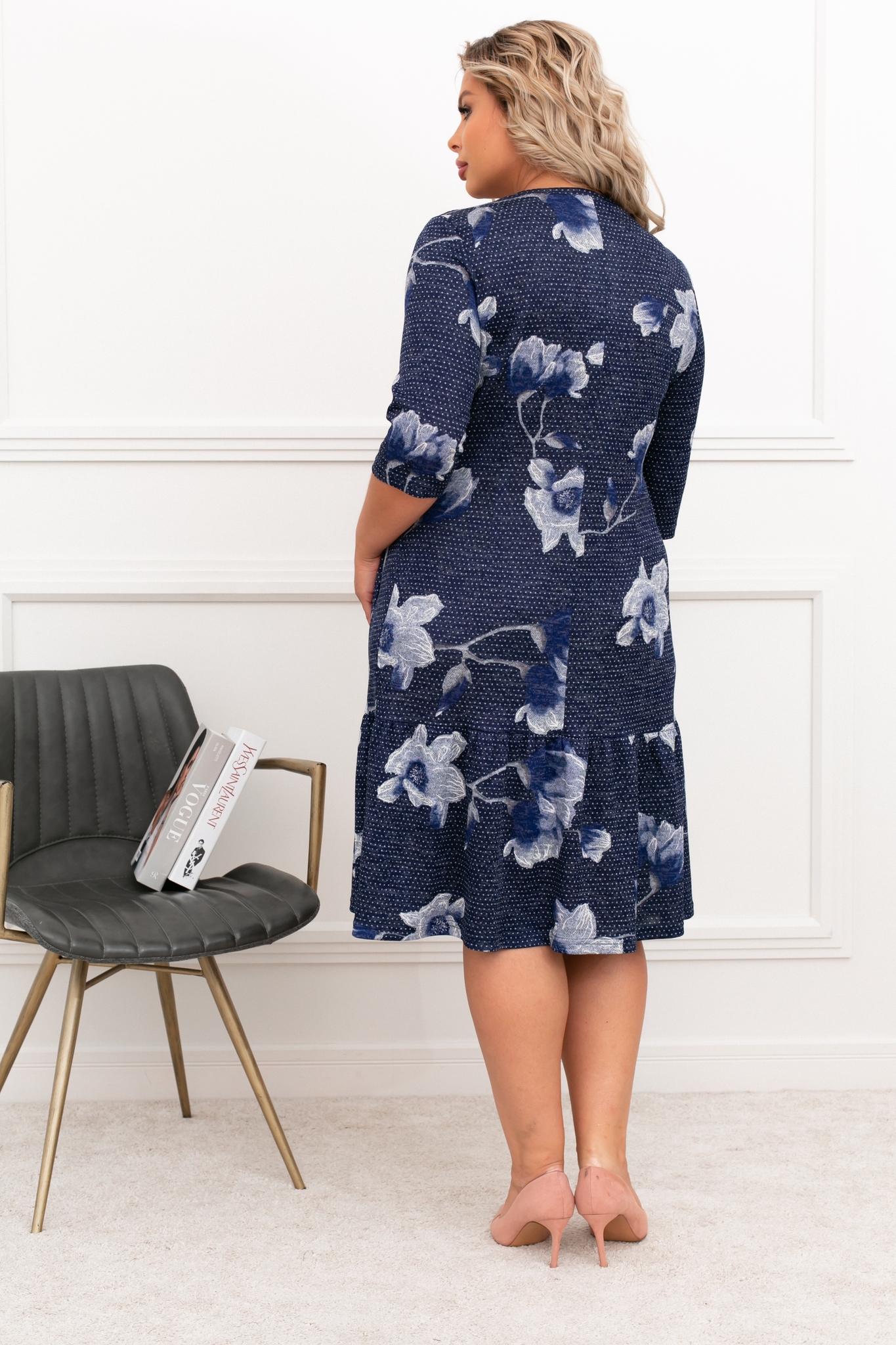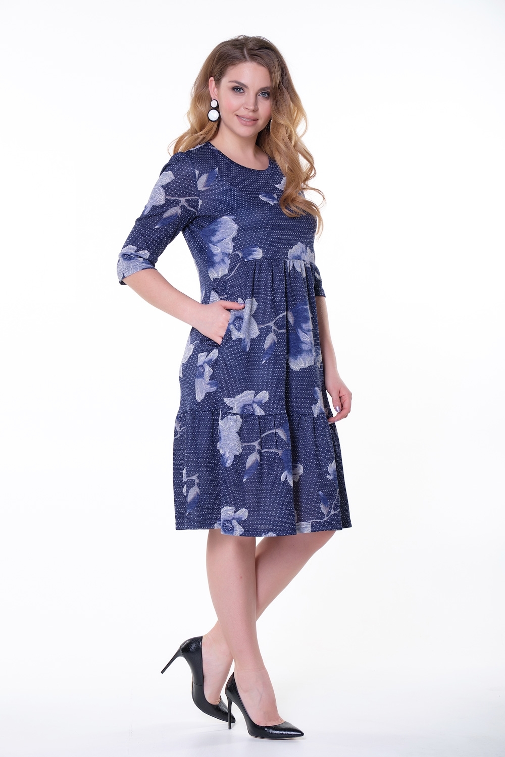 Комфортное платье прямого силуэта из меланжевого трикотажа с цветочным принтом и принтом "горох". Круглая горловина на внутренней обтачке. В боковых швах расположены функциональные карманы. Втачной рукав 3/4. Модель отрезная выше линии талии. Юбка оформлена одним рядом оборок. Модель без застежки. Низ ровный, без разрезов.