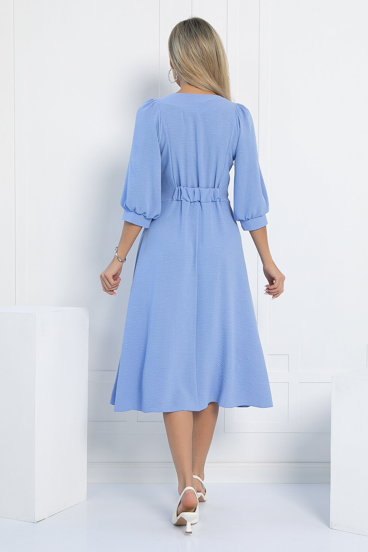 Платье средней длины с приталенным силуэтом станет настоящим украшением вашего гардероба! Благодаря отрезной линии талии оно подчёркивает фигуру, а расклешенная юбка придаёт образу лёгкость и женственность. Рукав-реглан средней длины на сборке завершается изящным манжетом, что делает платье ещё более утончённым. V-образная горловина добавляет в образ нотку изящества. Спереди платье украшено декоративным элементом в виде сборки, которую аккуратно закрывает втачной пояс. Сзади пояс аналогичный и собран на широкую резинку.