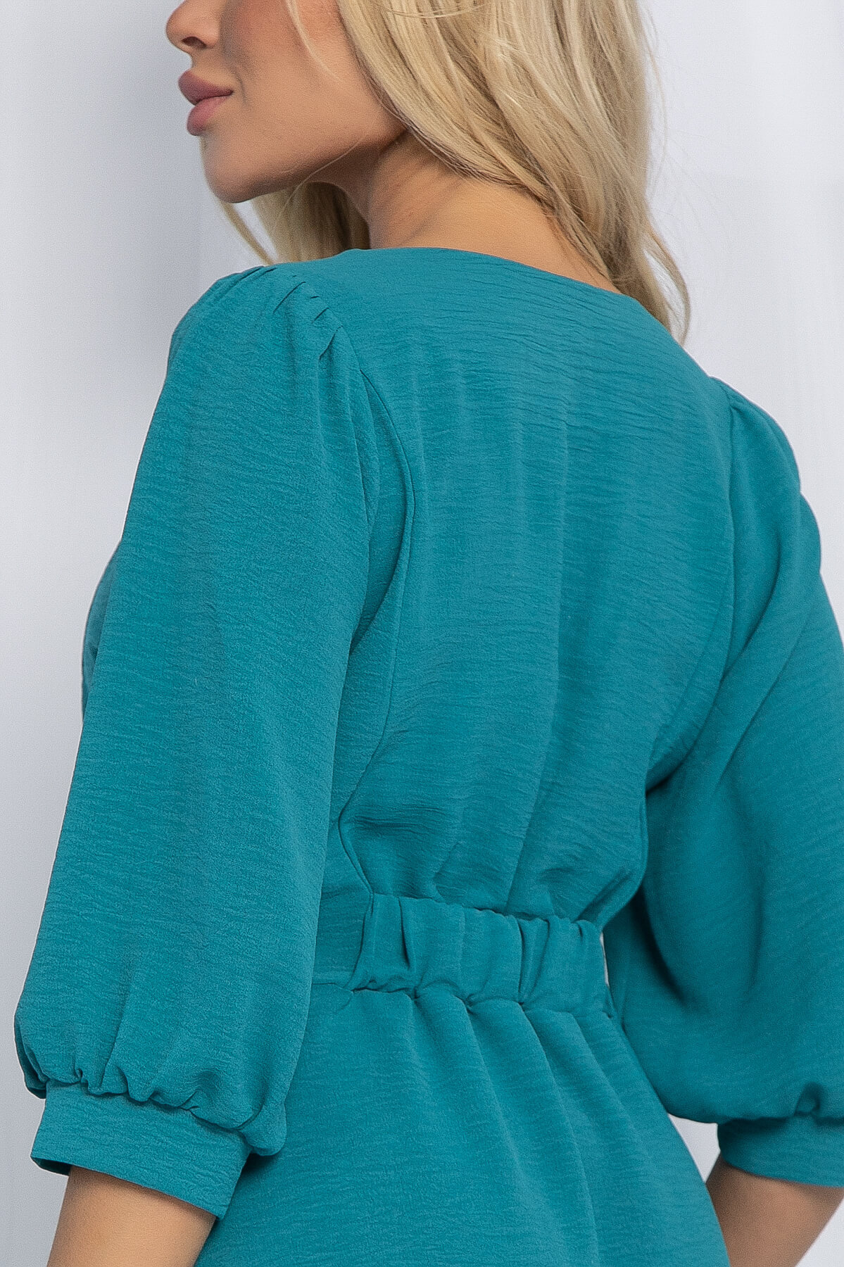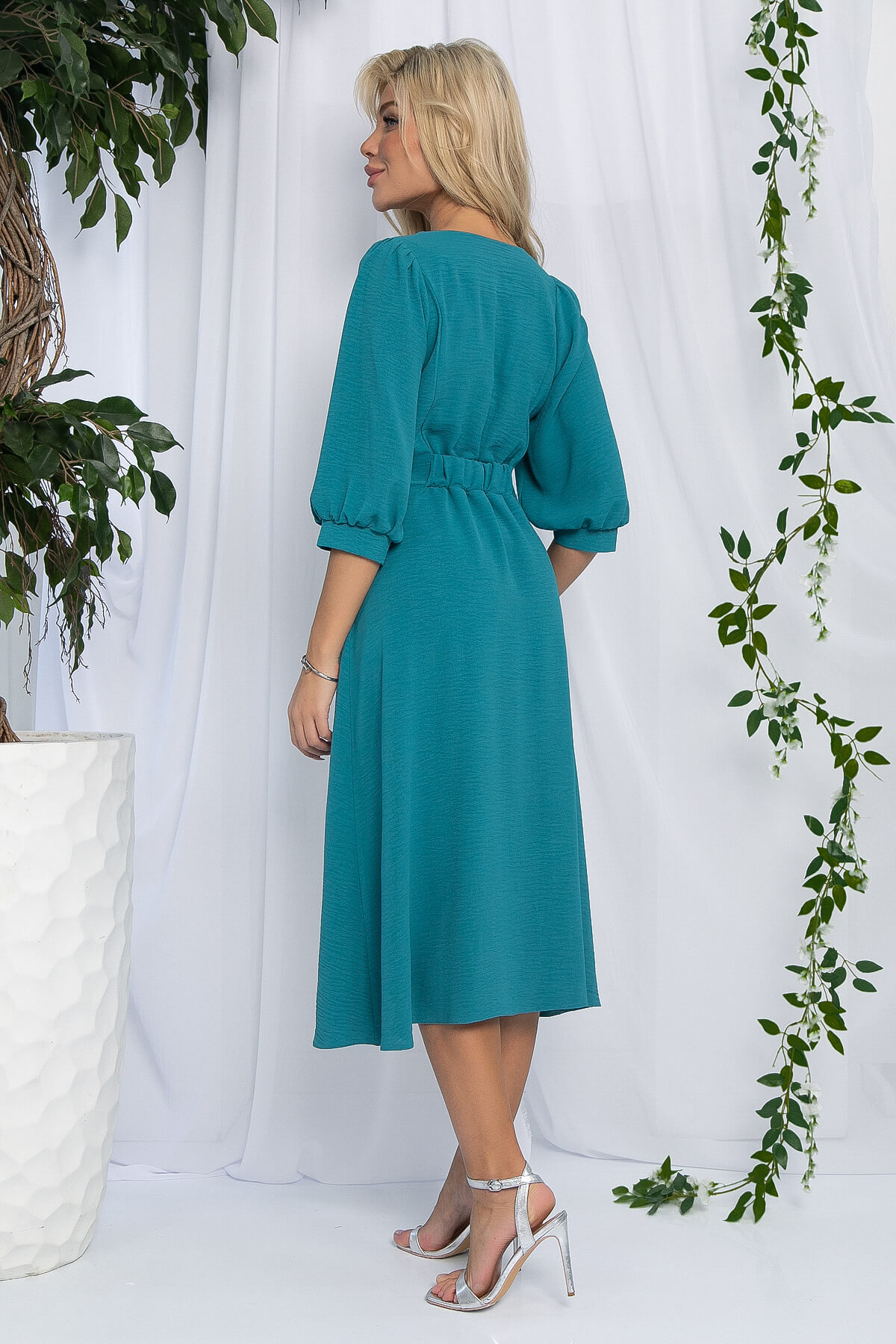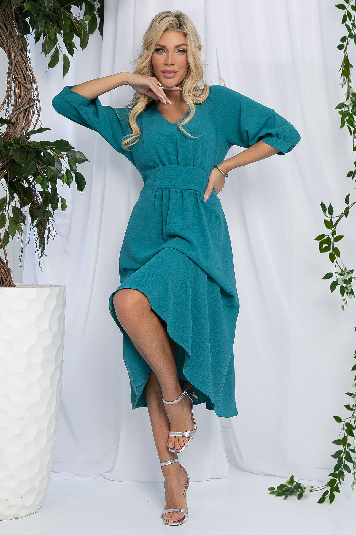 Платье средней длины с приталенным силуэтом станет настоящим украшением вашего гардероба! Благодаря отрезной линии талии оно подчёркивает фигуру, а расклешенная юбка придаёт образу лёгкость и женственность. Рукав-реглан средней длины на сборке завершается изящным манжетом, что делает платье ещё более утончённым. V-образная горловина добавляет в образ нотку изящества. Спереди платье украшено декоративным элементом в виде сборки, которую аккуратно закрывает втачной пояс. Сзади пояс аналогичный и собран на широкую резинку.
