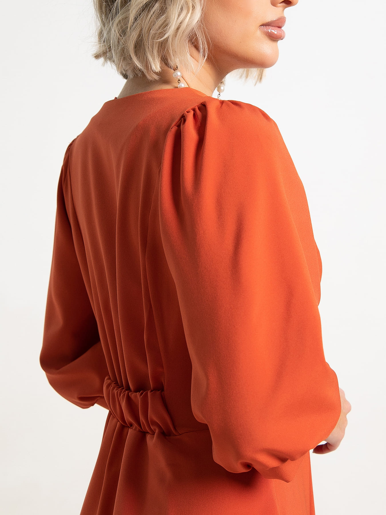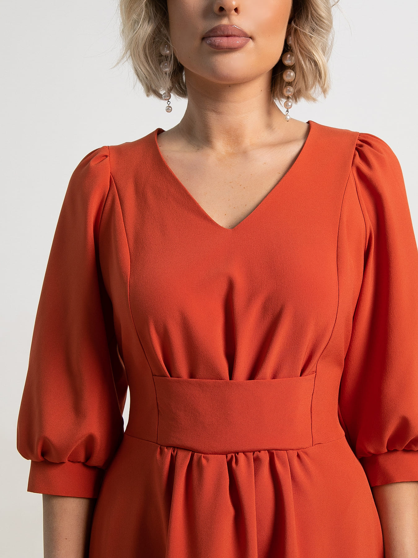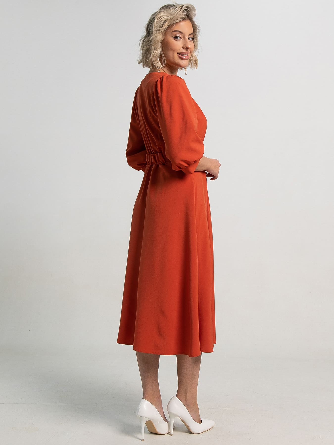 Платье средней длины с приталенным силуэтом станет настоящим украшением вашего гардероба! Благодаря отрезной линии талии оно подчёркивает фигуру, а расклешенная юбка придаёт образу лёгкость и женственность. Рукав-реглан средней длины на сборке завершается изящным манжетом, что делает платье ещё более утончённым. V-образная горловина добавляет в образ нотку изящества. Спереди платье украшено декоративным элементом в виде сборки, которую аккуратно закрывает втачной пояс. Сзади пояс аналогичный и собран на широкую резинку.