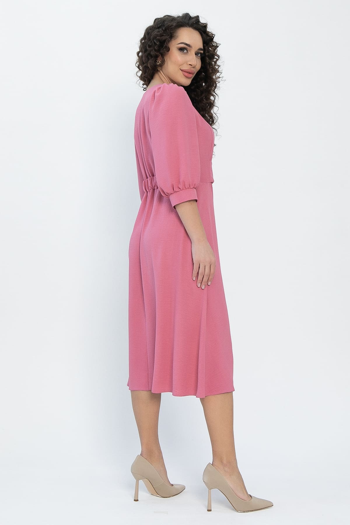 Платье средней длины с приталенным силуэтом станет настоящим украшением вашего гардероба! Благодаря отрезной линии талии оно подчёркивает фигуру, а расклешенная юбка придаёт образу лёгкость и женственность. Рукав-реглан средней длины на сборке завершается изящным манжетом, что делает платье ещё более утончённым. V-образная горловина добавляет в образ нотку изящества. Спереди платье украшено декоративным элементом в виде сборки, которую аккуратно закрывает втачной пояс. Сзади пояс аналогичный и собран на широкую резинку.