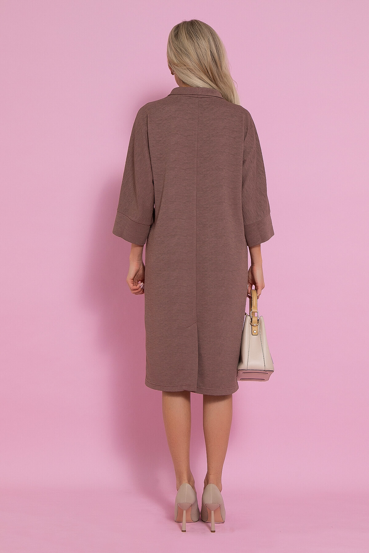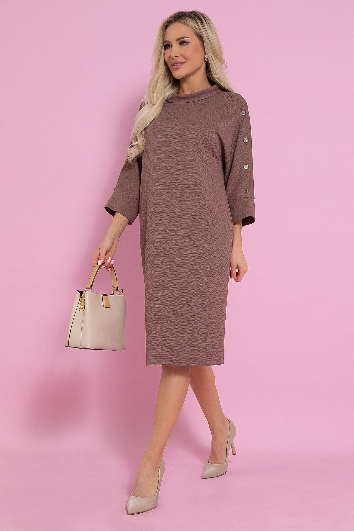 Платье прямого кроя будет уместно как для повседневных выходов, так и для особых случаев! Модель оснащена цельнокроеными рукавами на манжете, длина которых составляет три четверти. Небольшой воротник-хомут дополняет образ, придавая платью изысканный шарм. Декоративные пуговицы, расположенные на линии одного плеча, подчеркивают внимание к деталям, а текстурированная ткань создает интересный визуальный эффект.