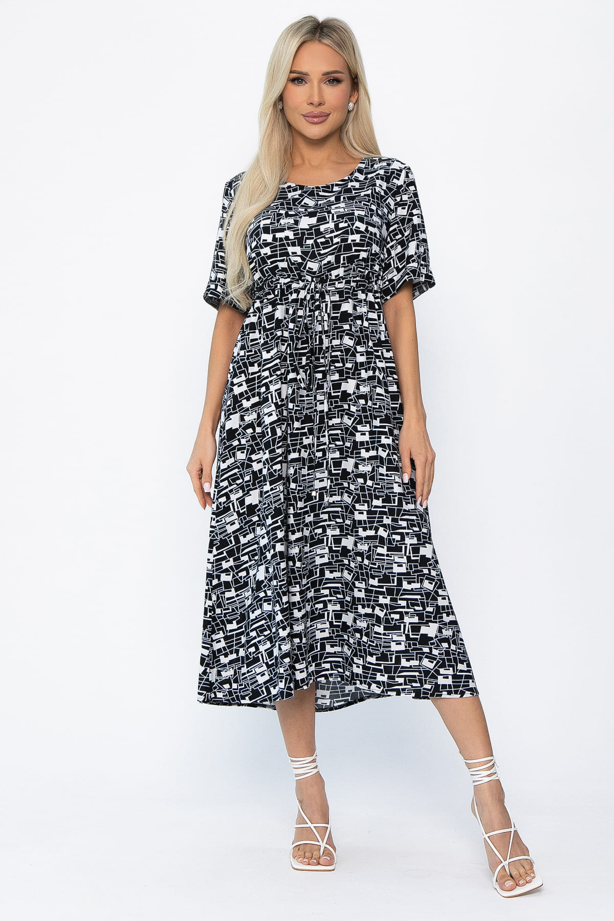 Платье свободного кроя в черно-белой расцветке станет незаменимым предметом вашего летнего гардероба. Оно сочетает в себе легкость, практичность и стиль. Короткий рукав с аккуратной манжетой придает образу особый шарм, а округлый вырез горловины делает шею визуально длиннее. Завышенная линия талии подчеркивает фигуру. Резинка на спине и кулиса с завязками на передней части позволяют регулировать объем. Юбка расклешенная, что придает образу легкость и женственность.