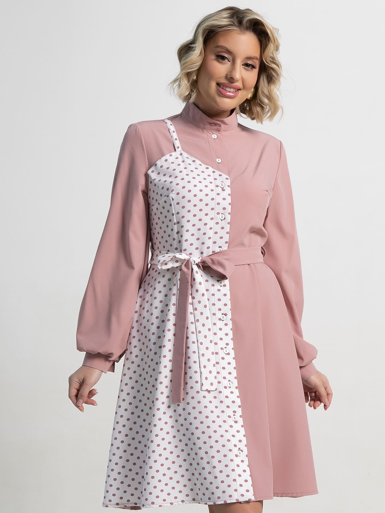 Ощутите невесомость и очарование с этим великолепным платьем, которое станет идеальным выбором для создания утонченных и женственных образов. Комбинация двух расцветок — воздушной пудровой основы и нежного розового горошка на белом фоне — создает уникальный визуальный эффект. Платье дополнено поясом из той же ткани, который входит в комплект, подчеркивая линию талии и придавая силуэту изящество.