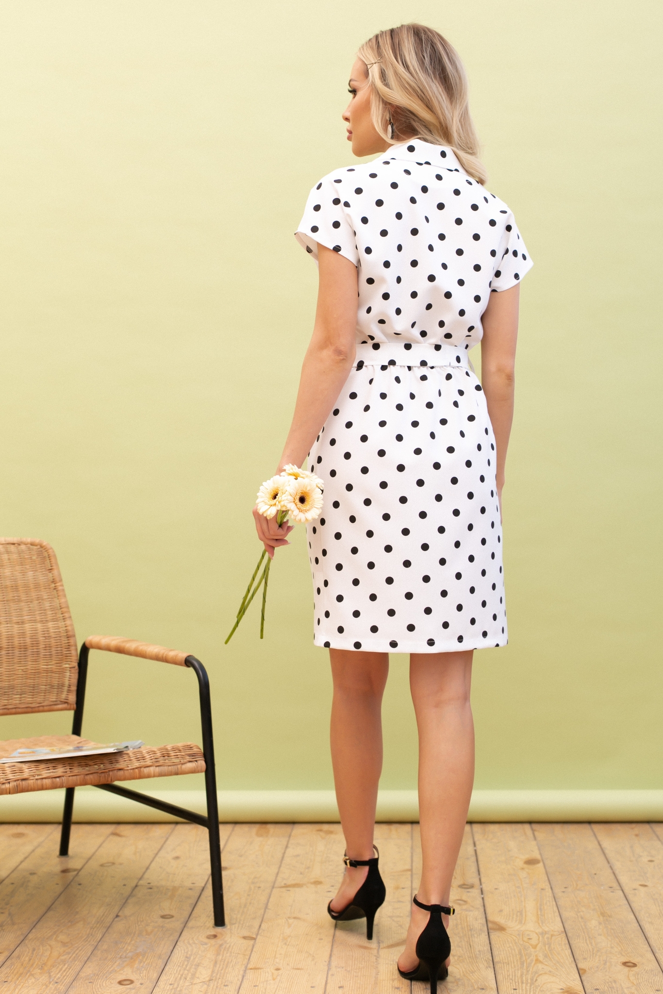 Красивое платье приталенного силуэта из натурального полотна с принтом горох. V - образная горловина оформлена отложным воротником переходящий в планку с застежкой на петли и пуговицы. Модель со спущенным плечом без рукавов. Отрезное по линии талии. По переду заложены складки. Спинка присборена на эластичную резинку. Тканевый пояс дополнительно подчеркнет линию талии.